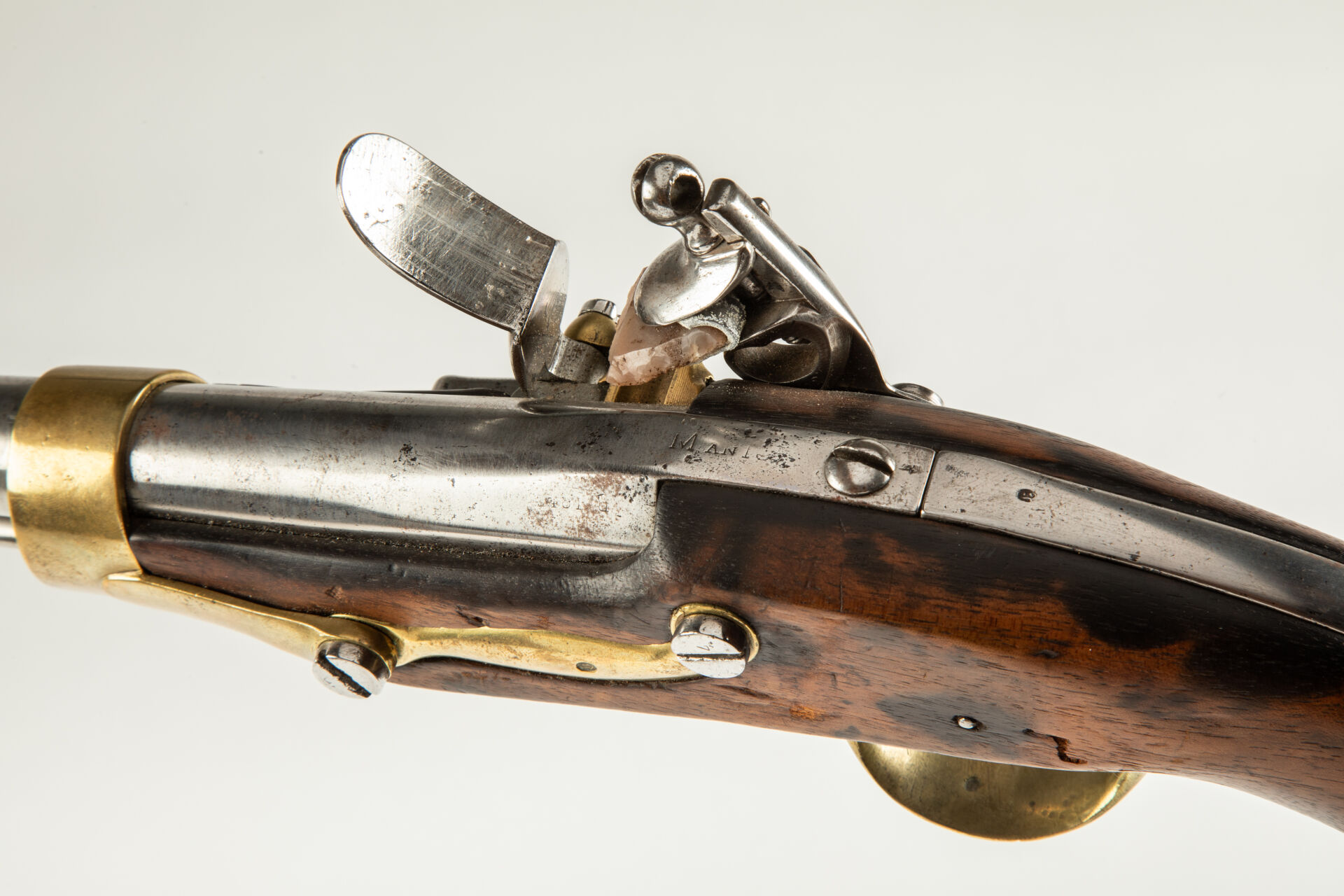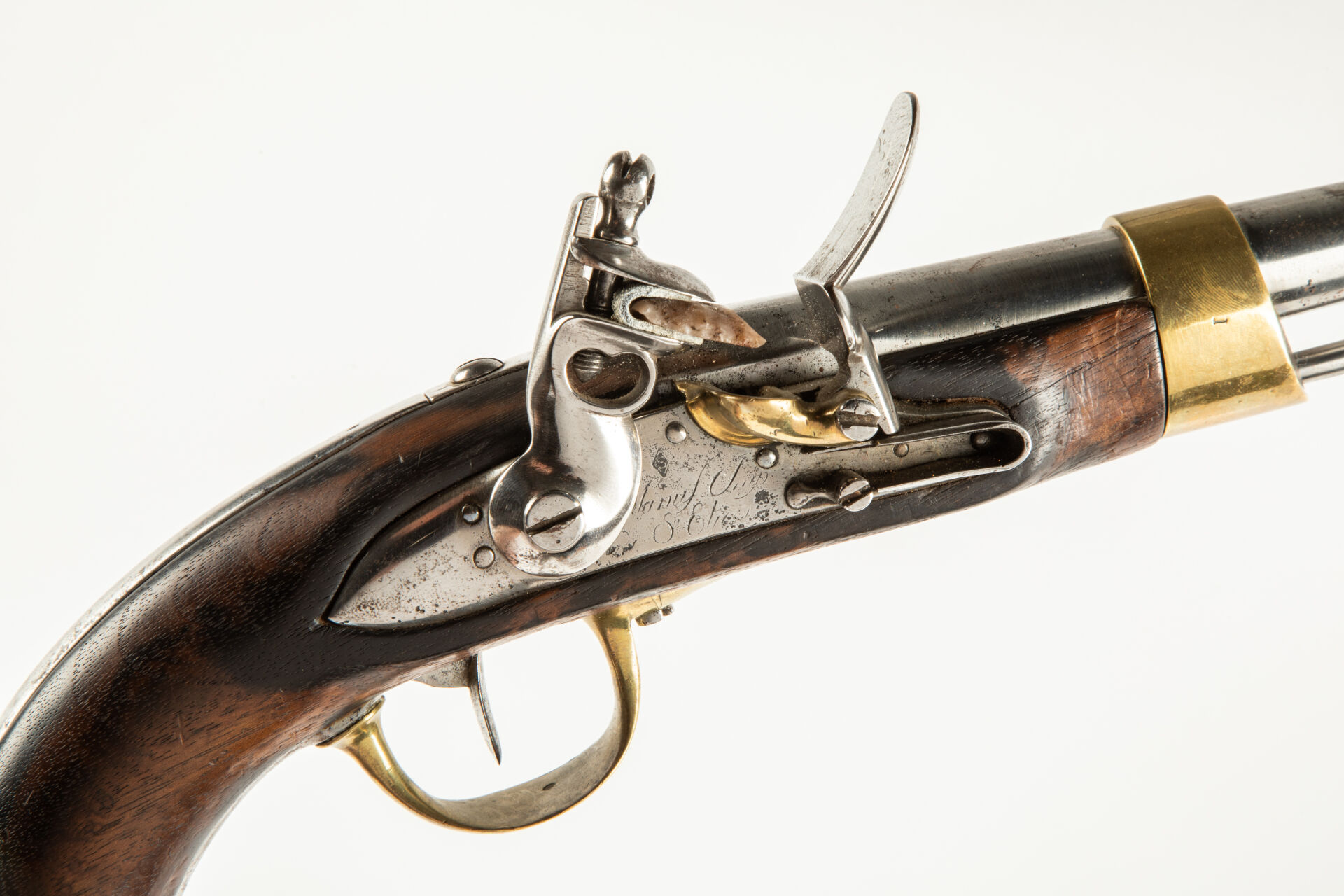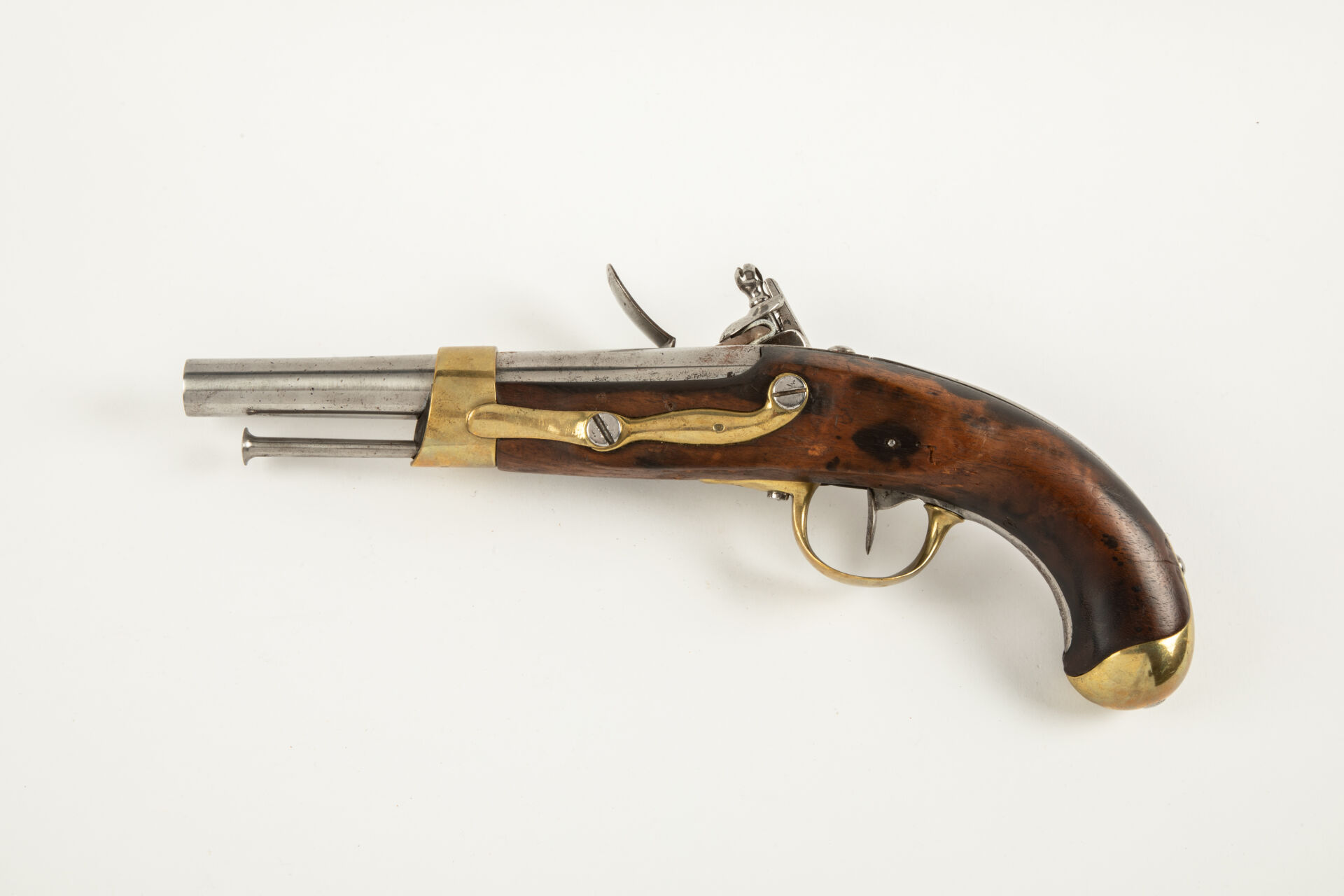 Pistolet de cavalerie règlementaire français modèle An XIII, issu de la Manufacture Impériale de Saint Etienne comme en atteste le marquage en partie visible sur le corps de platine, queue de culasse marquée « M AN XIII », date sur la canon difficilement lisible, monture ayant subi une attaque d’insectes xylophages sans gravité au niveau de la contre-plaine, bois noirci par endroits, pas de fèls, mécanisme fonctionnel avec baguette.