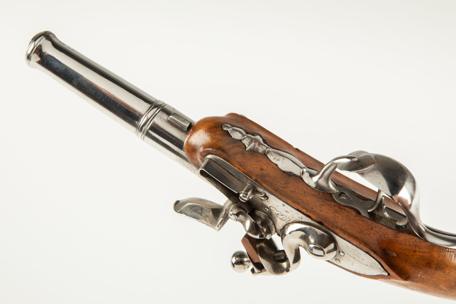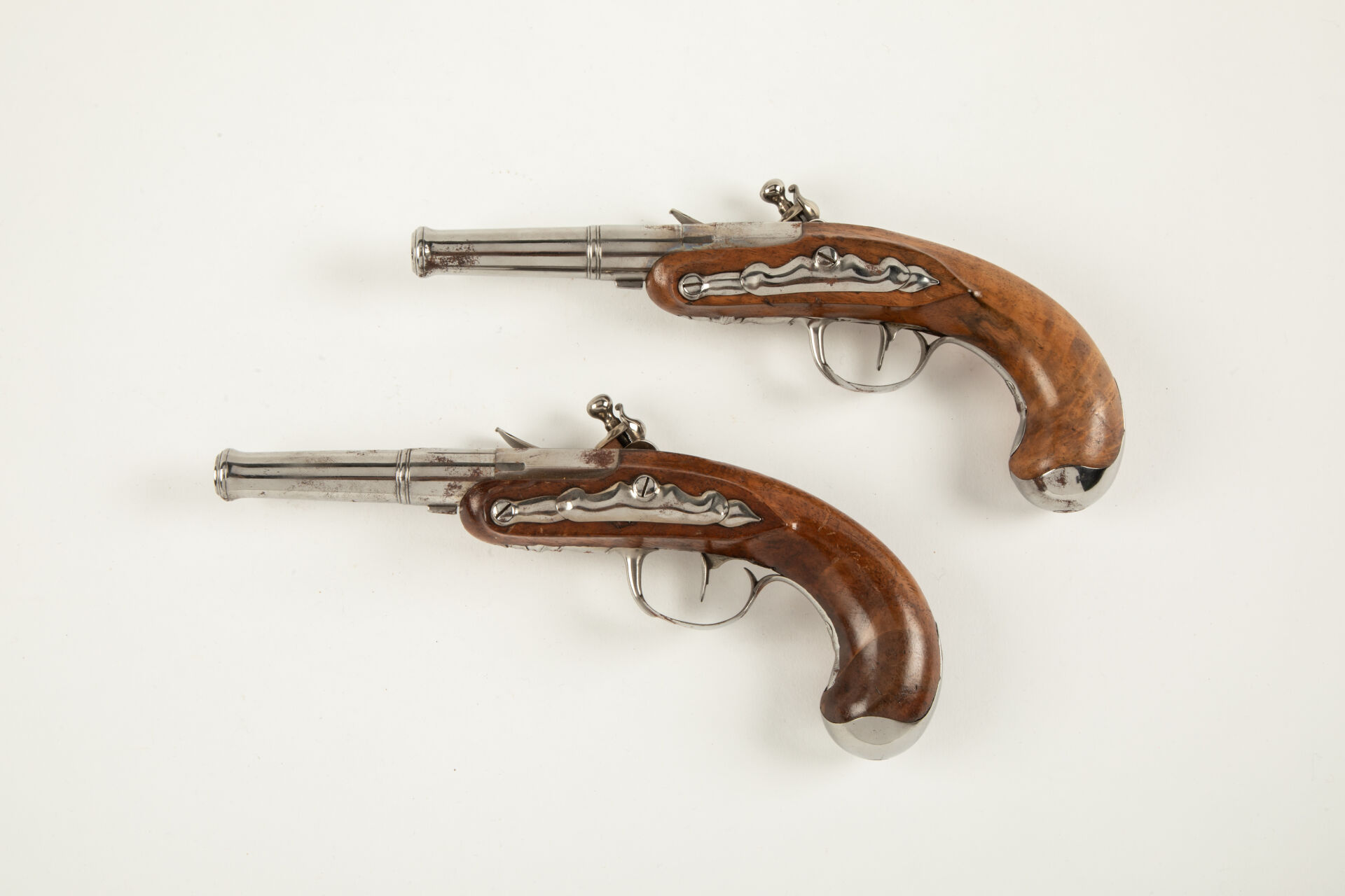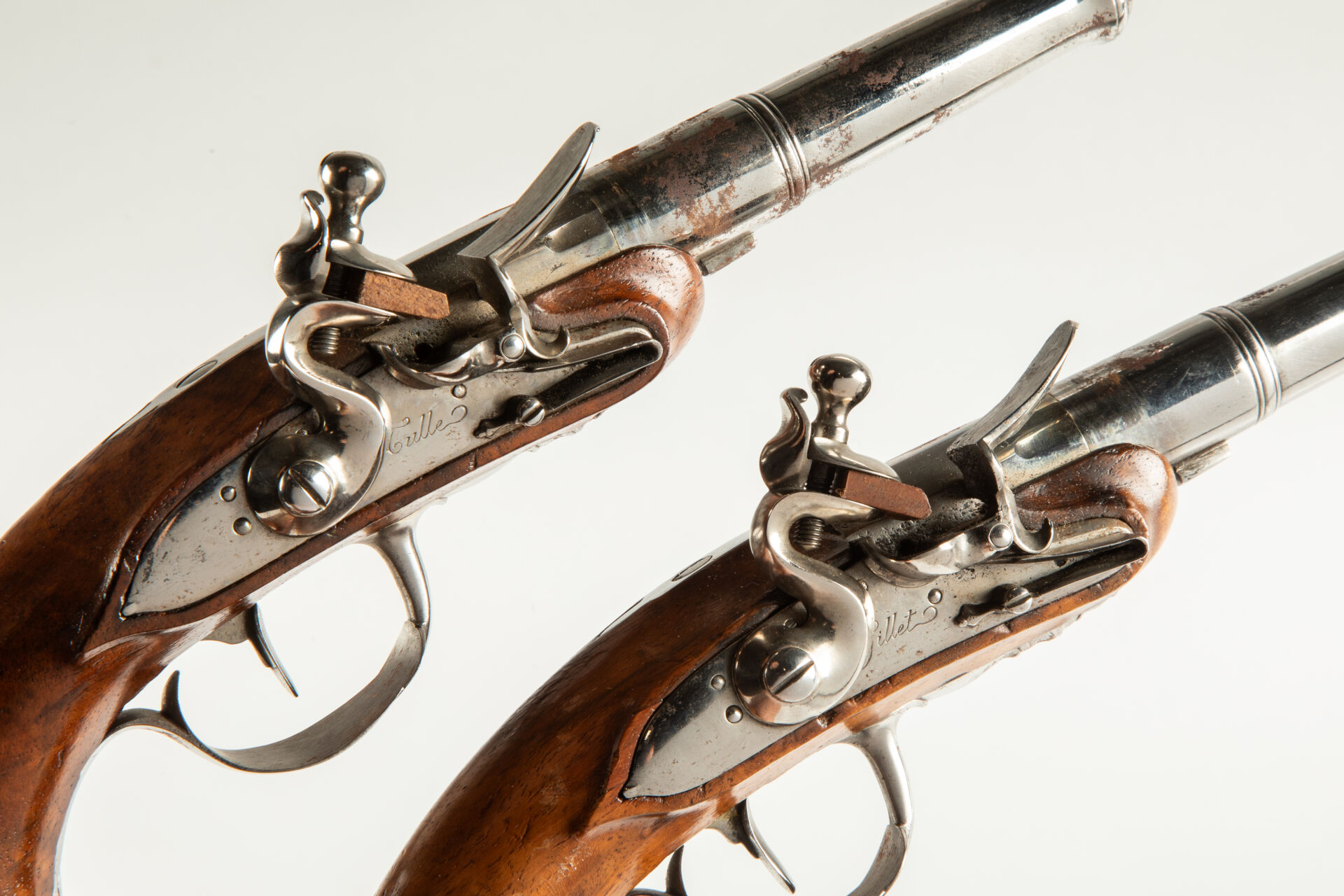 Belle paire de pistolets de demi-arçon époque Louis XV par « Gillet à Tulle », canons à balles forcées démontables lisses au calibre de 40 balles à la livre, bouche renforcée, carré de démontage sur le flanc inférieur, corps de platine rond portant la signature « Gillet » pour l’un et « Tulle » pour l’autre, chien col de cygne, bassinet fer, arme montée fer, belle monture en noyer blond vernis. Très belle paire de pistolets dans un état de fraicheur remarquable, la signature de cet armurier de Tulle fait raisonnablement penser à un usage dans la Marine, mécanismes fonctionnels.