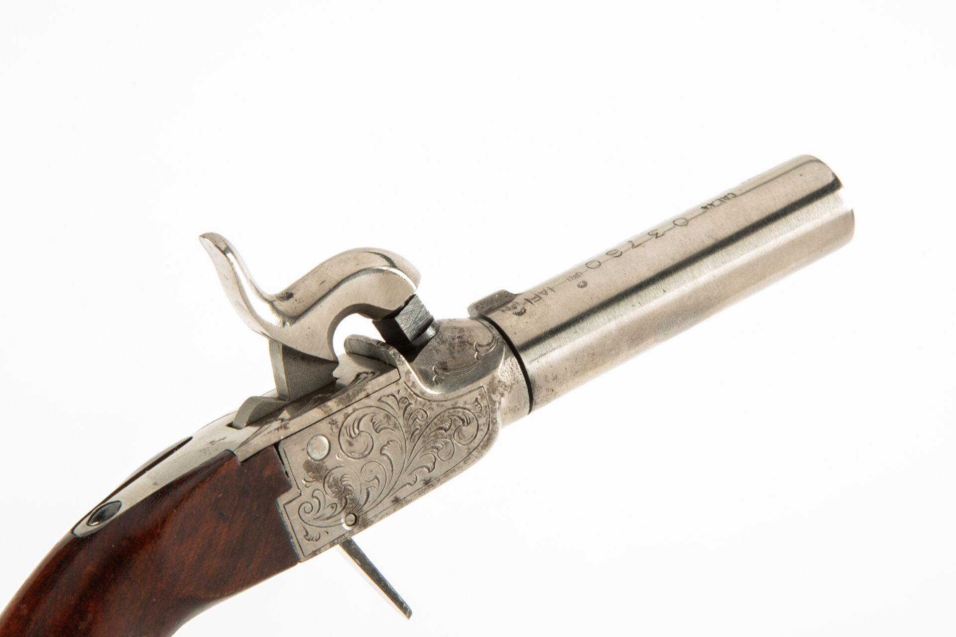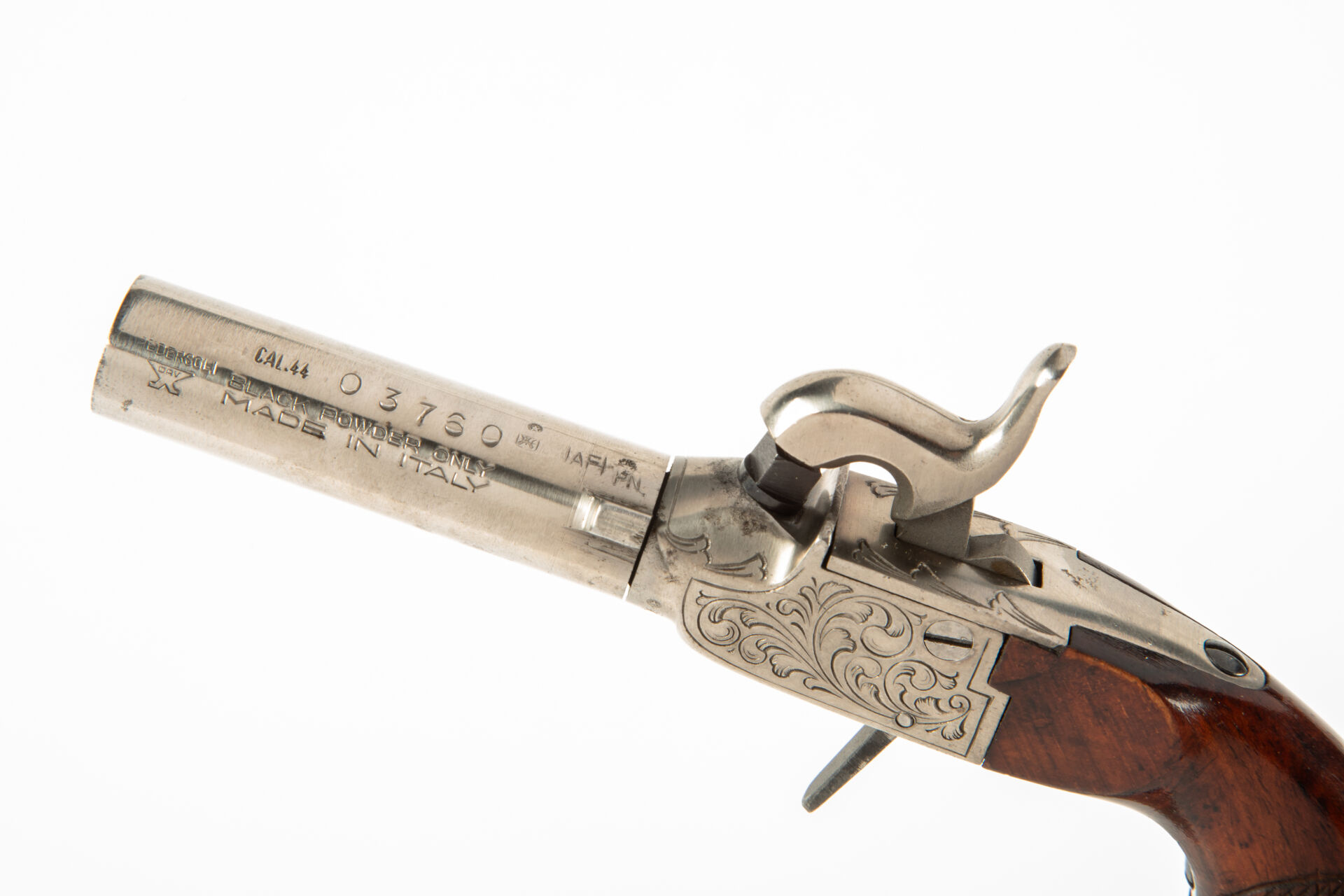 Réplique moderne d’un pistolet à coffre et à percussion, canon rond dévissable lisse au calibre 44, détente repliable, chien à coffre, ensemble poli blanc, nombreux marquages sous le canon, crosse ronde en noyer verni quadrillé,
