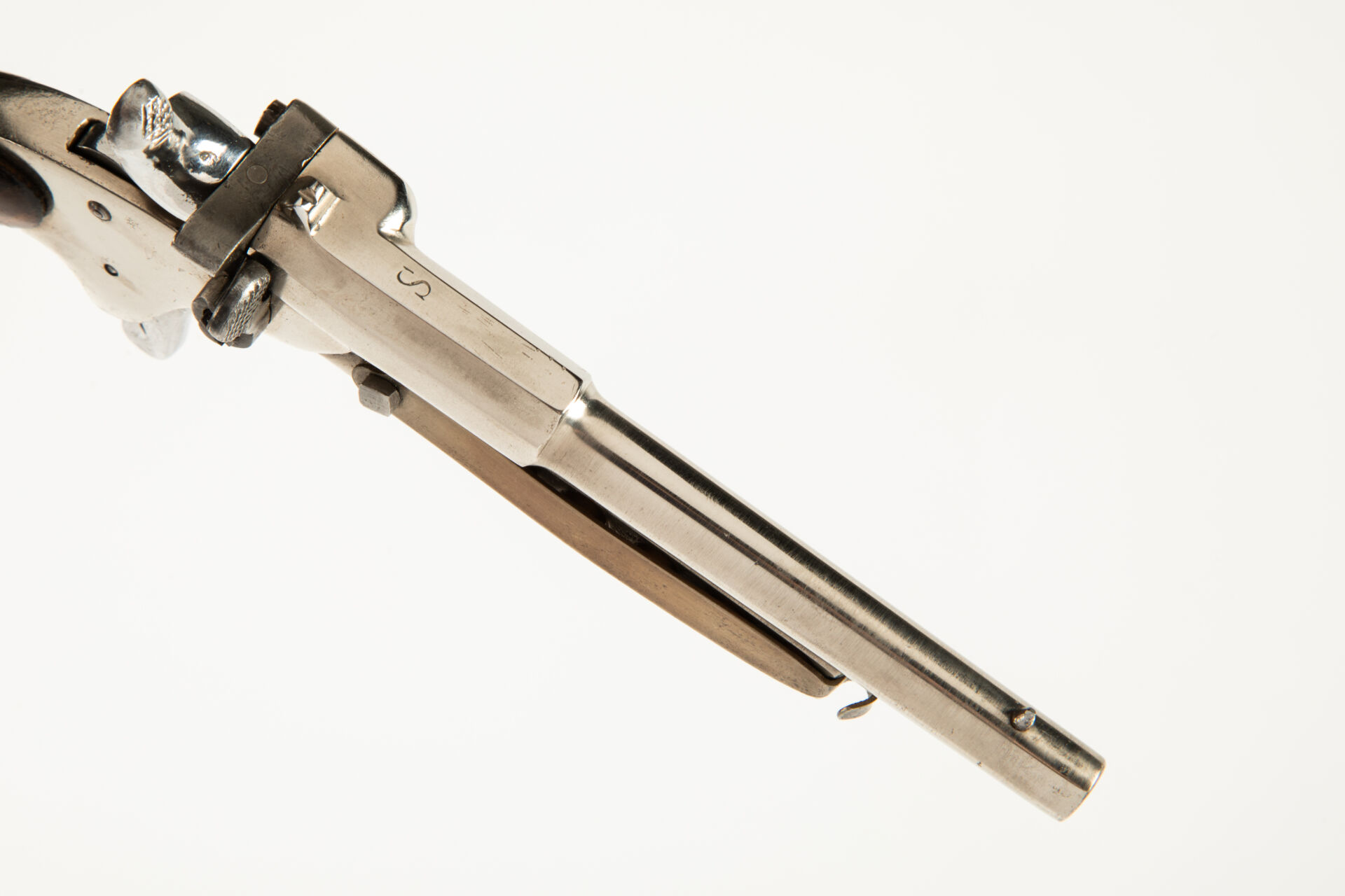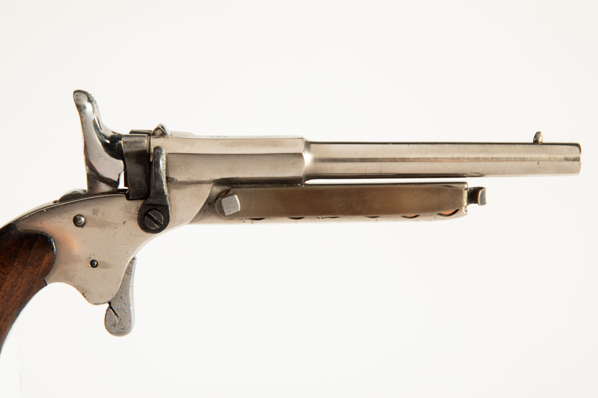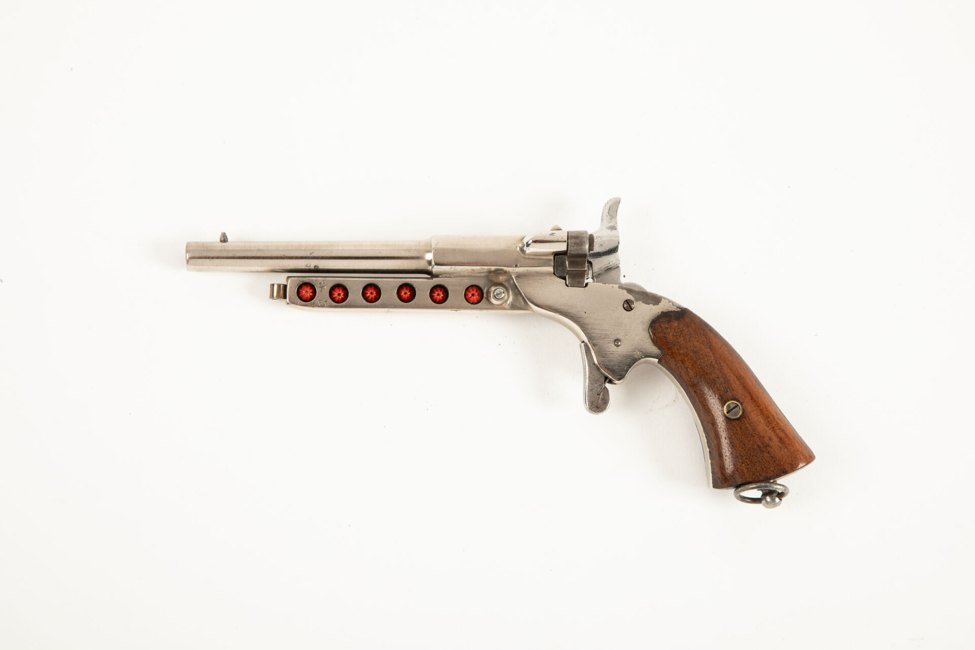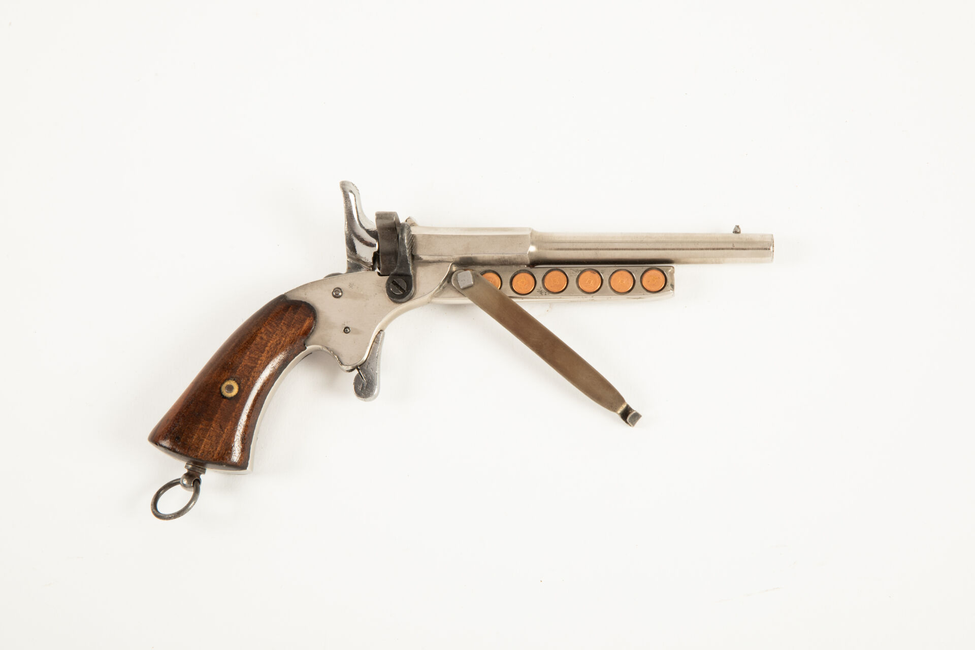 Très rare pistolet de cycliste à réserve de munitions, arme à un coup, culasse pivotante, extracteur à oreille, détente mexicaine, chien à coffre, canon octogonal puis rond lisse, deux plaquettes en noyer vernis, anneau de calotte, une curieuse réserve de cartouches à blanc longitudinale comptant six logements est disposée sous le canon et se verrouille par une lame ressort pivotante (peut être postérieure). Mécanisme fonctionnel.