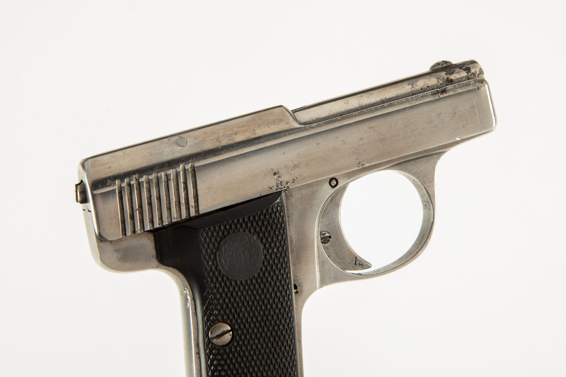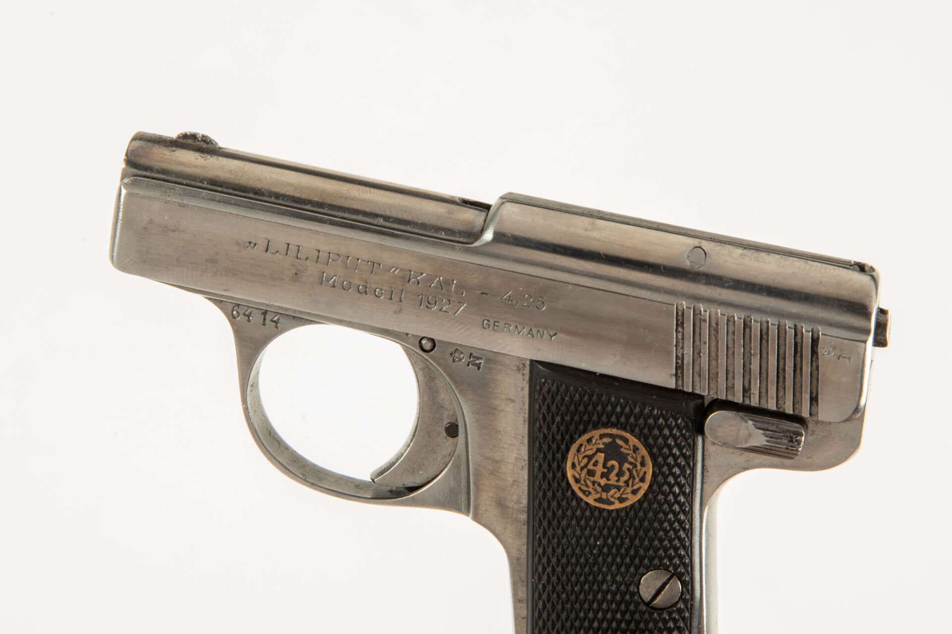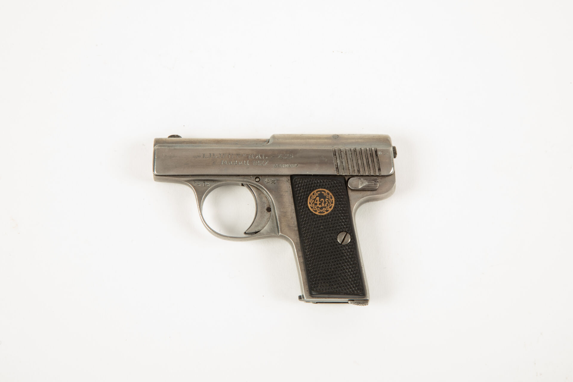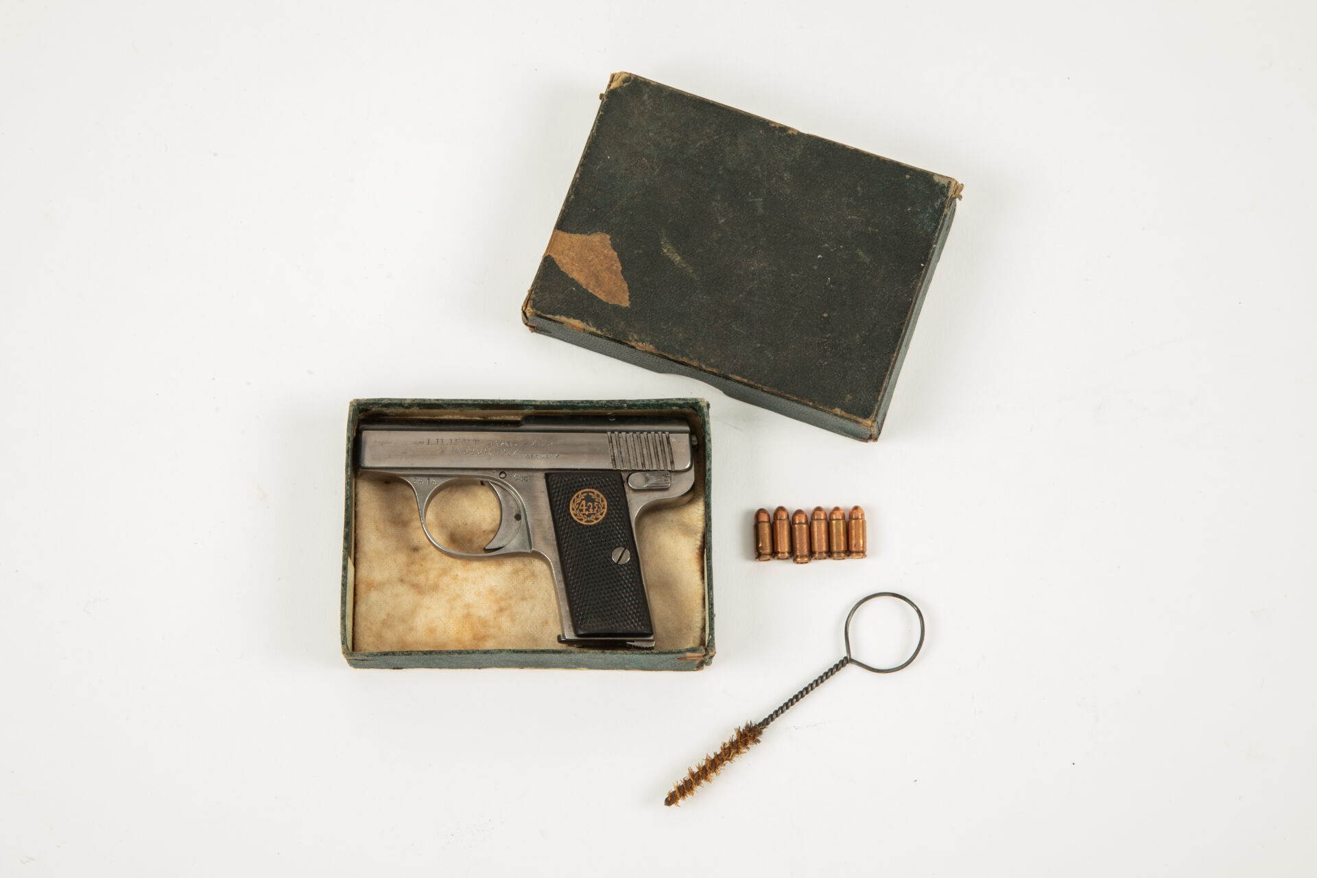 Intéressant petit pistolet semi-automatique Liliput calibre 4,25 Liliput modèle 1927, arme polie blanc, bronzage absent, acier non piqué, plaquette en bakélite noire quadrillées, arme livrée dans sa boite d’origine en carton vert bronze contenant la baguette et 6 cartouches d’origine, mécanisme fonctionnel