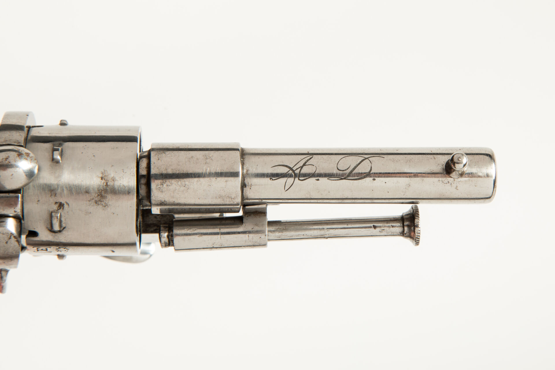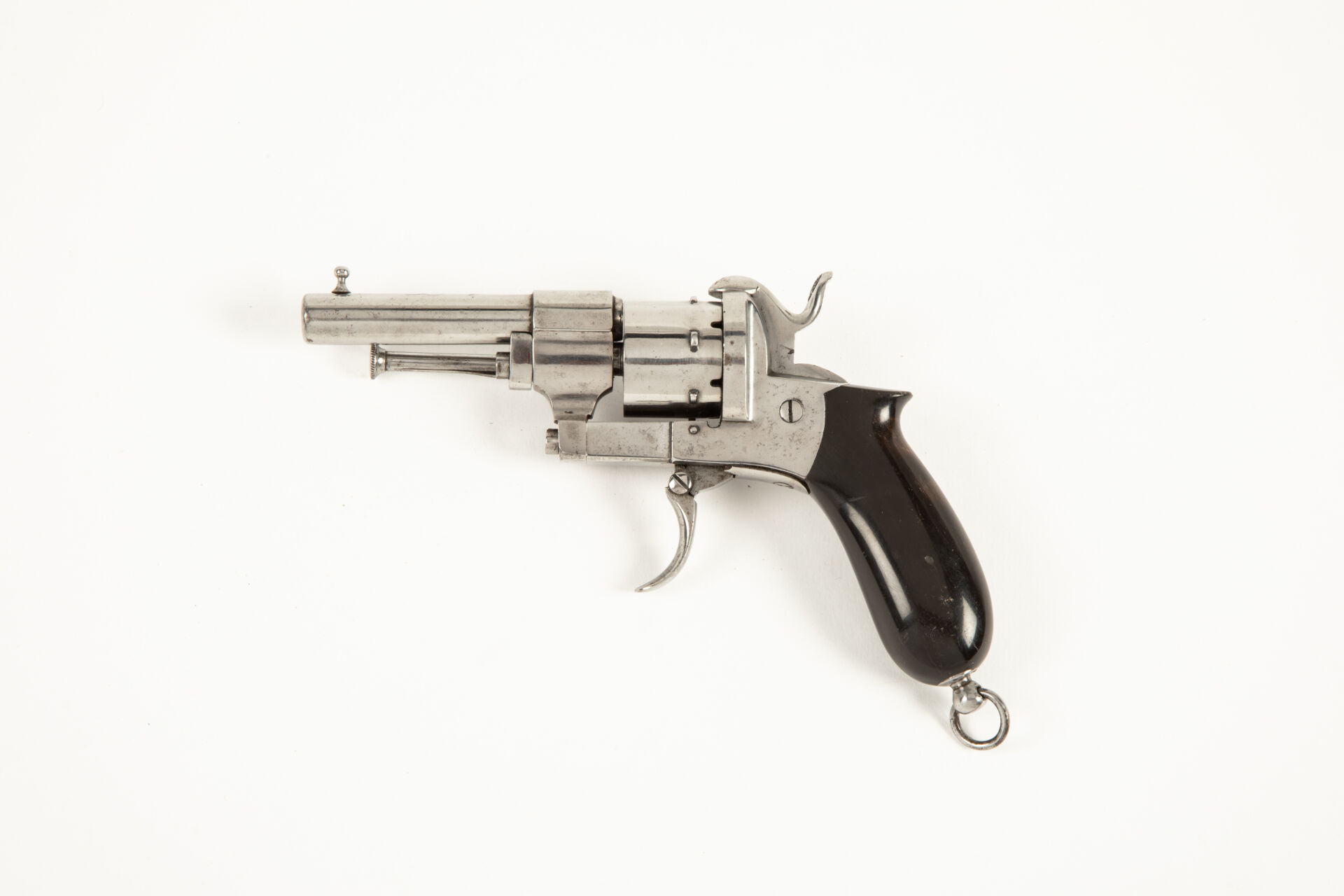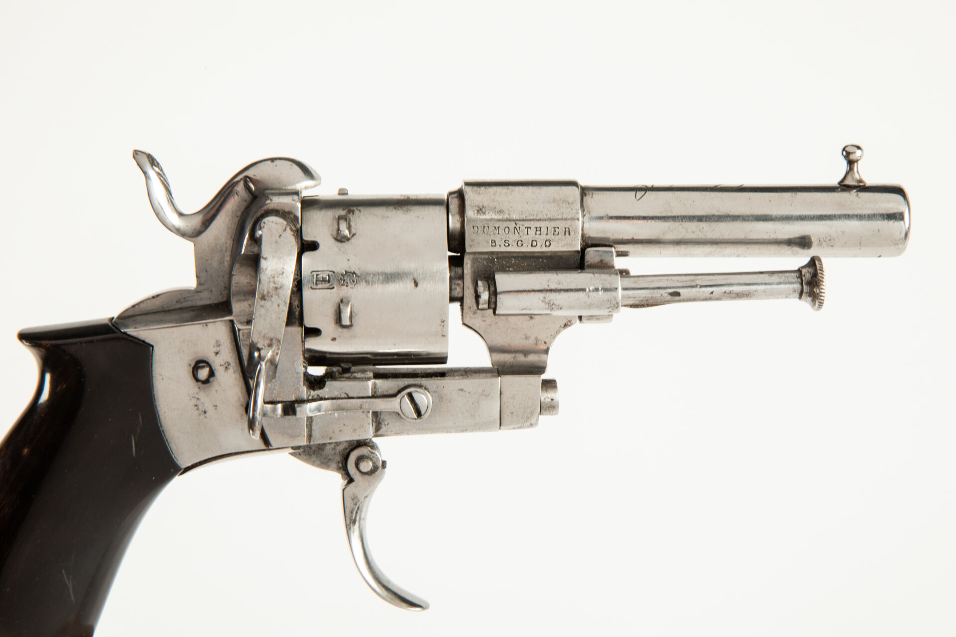 Révolver 7 mm à broche, système Dumonthier BSGDG comme en atteste le marquage sur le tonnerre à droite du canon, mécanisme simple et double action, barillet lisse, canon rond portant deux initiales sur le sommet, portière basculant vers l’arrière, le basculement de la portière et le maintien en position ouverte induit le débrayage du chien, baguette ejectrice vissée sur la console du canon, détente repliable, crosse en corne noire polie, anneau de calotte, arme polie blanc. Mécanisme fonctionnel.