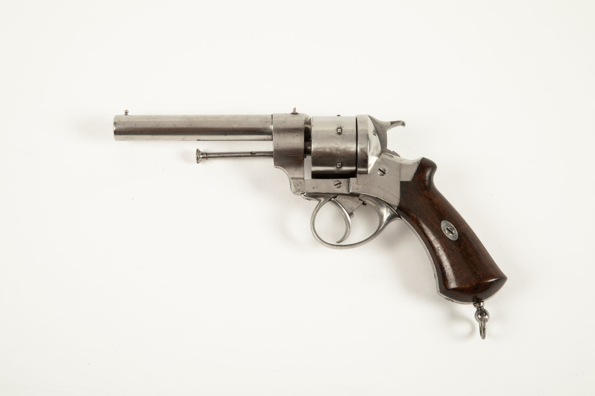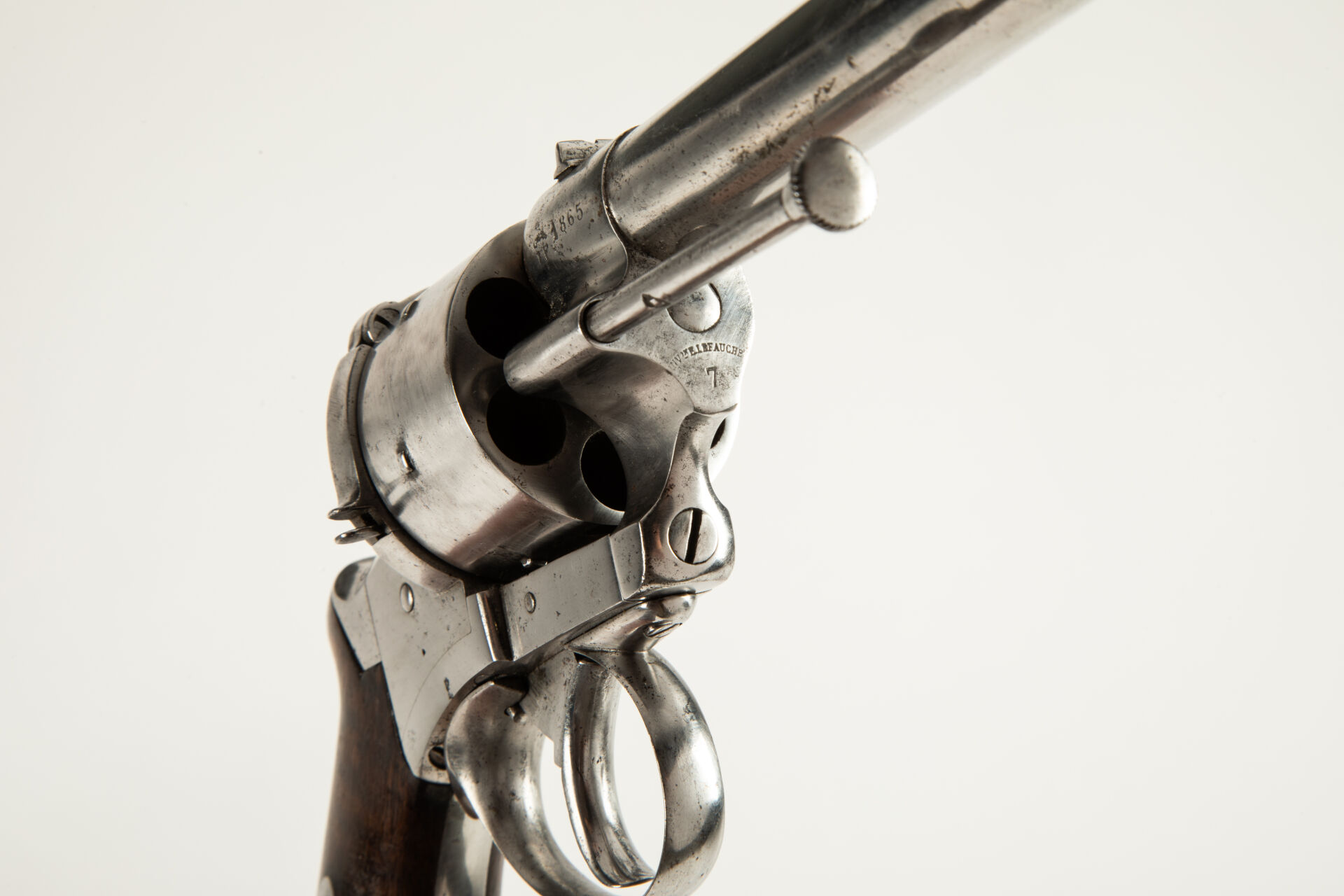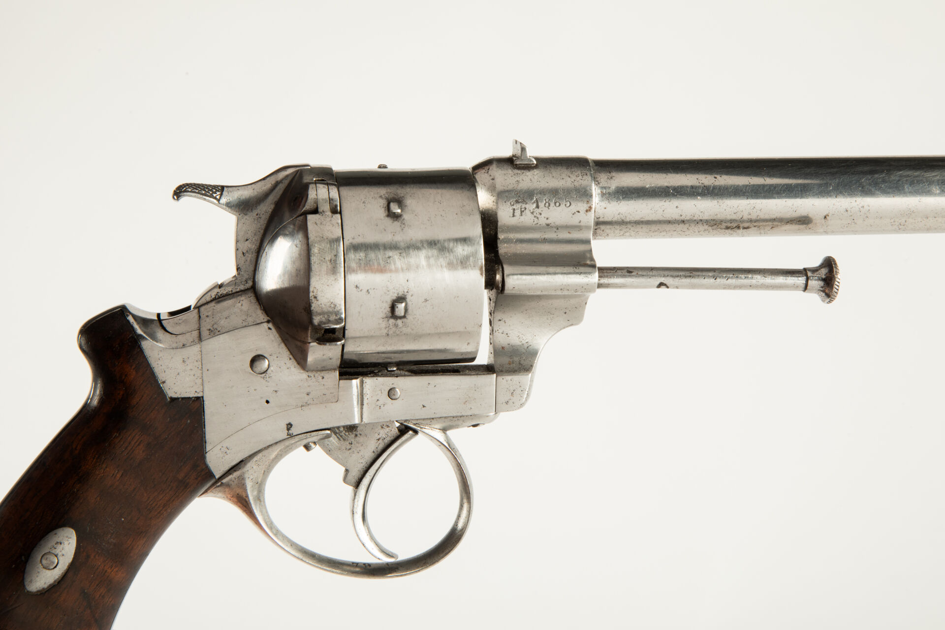Révolver Lefaucheux « triple action » à percussion centrale, cadre ouvert, calibre 12 mm Perrin, barillet lisse. Evolution du modèle 1862 à broche, opposé au révolver Perrin lors des essais militaires français de 1867 à 1869, la console du canon sur sa droite porte le signe Lefaucheux et la date 1865, canon rond portant hausse sur queue d’aronde et guidon, portière de chargement à droite, pontet rond, chien à crête horizontale et percussion centrale, baguette éjectrice à droite, pontet rond, deux plaquettes en noyer vernis, anneau de calotte. Mécanisme fonctionnel, arme repolie blanc, infimes piqures au niveau du marquage.