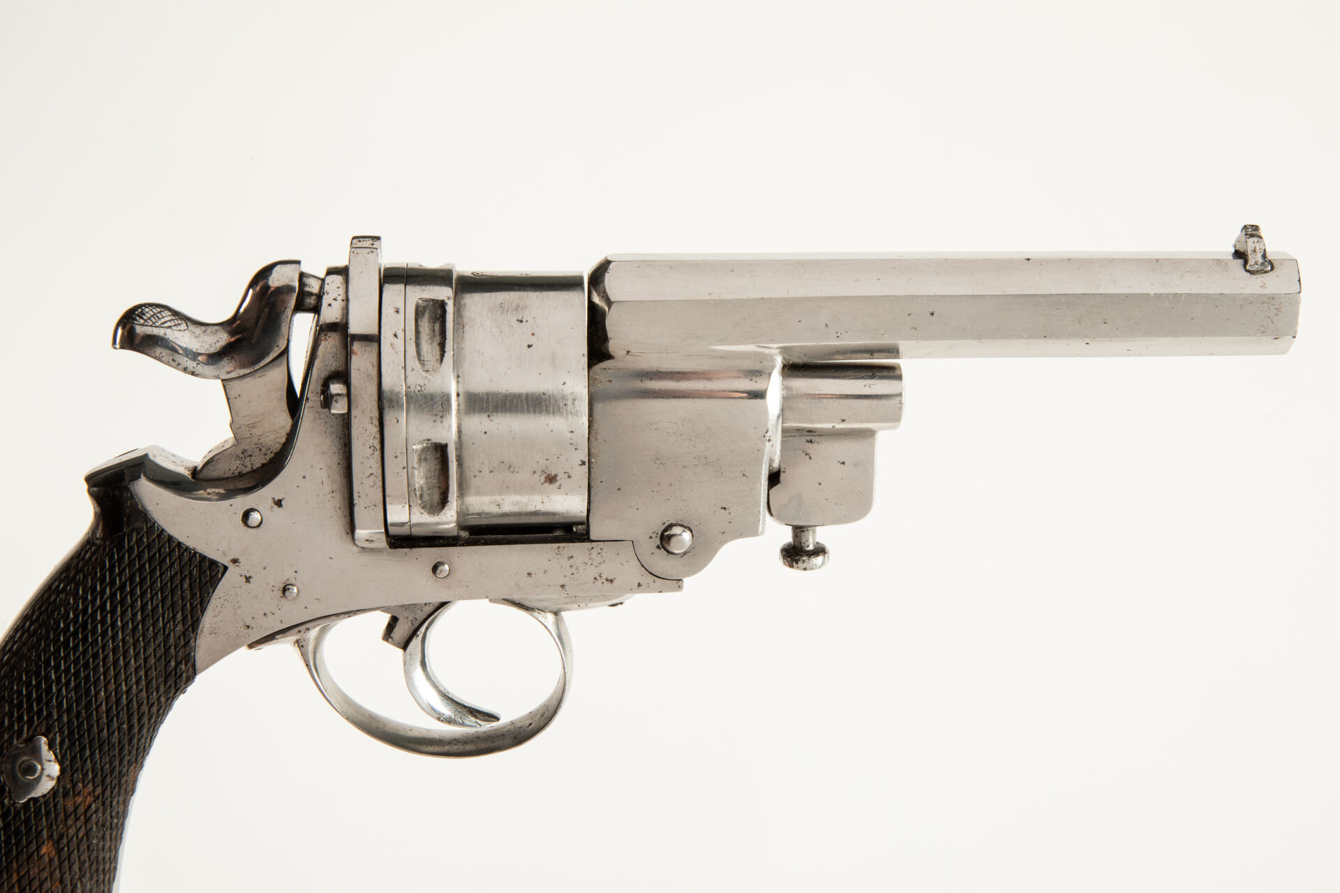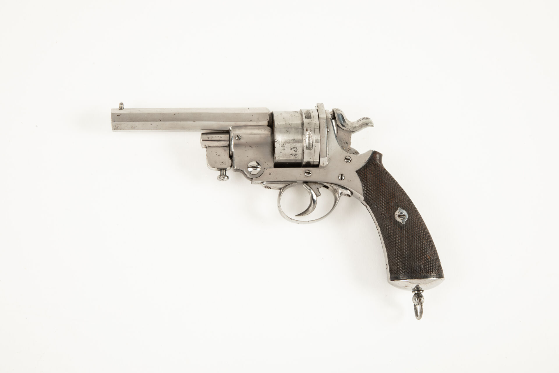 Joli révolver à système, fabrication belge, calibre 12 mm Galand, canon octogonal, guidon sur queue d’aronde, un mécanisme placé sous le canon permet de déverrouiller ce dernier en pivotant d’un quart de tour et de basculer le canon, le basculant du canon agissant sur un disque extracteur collectif, cadre ouvert, mécanisme simple et double action, barillet lisse, plaquettes de crosse en noyer quadrillé, anneau de calotte, mécanisme fonctionnel, arme polie blanc vierge de marquages