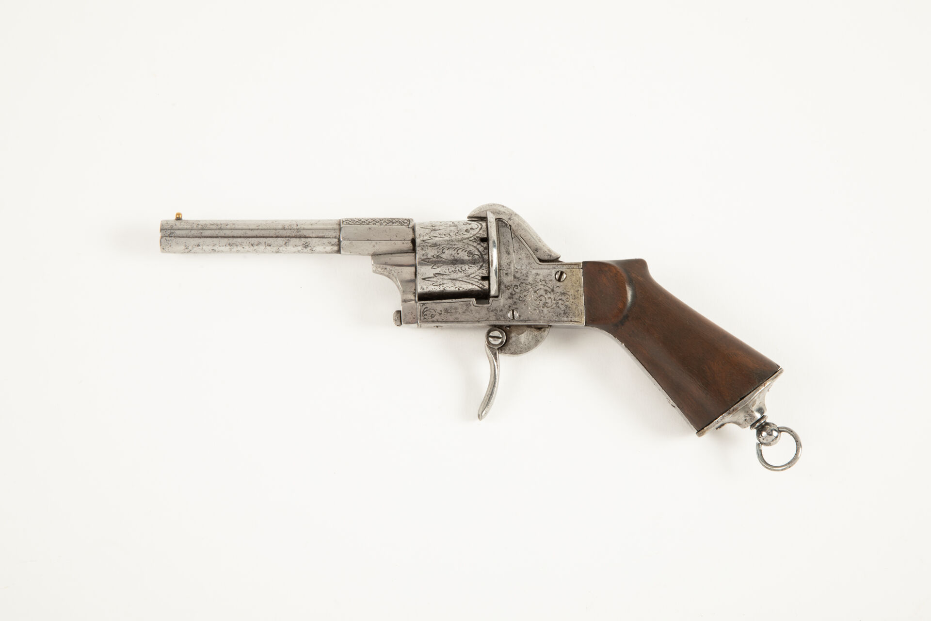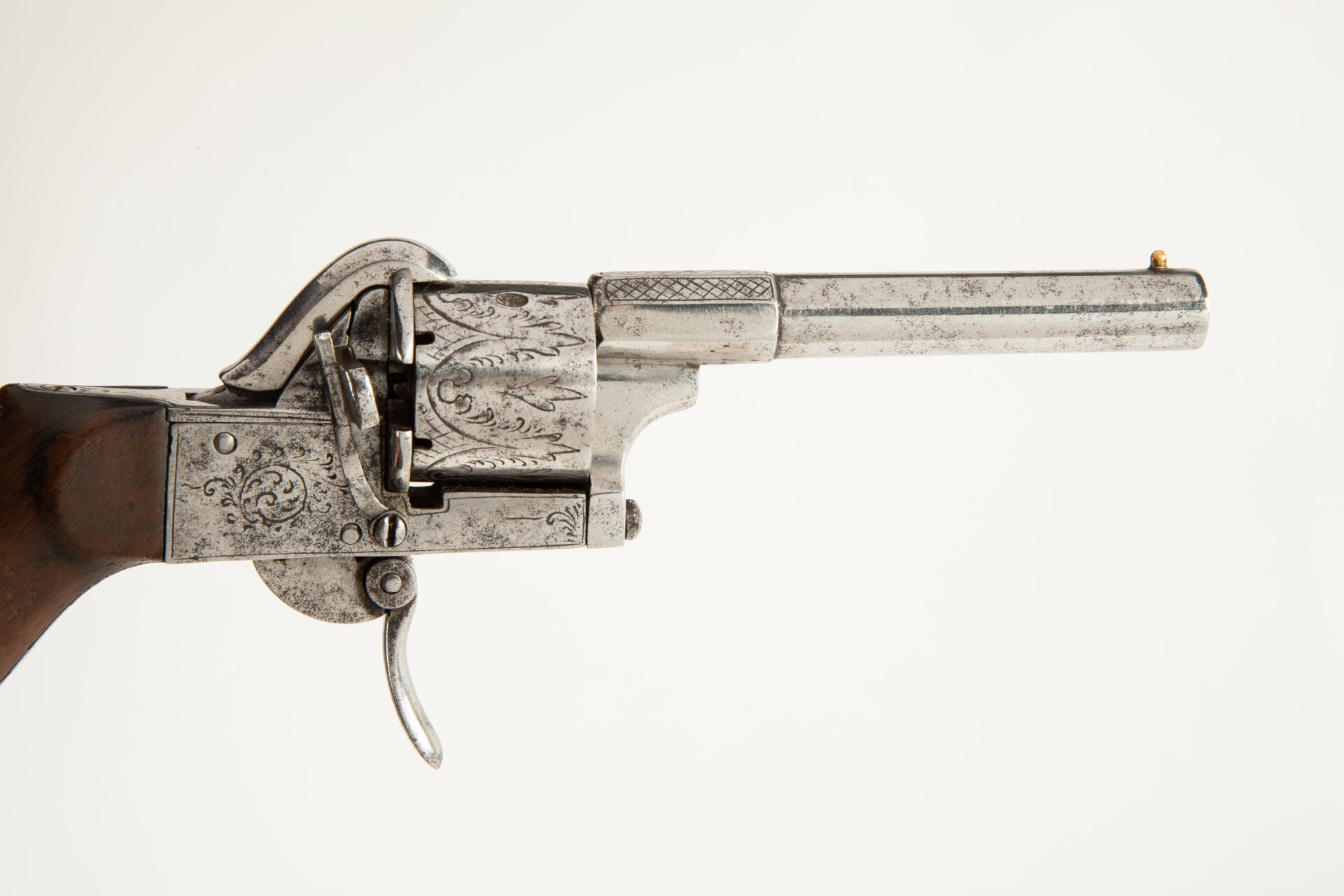 Révolver à broche, système Michalon, modèle tardif, canon rond octogonal au départ, pied du canon vissé sur la carcasse, barillet cylindrique, calibre 7 mm à broche, gravure florale, poinçon de Liège, chien double action, détente repliable, portière pivotant vers l’arrière commandée par un ressort un peu faible, crosse en noyer vernis, calotte à diamant avec anneau de calotte, mécanisme fonctionnel, arme polie blanc.