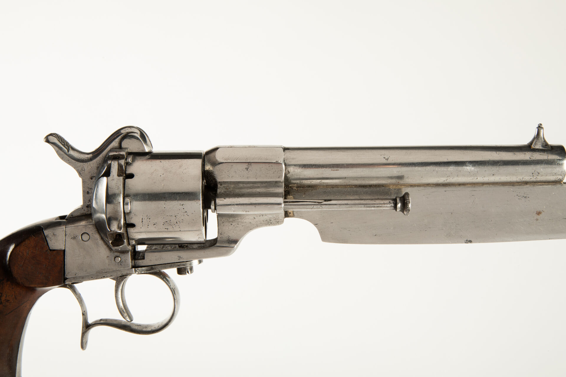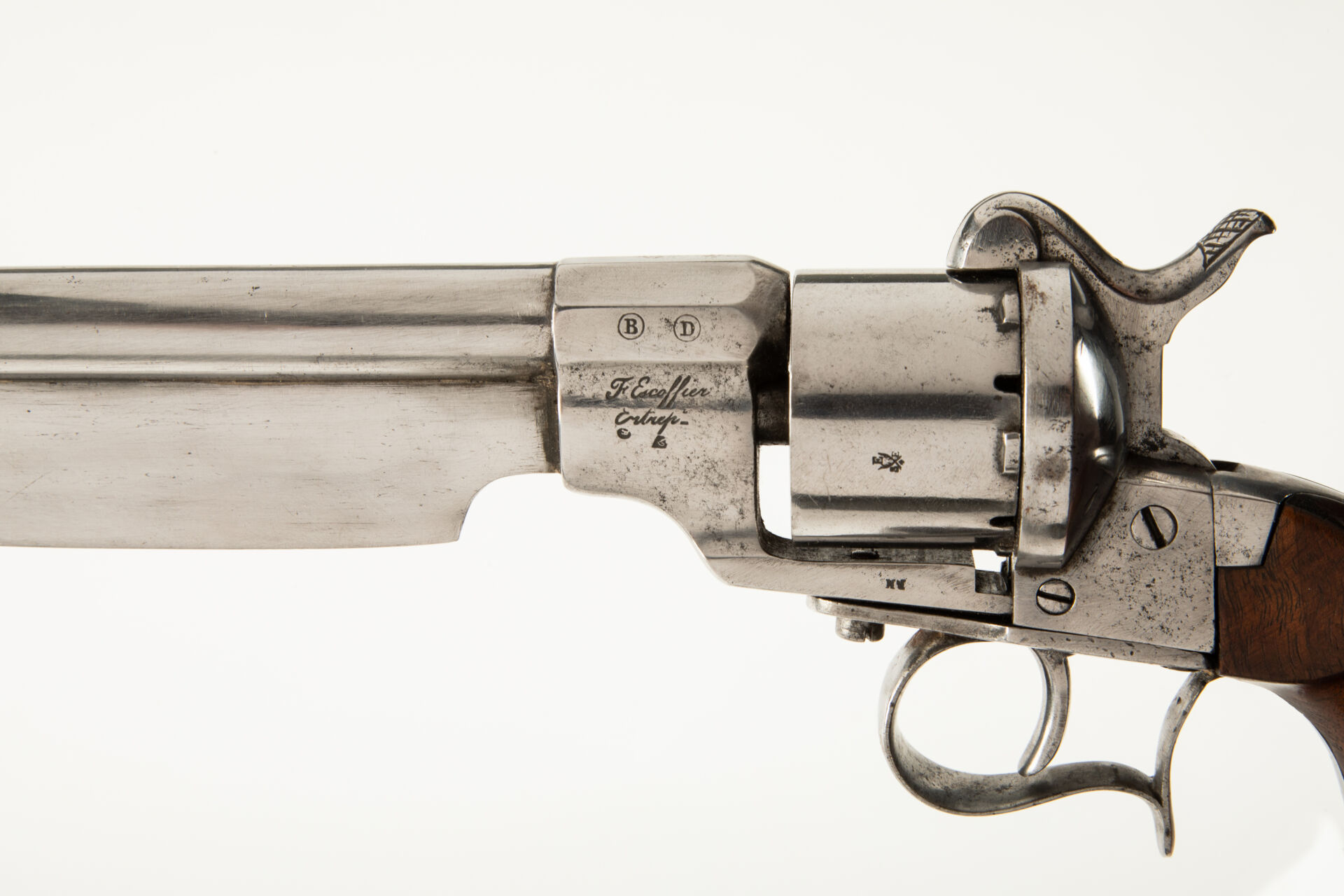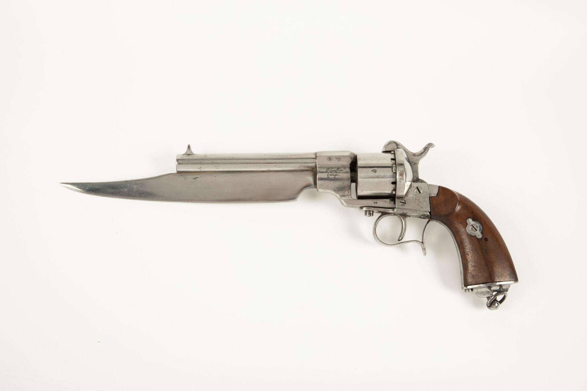 Révolver à broche 1858 MAS-ESCOFFIER, calibre 12 mm à broche, pontet à repose-doigt, canon rond, barillet lisse portant le poinçon du banc d’épreuve de Saint Étienne, poinçon sur le pied gauche du canon « F. ESCOFFIER Entrepreneur » et deux poinçons ronds « B » et « D ». Canon rond agrémenté d’une forte lame de coutelas soudée sous le canon, pointe tombante. Ce révolver possède un pontet à repose doigt et une calotte à quatre pans concaves portant un anneau de calotte. Arme polie blanc, mécanisme fonctionnel, canon aux rayures légèrement oxydées.