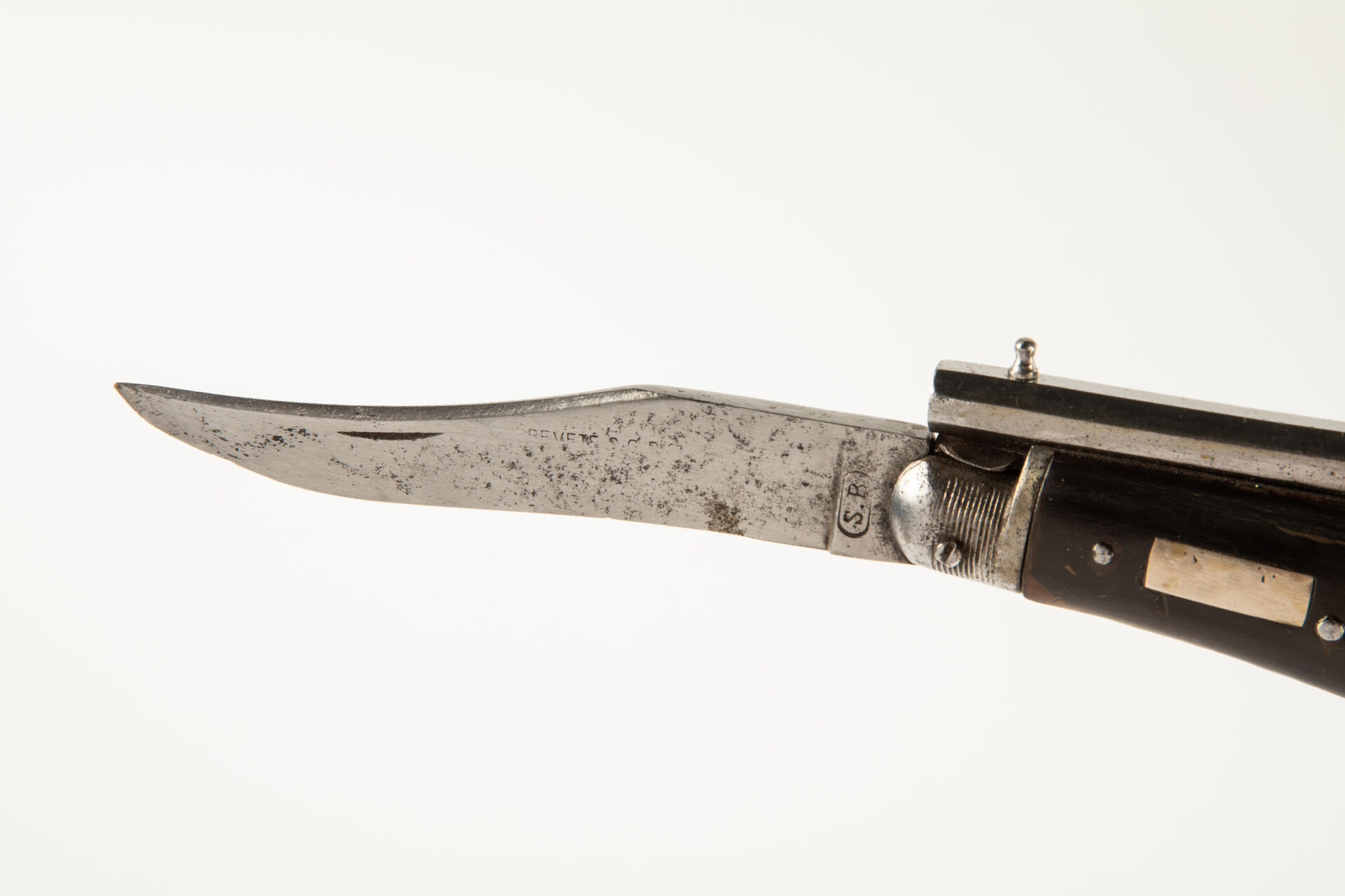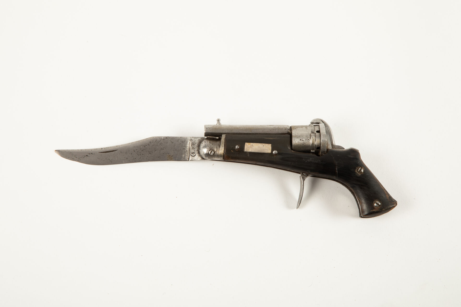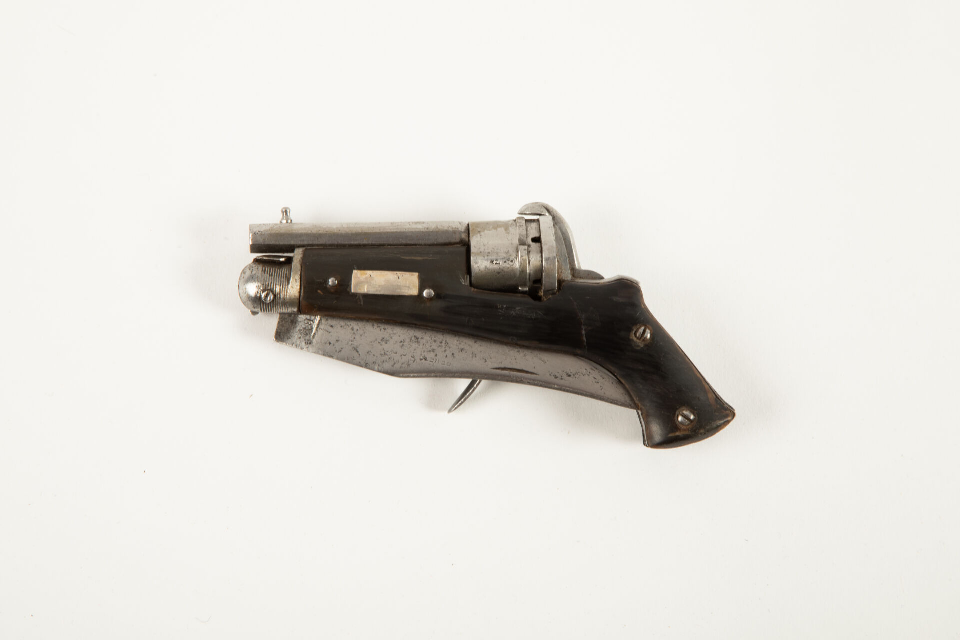 Arme combinée sous la forme d’un couteau pliant, lame unique, pointe tombante, onglet d’ouverture, signature « S.B. » dans un ovale au ricasso, le dos de ce coutelas à plaquettes corne porte un révolver système Lefaucheux à broche, calibre 5 mm double action uniquement (chien sans crête), canon octogonal, baguette d’extraction latérale indépendante, mécanisme fonctionnel. Fente à la plaquette gauche. Longueur totale dépliée de 235 mm.