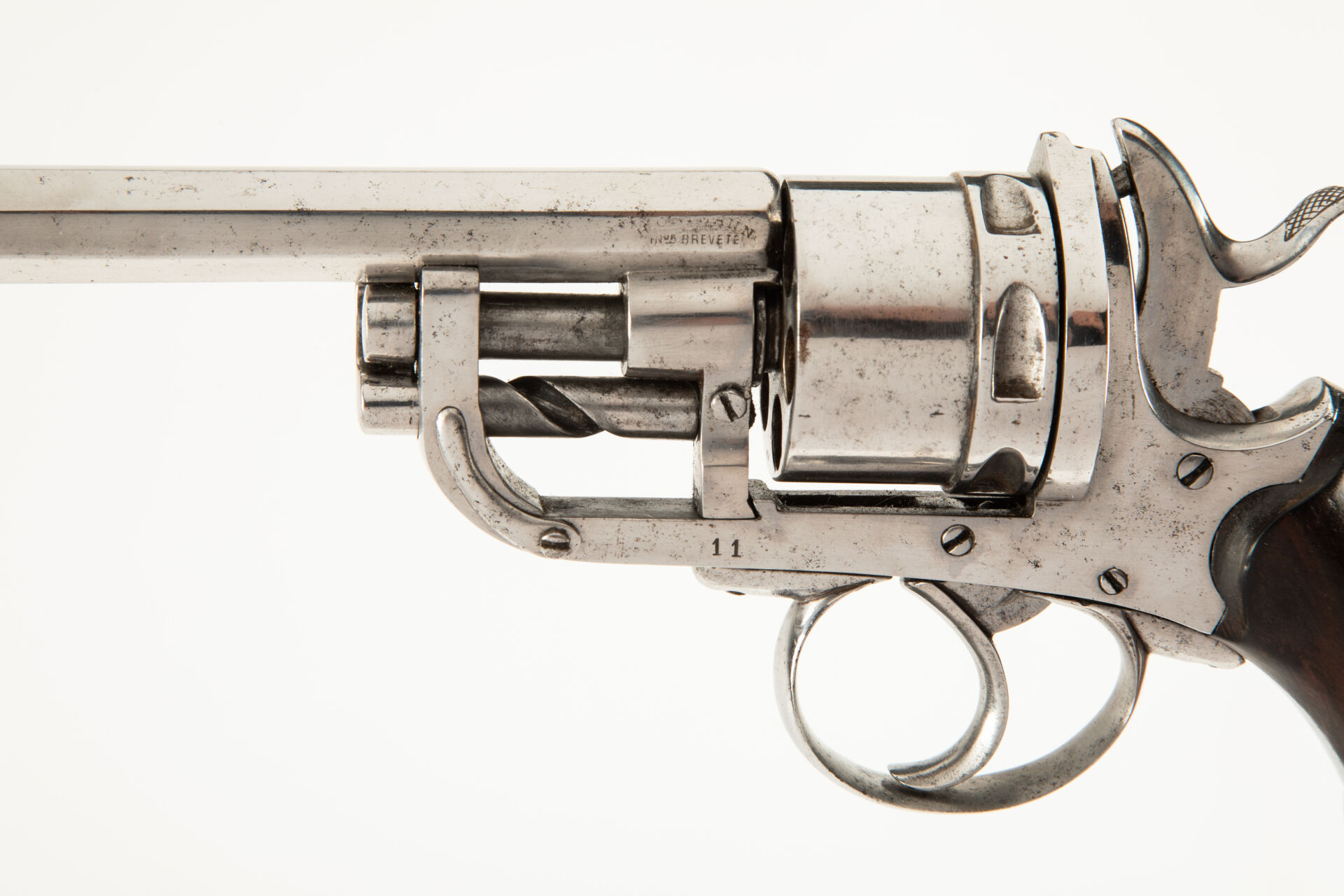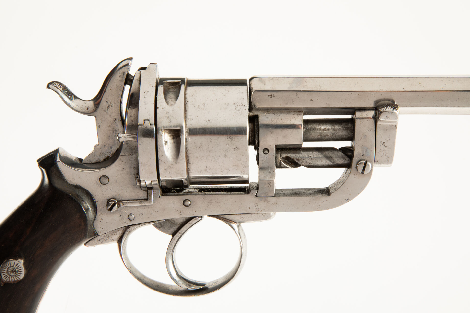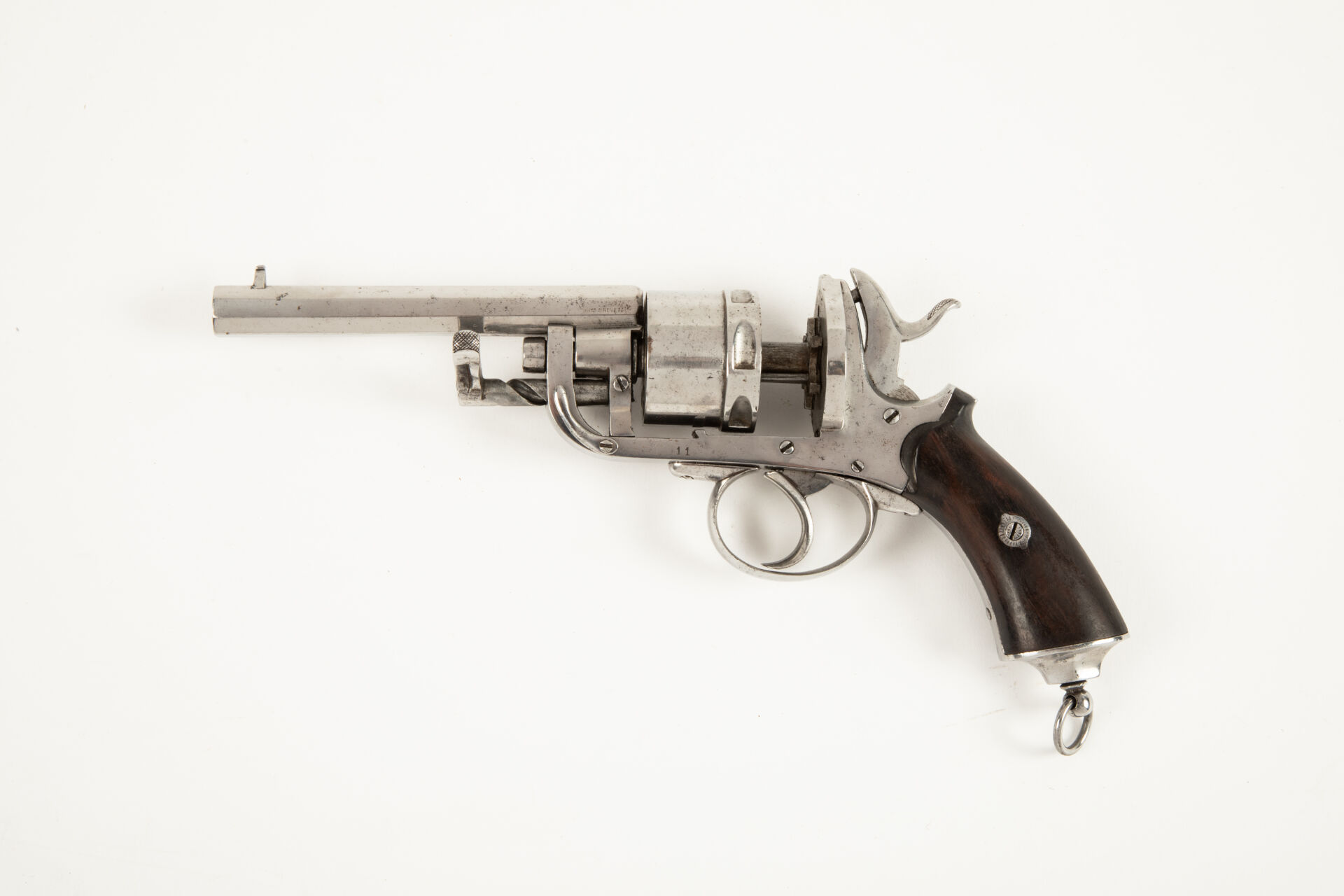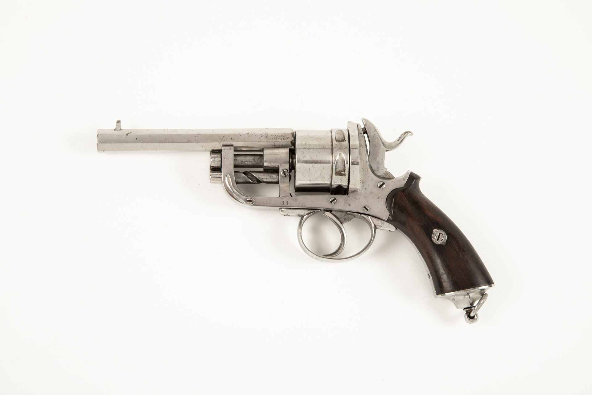 Intéressant révolver belge à six coups en simple et double action fabriqué par H. ORTMANN, barillet lisse en calibre 380 portant le poinçon couronné du banc d’épreuve de Liège, révolver à cadre ouvert, un levier pivotant vers la droite est placé sous la canon, lorsque l’on agit sur e dernier le canon avance par l’entremise d’une rampe hélicoïdale fraisée dans un axe permettant de dégager les chambres du barillet, l’étoile d’extraction fixe restant au niveau du rempart de barillet, c’est l’avancement du barillet qui détermine l’extraction des étuis. Canon octogonal, deux plaquettes de crosse en noyer vernis, calotte diamant à anneau de calotte, pontet rond, simple et double action, le flanc gauche du canon porte le marquage Ortmann difficilement déchiffrable
