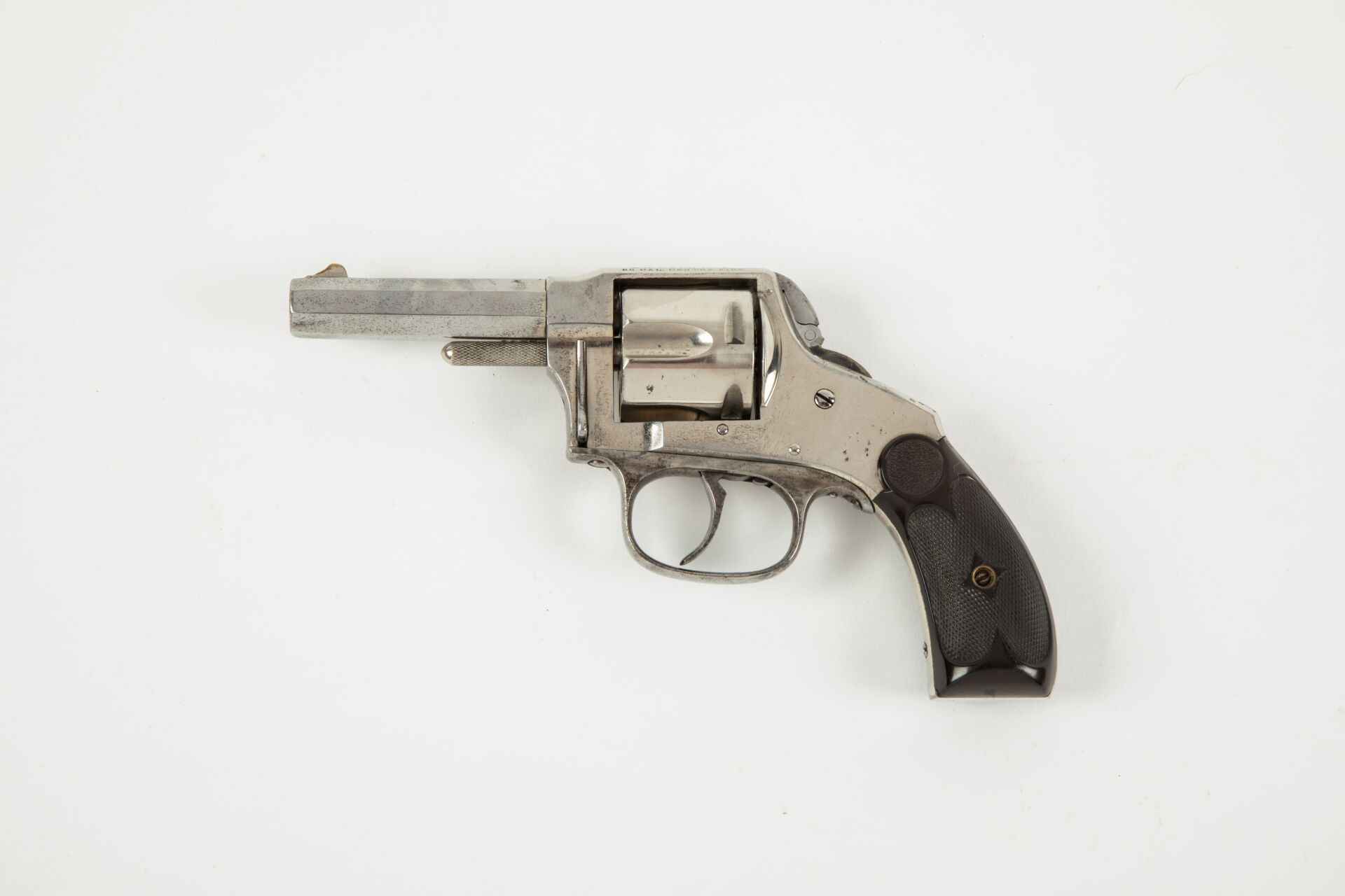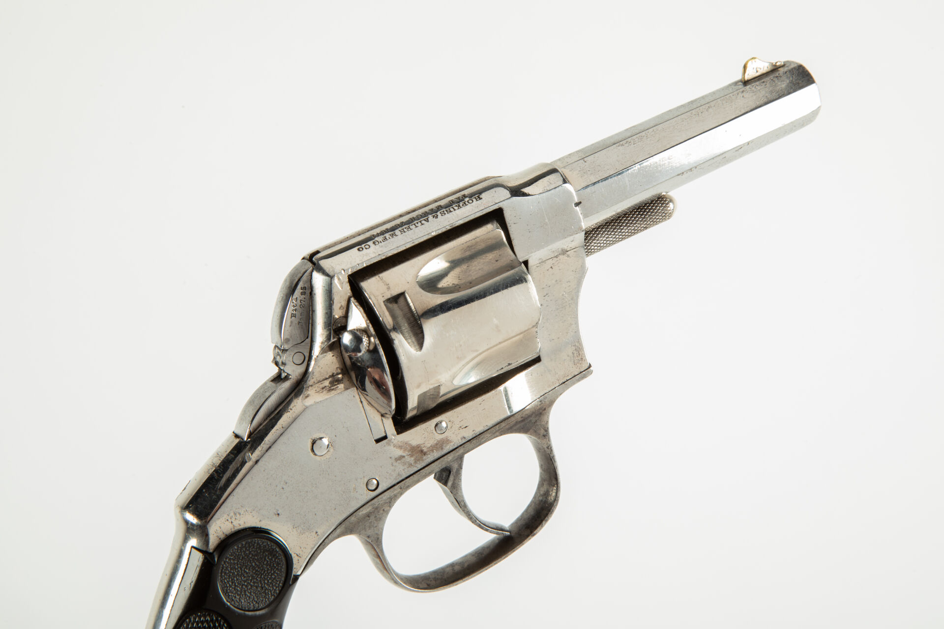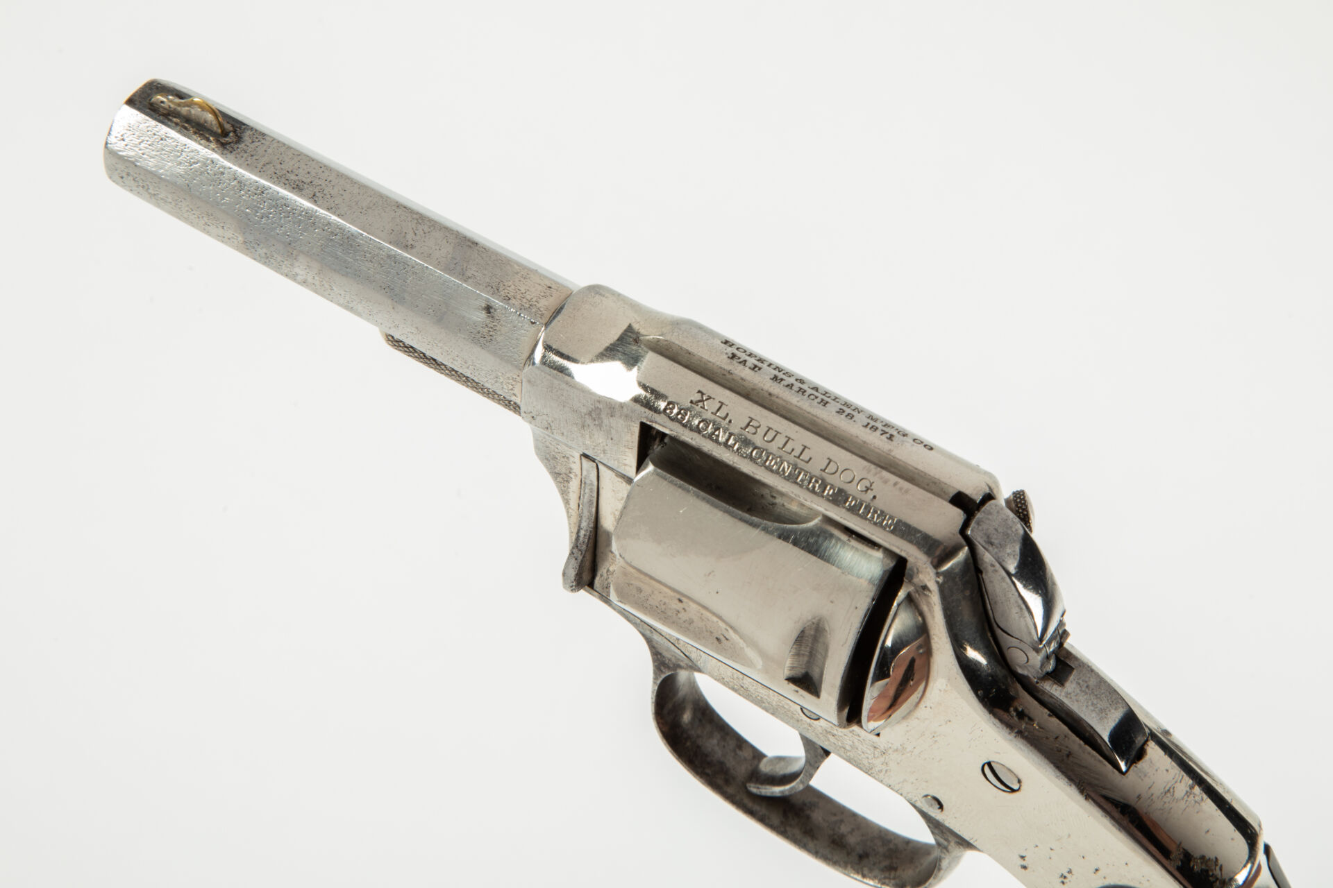 Joli révolver en double action et cadre fermé calibre 38 Hopkins & Allen (Breveté en Mars 1871) modèle XL Bulldog, canon octogonal, barillet cannelé cadre fermé, crête de chien articulée basculant vers l’avant, plaquettes en bakélite brune quadrillée, manque à la base de la plaquette droite, mécanisme fonctionnel, très bon canon pour le tir.