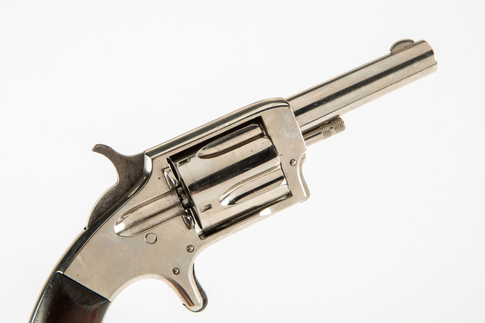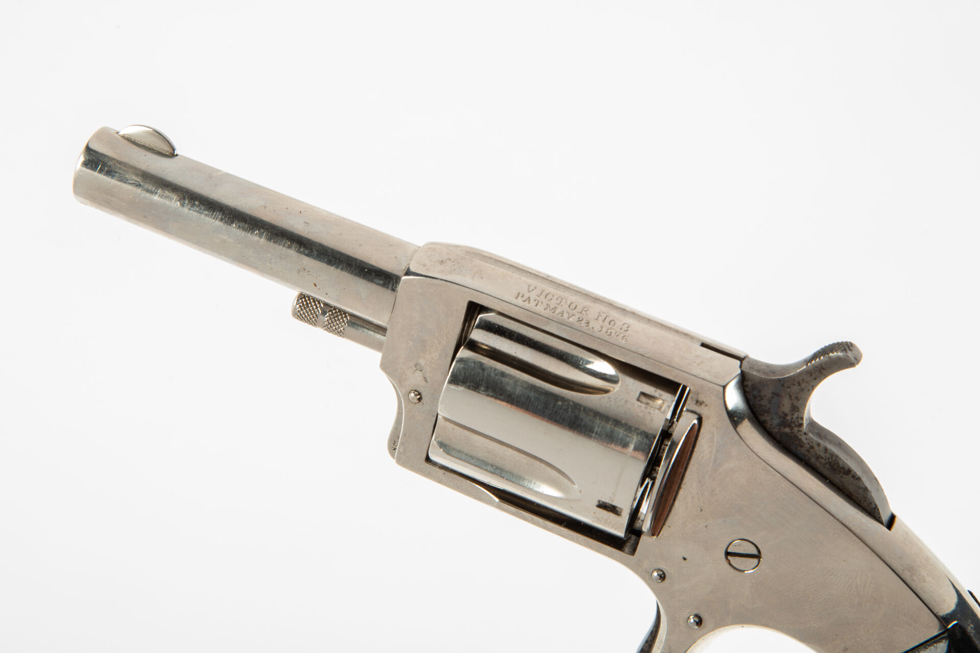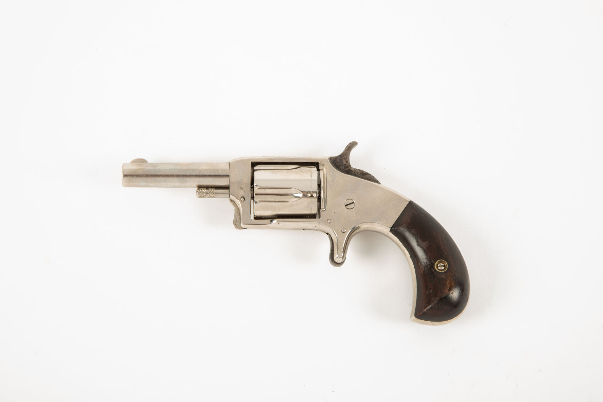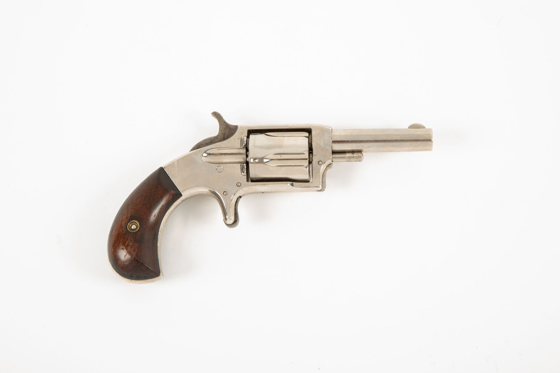 Joli révolver de défense à cadre fermé calibre 32 short, Victor n°2, arme brevetée en 1876, canon rond, cadre fermé, barillet cannelé, détente à la mexicaine, crosse bec de corbin, plaquettes en bois de rose, mécanisme fonctionnel. Dans un étui en cuir contemporain du modèle.