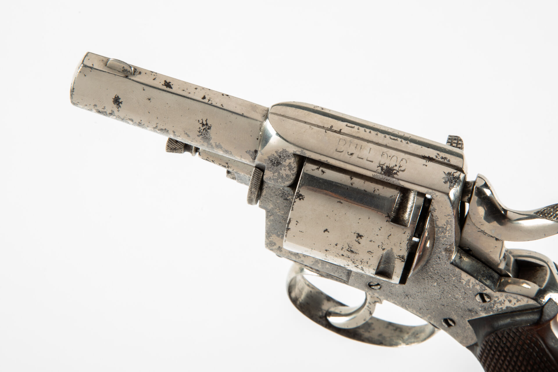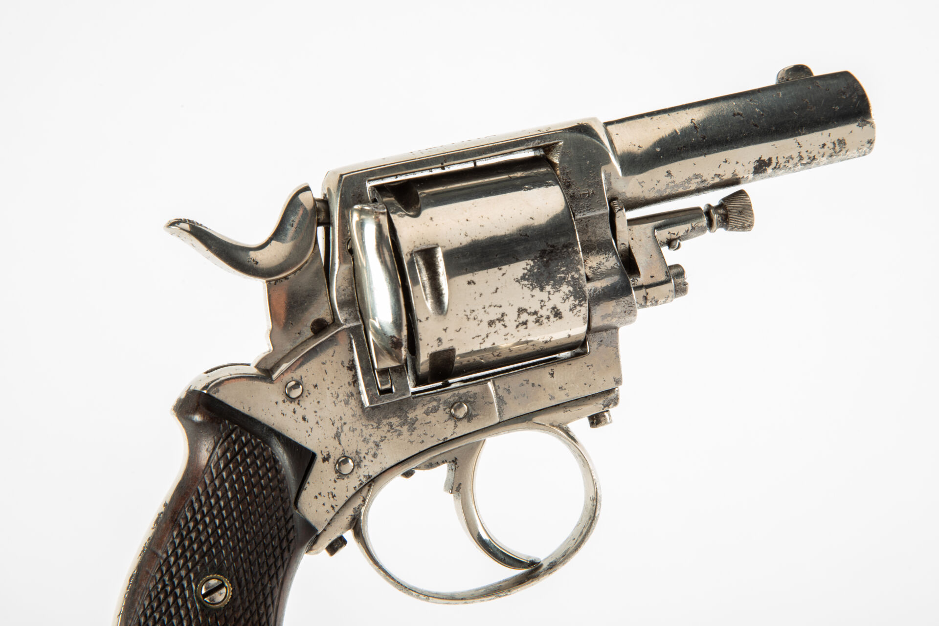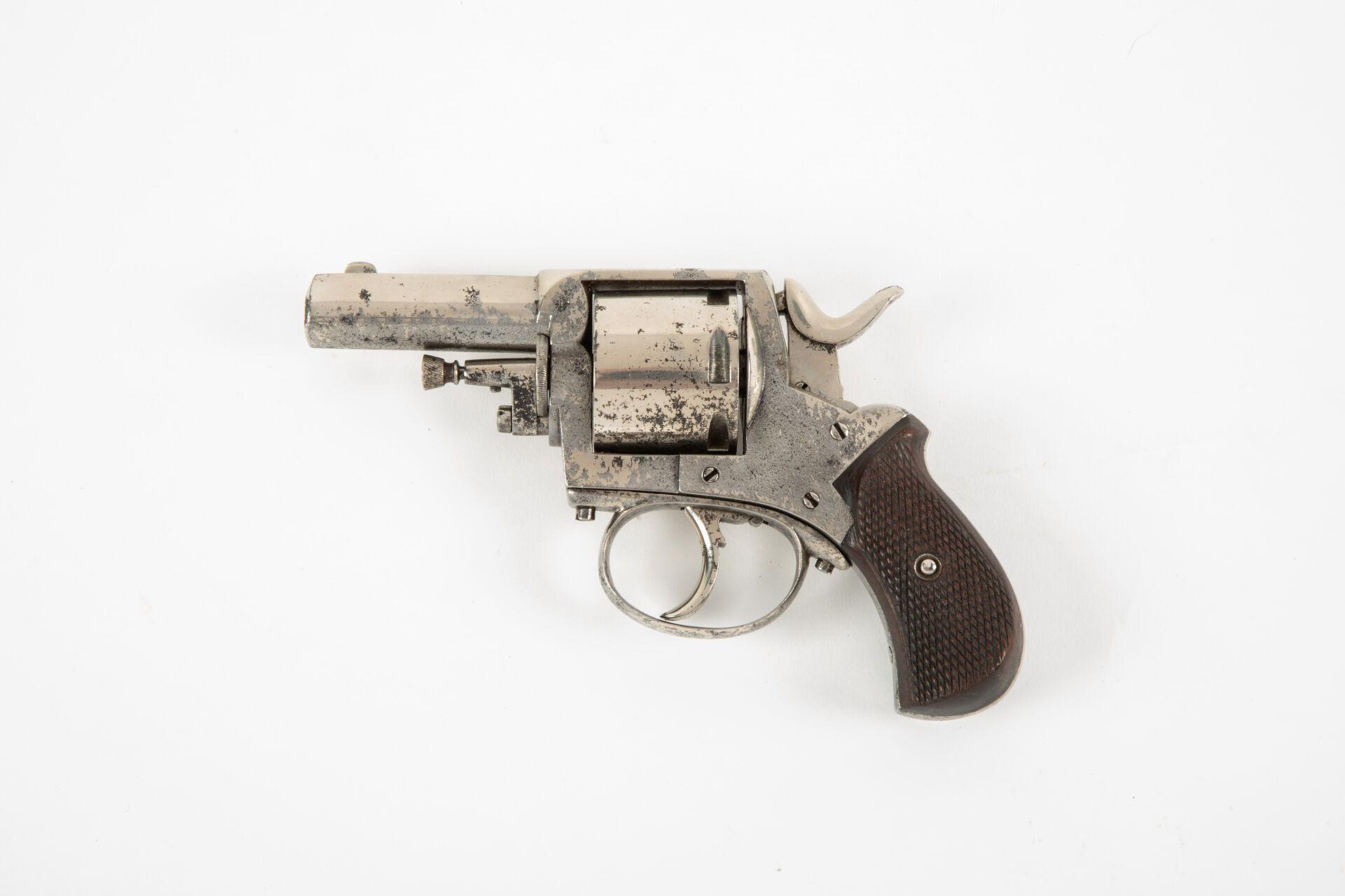 Révolver belge british bulldog, calibre 450, version à barillet lisse, beaux restes de nickelage, détente sous pontet, mécanisme fonctionnel simple et double action, plaquettes de crosse en noyer quadrillé, mécanisme fonctionnel.