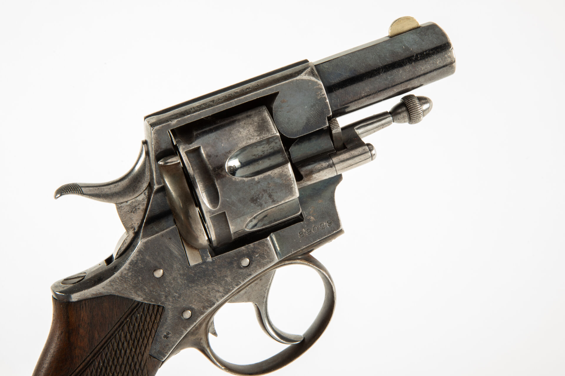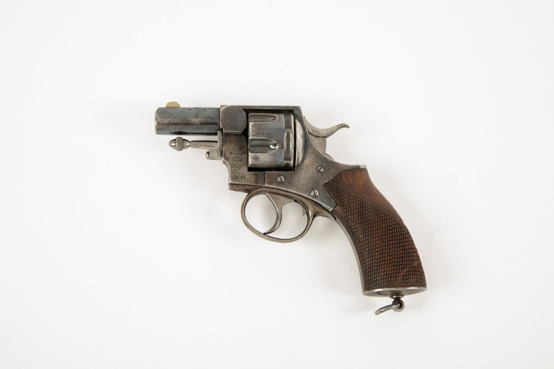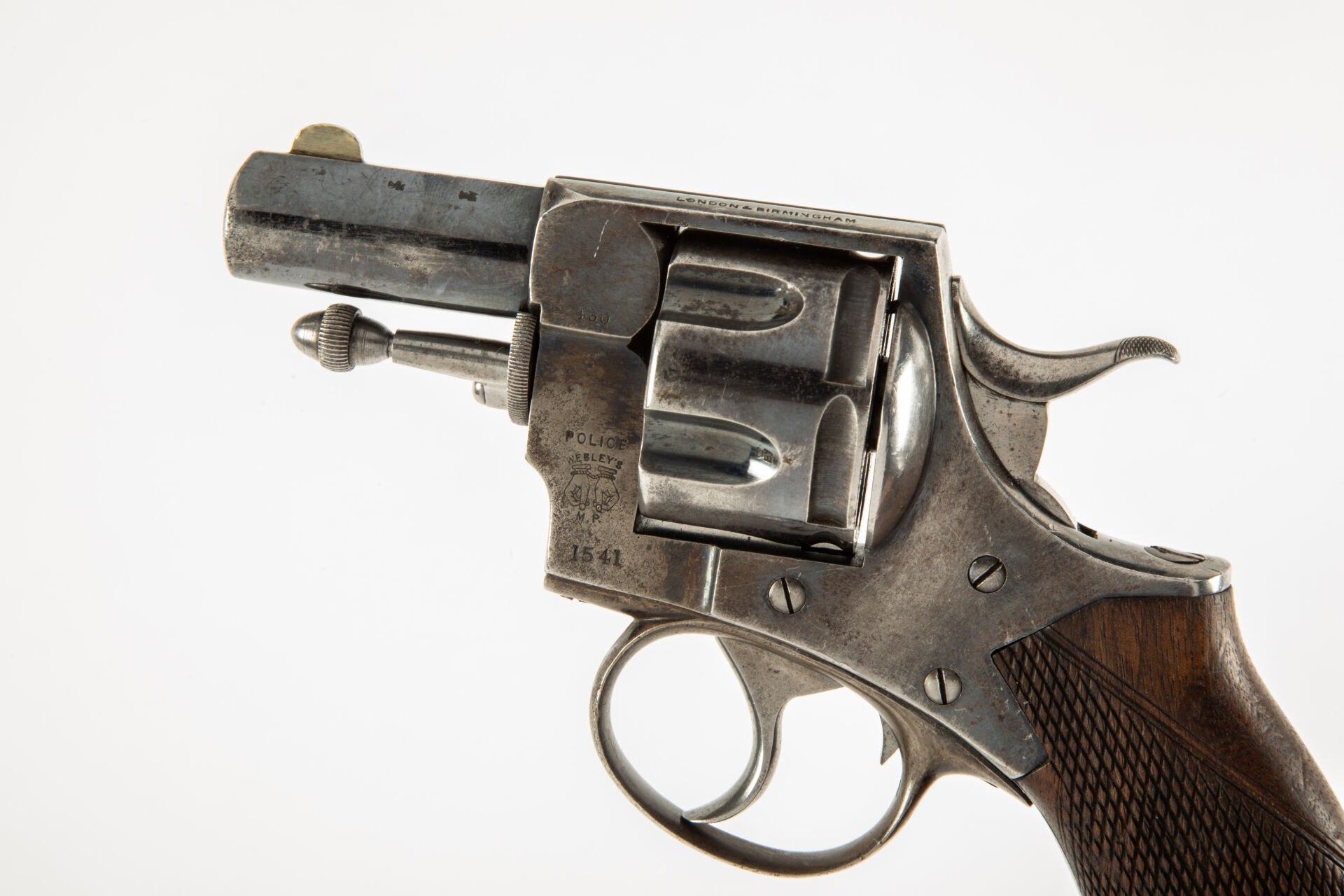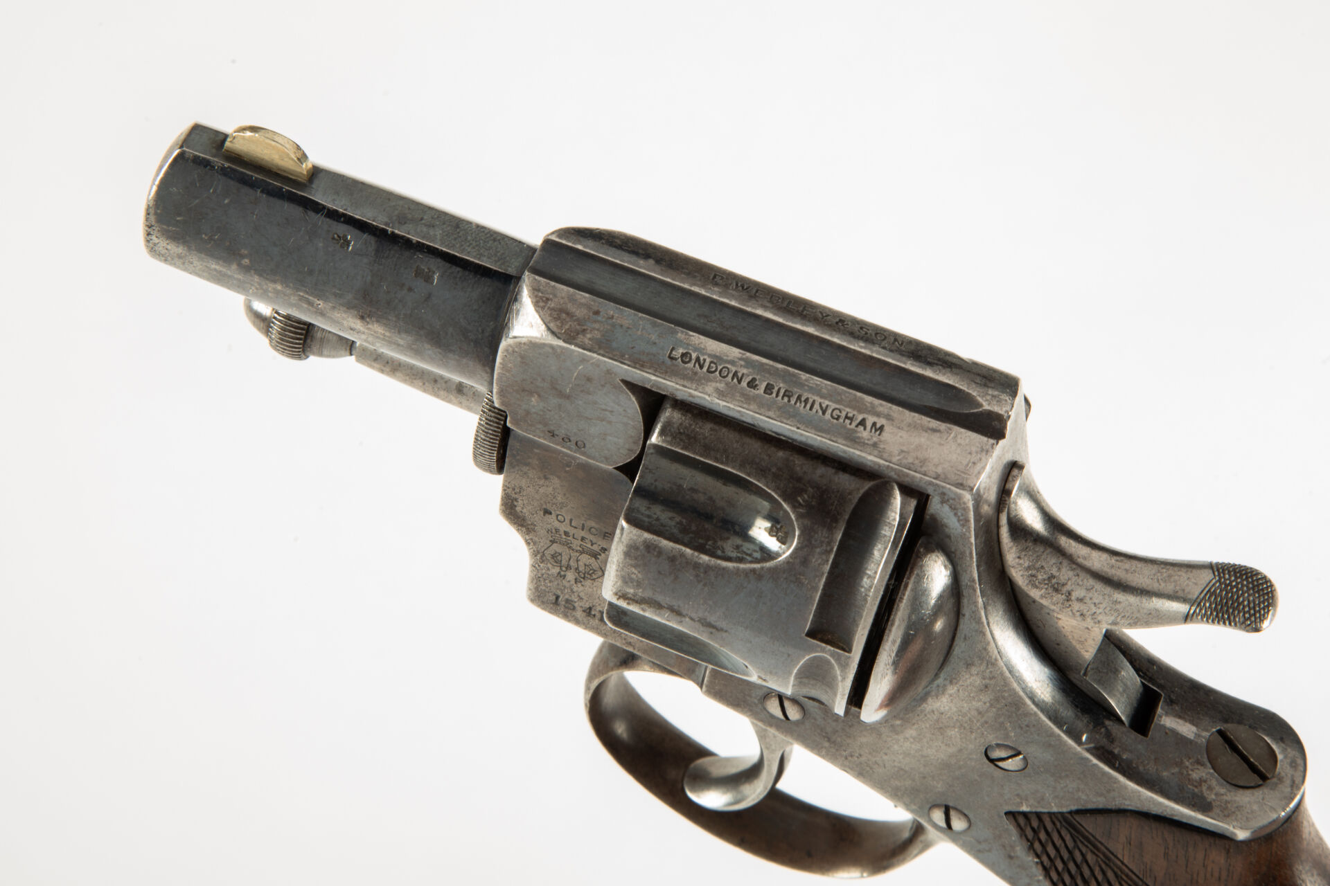 Grand révolver à cadre fermé P. Webley & Son London, Birmingham, en calibre 450 CF, canon court (2 pouces), guidon maillechort. Ce révolver est un révolver de Police comme en atteste de marquage sur le flanc gauche de la carcasse « Police Webley’s MR » ce texte surmontant deux mains menottées. Barillet cannelé, simple et double action, excellent canon pour le tir, mécanisme fonctionnel, plaquette enveloppante unique en noyer partiellement quadrillé, quelques piqures sans trop de gravité.