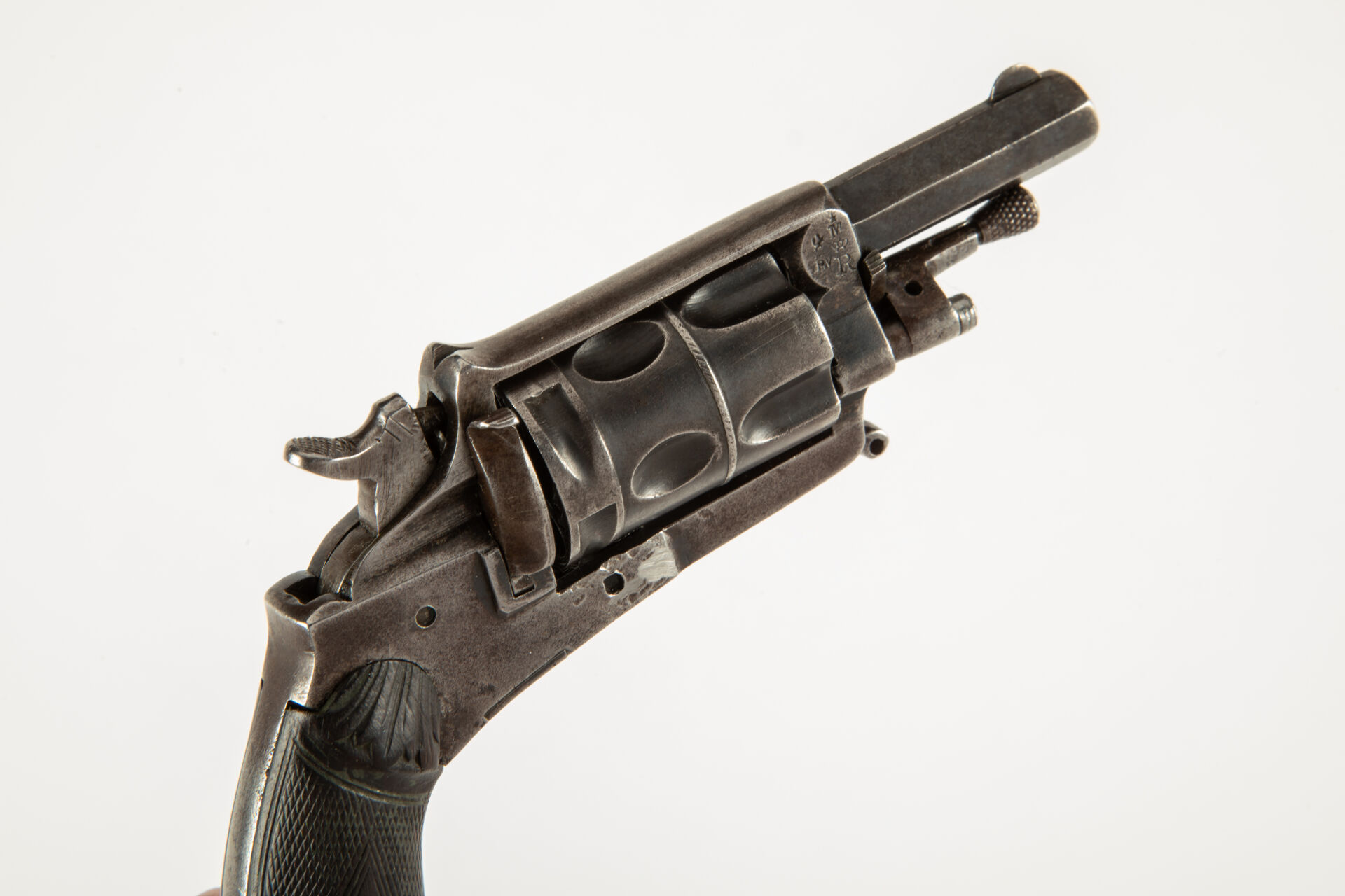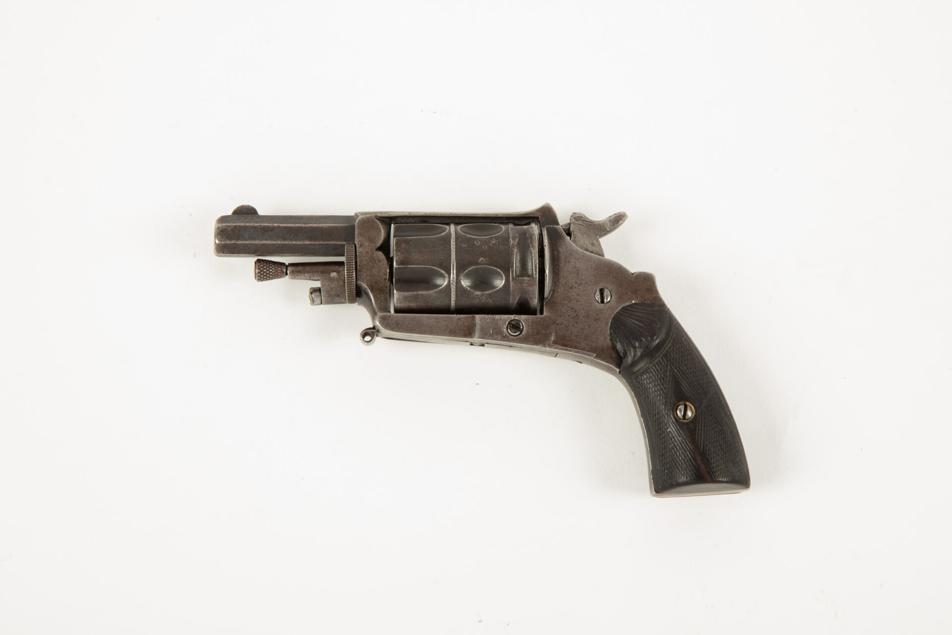 Révolver vélodog calibre 6 mm vélodog, version à cadre fermé, canon octogonal, détente repliable et chien extérieur simple et double action, bronzage ayant viré au tabac, minimes traces de restauration sur la carcasse à droite, mécanisme fonctionnel en double action, accroche du chien à revoir en simple action