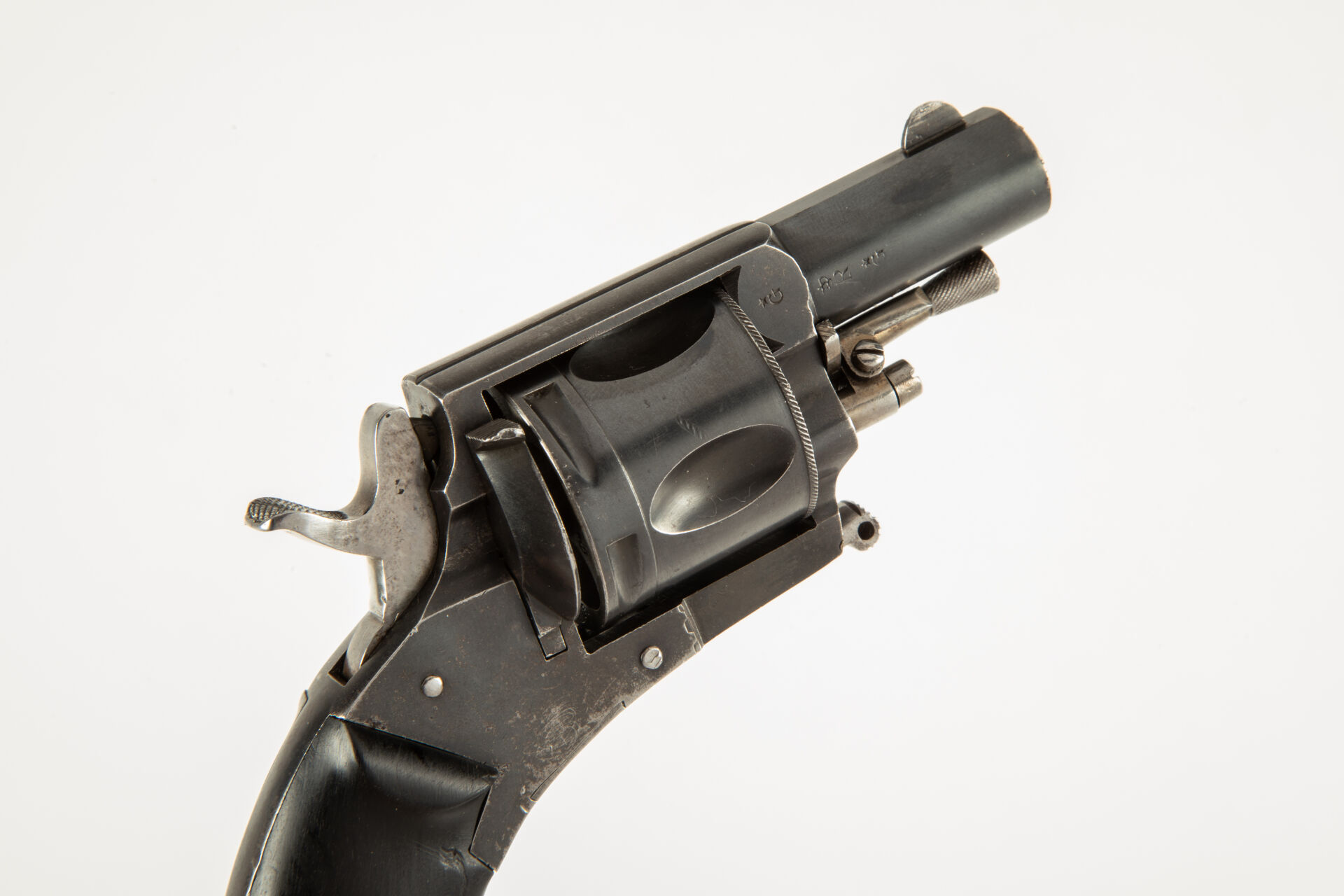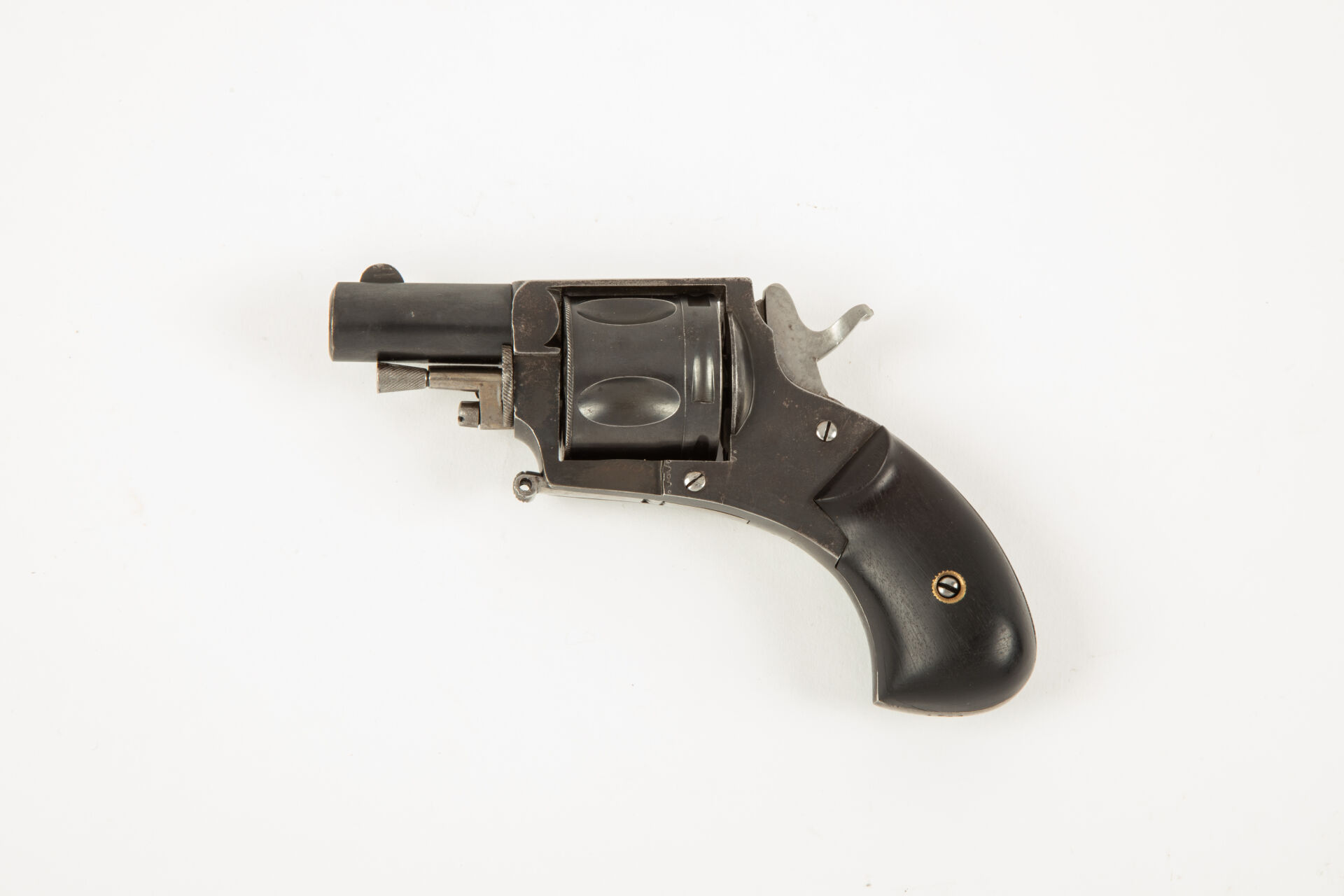 Joli révolver belge type British Bulldog, calibre 380, arme bronzée noir, détente repliable et escamotable, chien bouchonné, deux plaquettes en ébène lisse, bronzage d’origine, mécanisme fonctionnel.