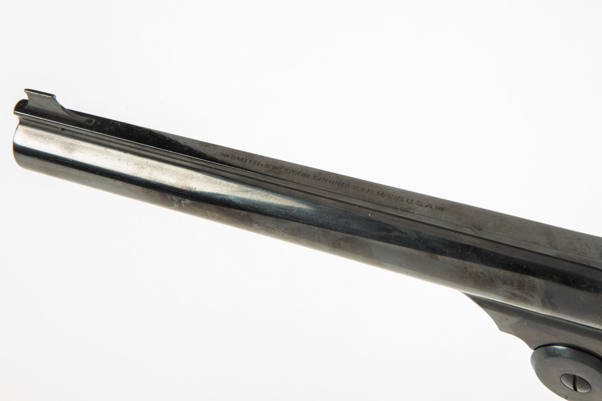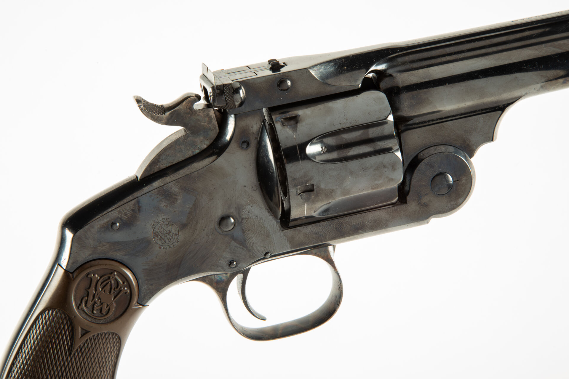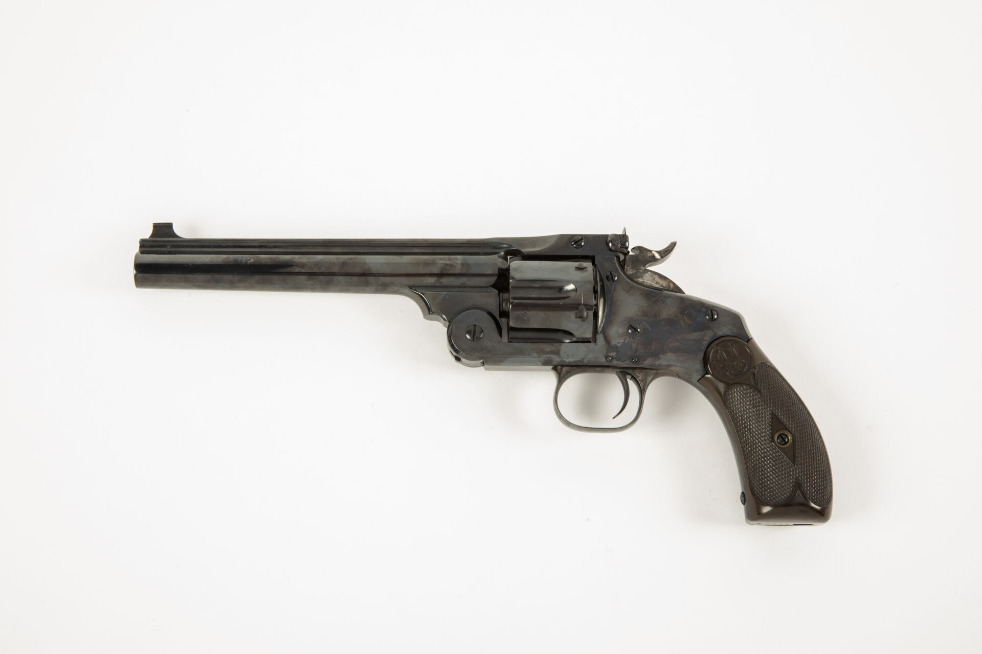 Très joli révolver Smith & Wesson n°3 Target, calibre 38/44 SW, très beau bronzage brillant, excellent canon de 6 pouces doté d’une hausse réglable et d’un fin guidon, chien et pontet jaspés, plaquettes en bakélite brune au logo Smith & Wesson, fraisage en demi-lune sous la carcasse entre les plaquettes, mécanisme fonctionnel.