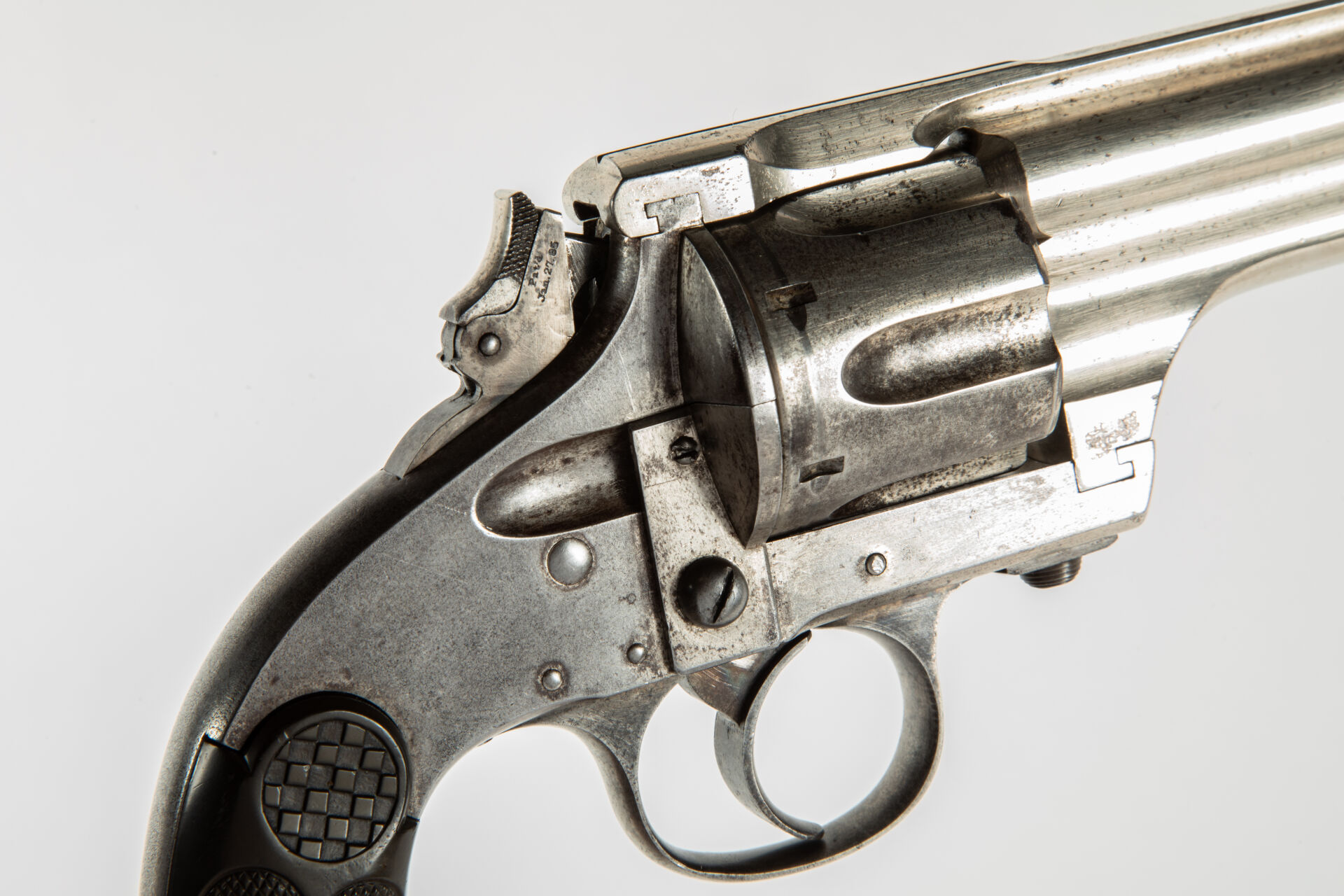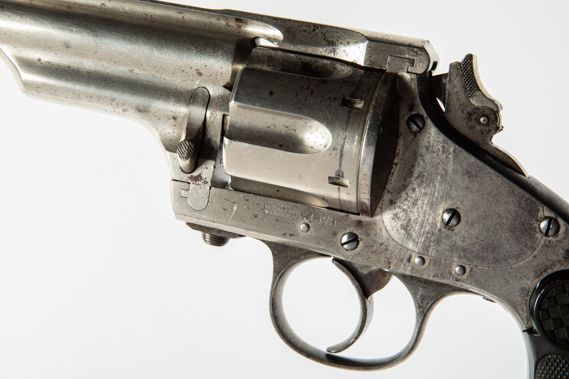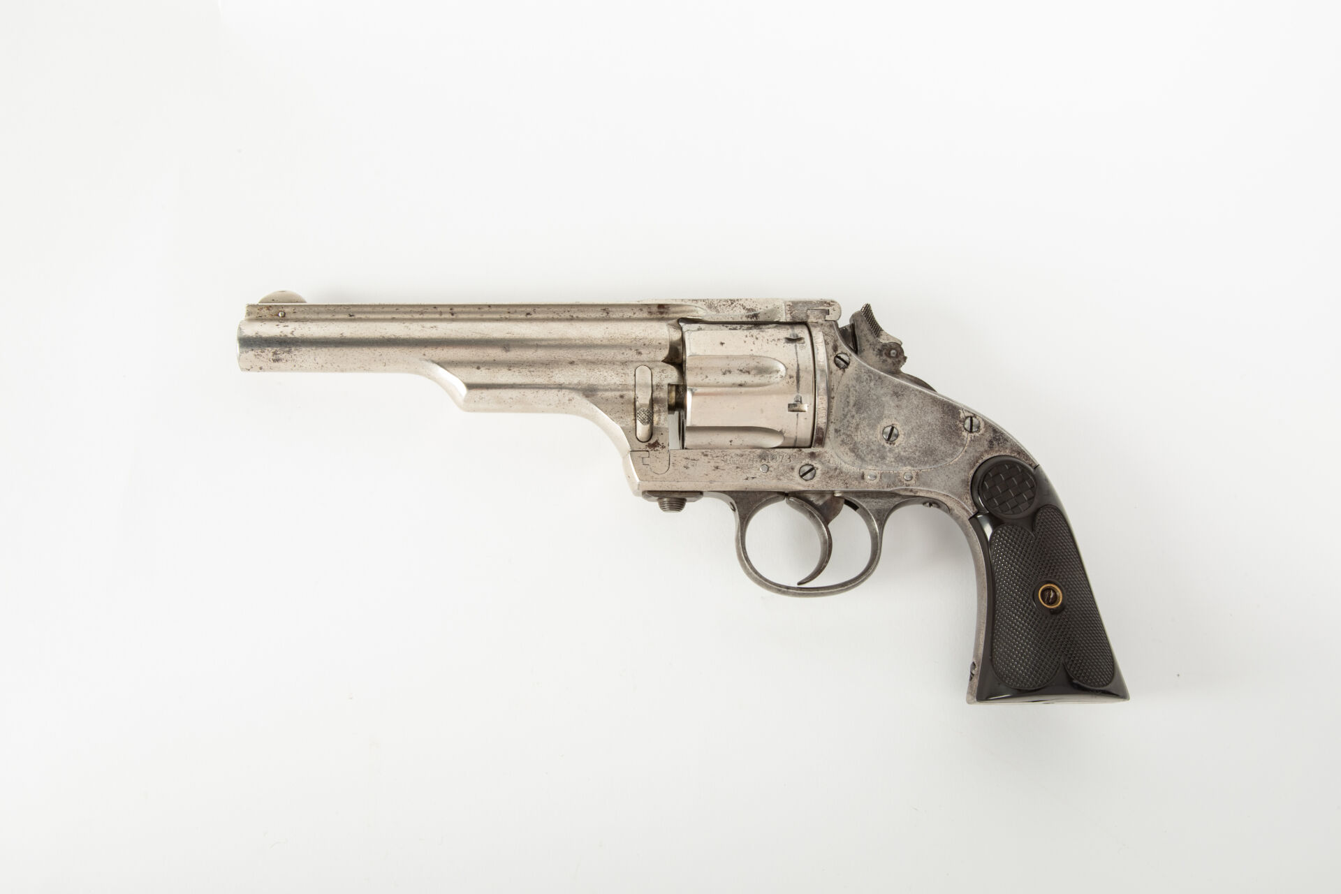 Intéressant Merwin & Hulbert modèle 1878 Frontier Army, calibre 44-40, canon de 5 pouces 3/4 avec de très belles rayures, mécanisme fonctionnel en simple et double action, chien à crête repliable, marquage d’indication du calibre sur le flanc gauche de la carcasse compréhensible simplement par des initiés (calibre Winchester 1873), arme avec restes de nickelage (50%), plaquettes en bakélite quadrillée noire à logo au damier de la firme, léger manque à la plaquette gauche. Filetage d’attente d’anneau de calotte. Mécanisme fonctionnel.