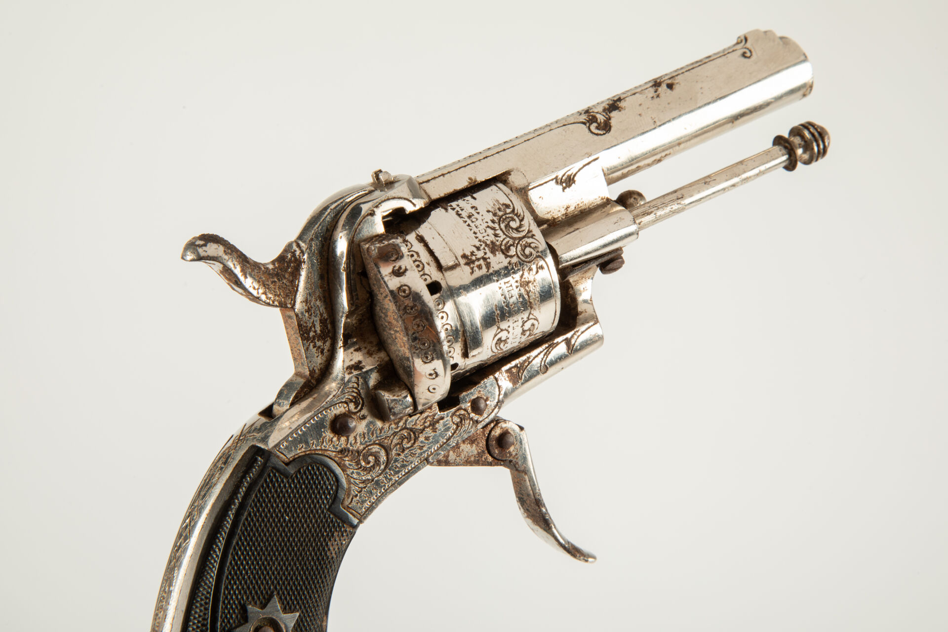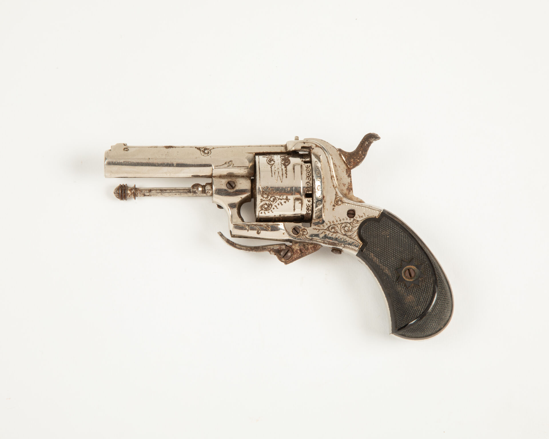 Joli révolver à broche à cadre fermé, canon rond à trois pans supérieurs, ensemble nickelé portant de belles gravures florales, portière de chargement à droite, mécanisme fonctionnel mais nécessitant une lubrification, deux plaquettes de crosse en bakélite quadrillée à rosette de vis à l’étoile