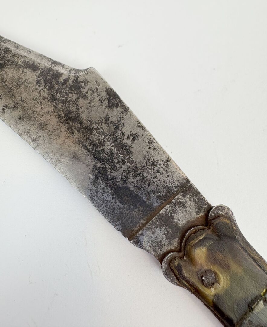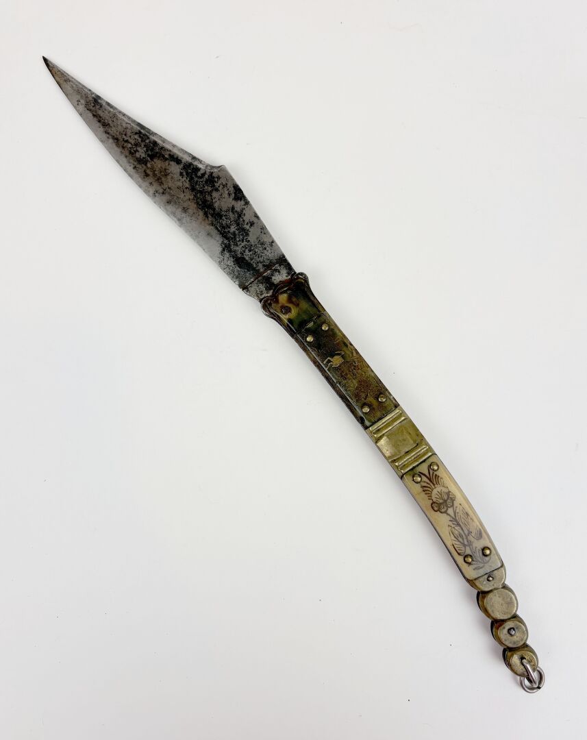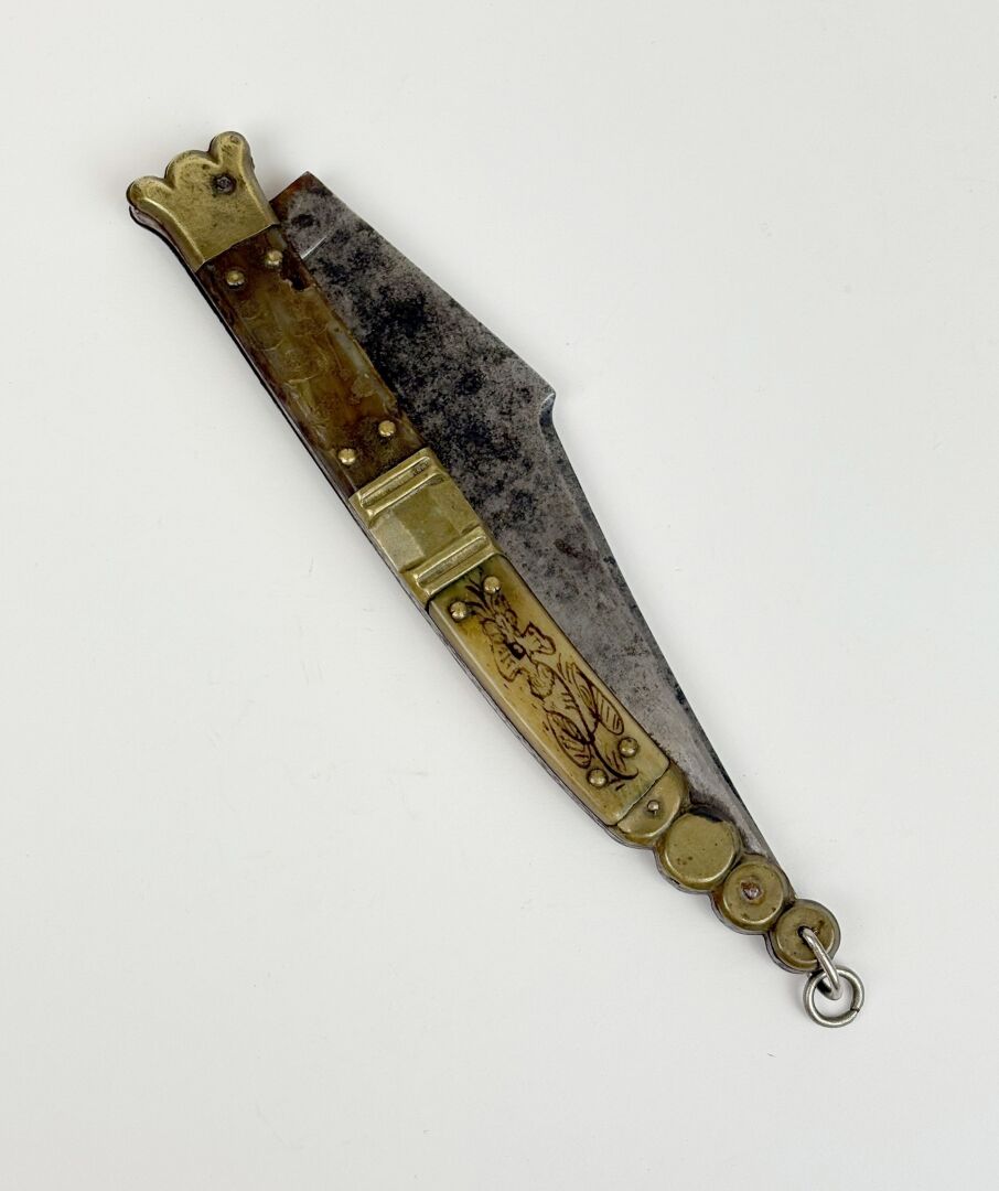 Grande Navaja à l’espagnole, fabrication française pour l’exportation, forte lame évasée à sa base à fort contre-tranchant figuratif. Mitre de tête trilobée mitre de queue en queue de serpent à sonnette, mitre intermédiaire séparant quatre plaquettes rivetées, deux en corne, deux en os. Quelques accidents et manques. Ressort fonctionnel.
