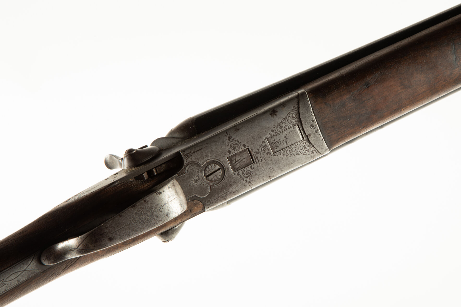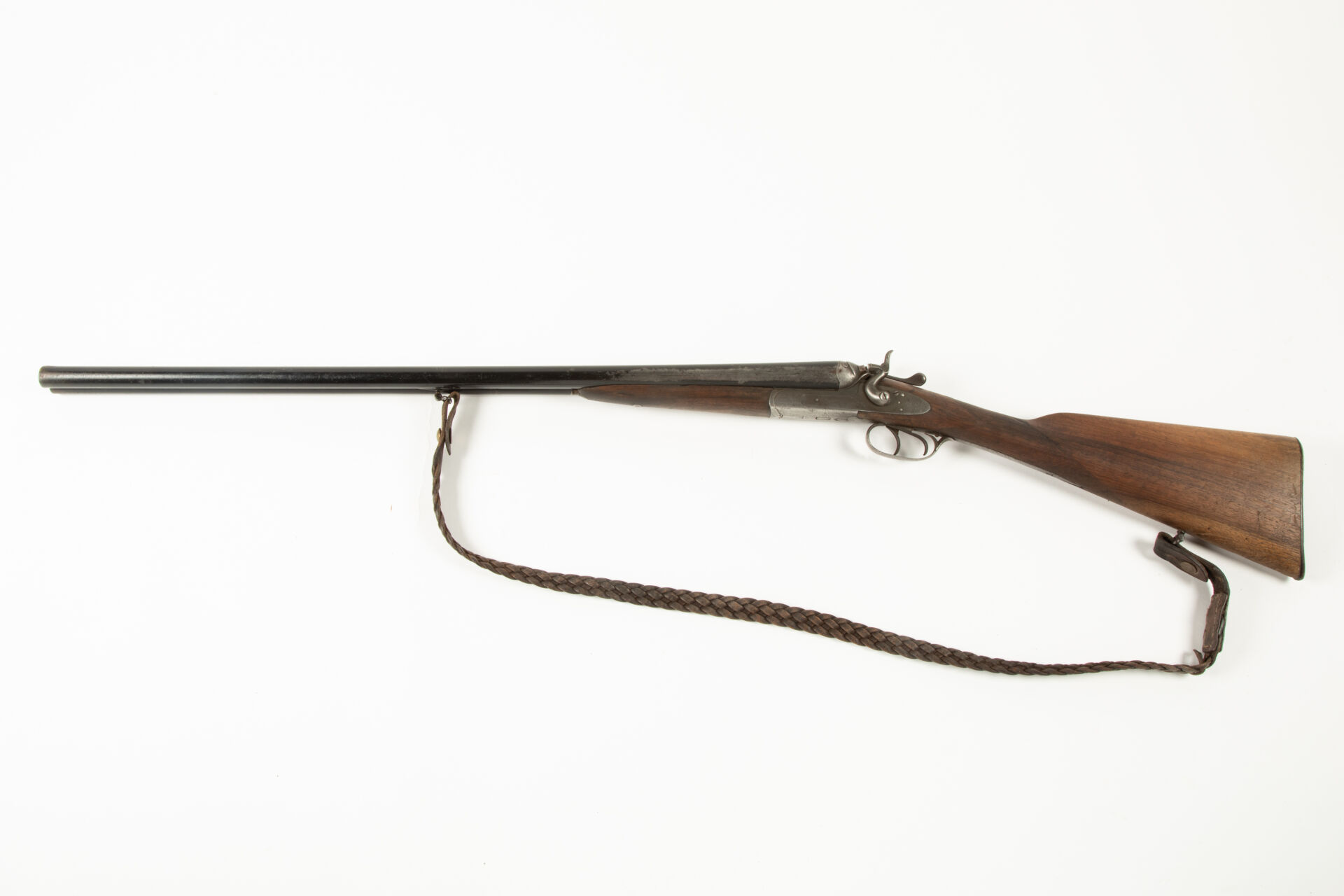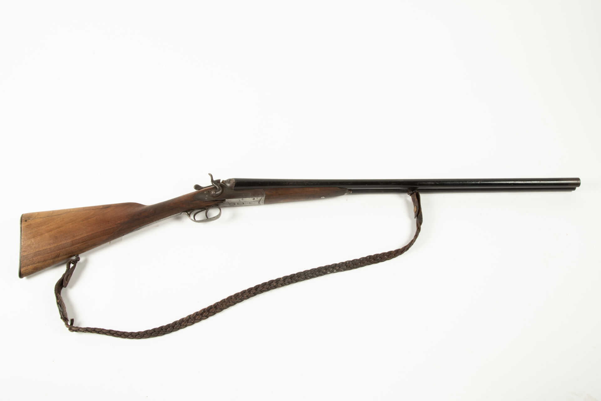 Fusil juxtaposé à chiens, calibre 12/65, canons à bande plongeante de 720 mm repeint en noir, crosse anglaise, manque à la face inférieure de la mise en bois de la platine droite, mécanisme fonctionnel, ressort de clef à revoir.