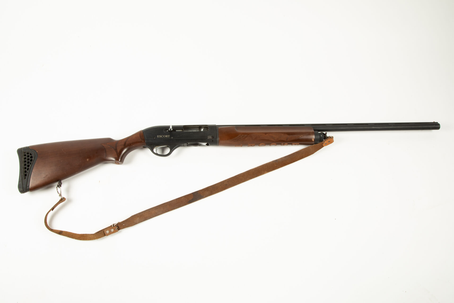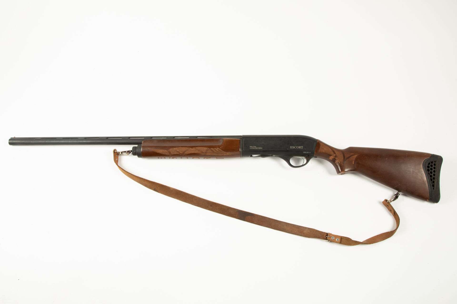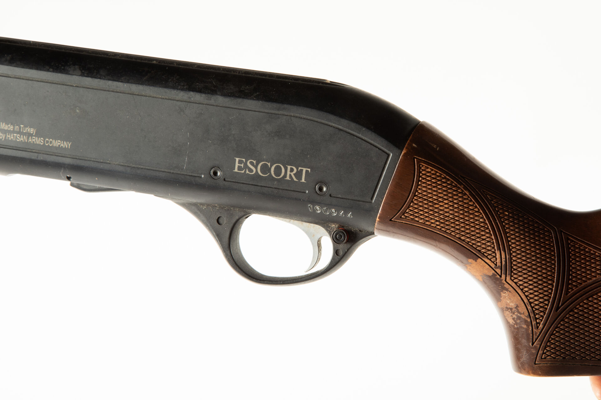 Fusil semi-automatique Turque Hatsan modèle Escort, calibre 12/70, canon mobil-choke à bande ventilée de 700 mm de long, finition mat, crosse pistolet, devant portant le marquage « Escort » gravé au laser dans le bois, plaque de couche alvéolée, mécanisme fonctionnel à vide.