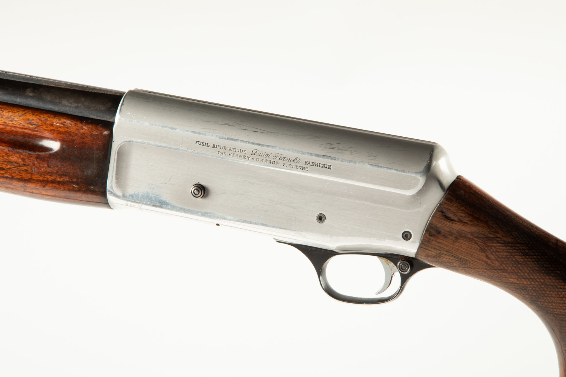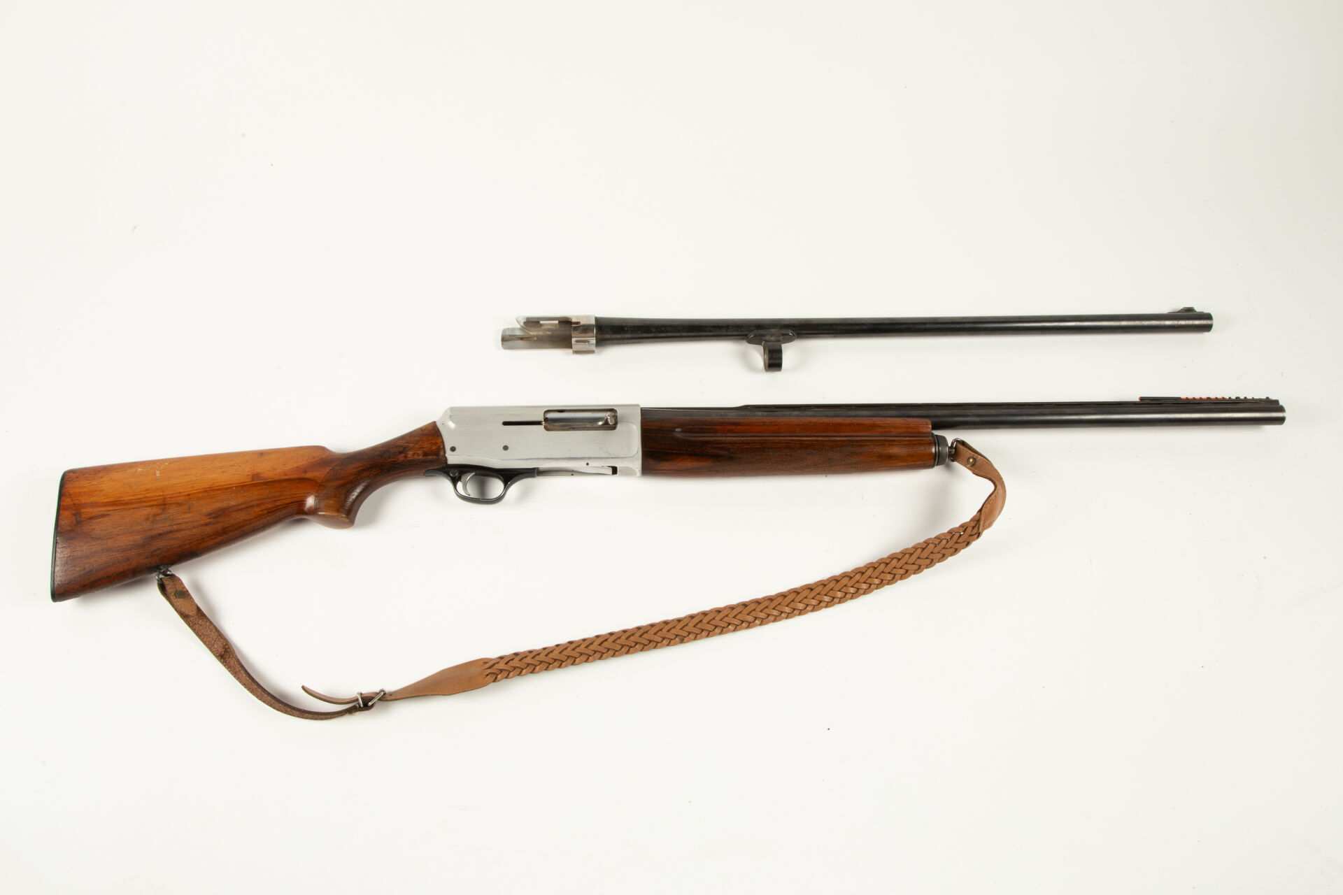 Fusil semi-automatique Francchi Verney Caron à recul de canon, calibre 12/70, canons de 660 mm de long à bande ventilée et canon supplémentaire tir à balles numéro D70830 (L : 650 mm). Anodisation absente, crosse pistolet. Avec bretelle tressée, mécanisme fonctionnel à vide.