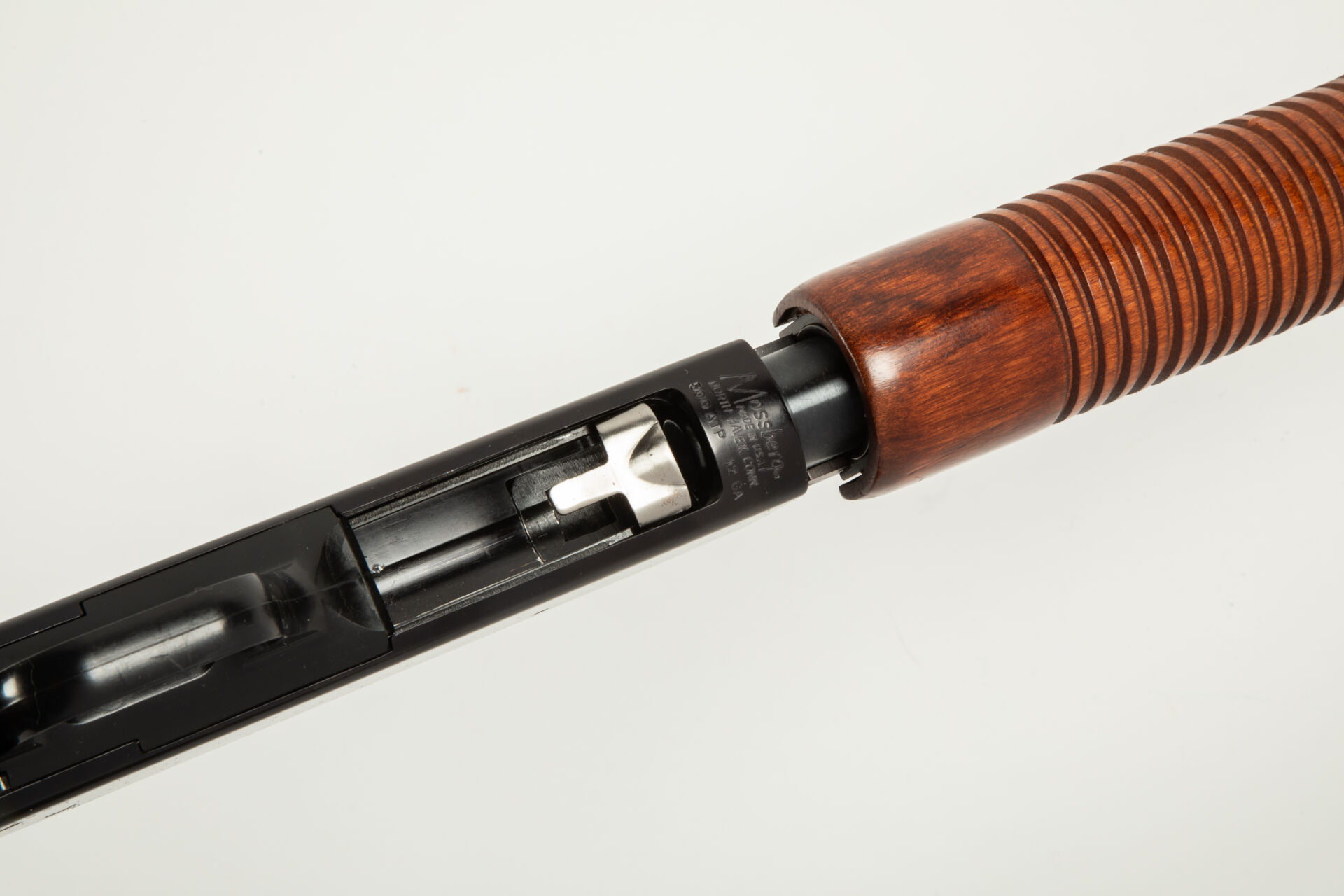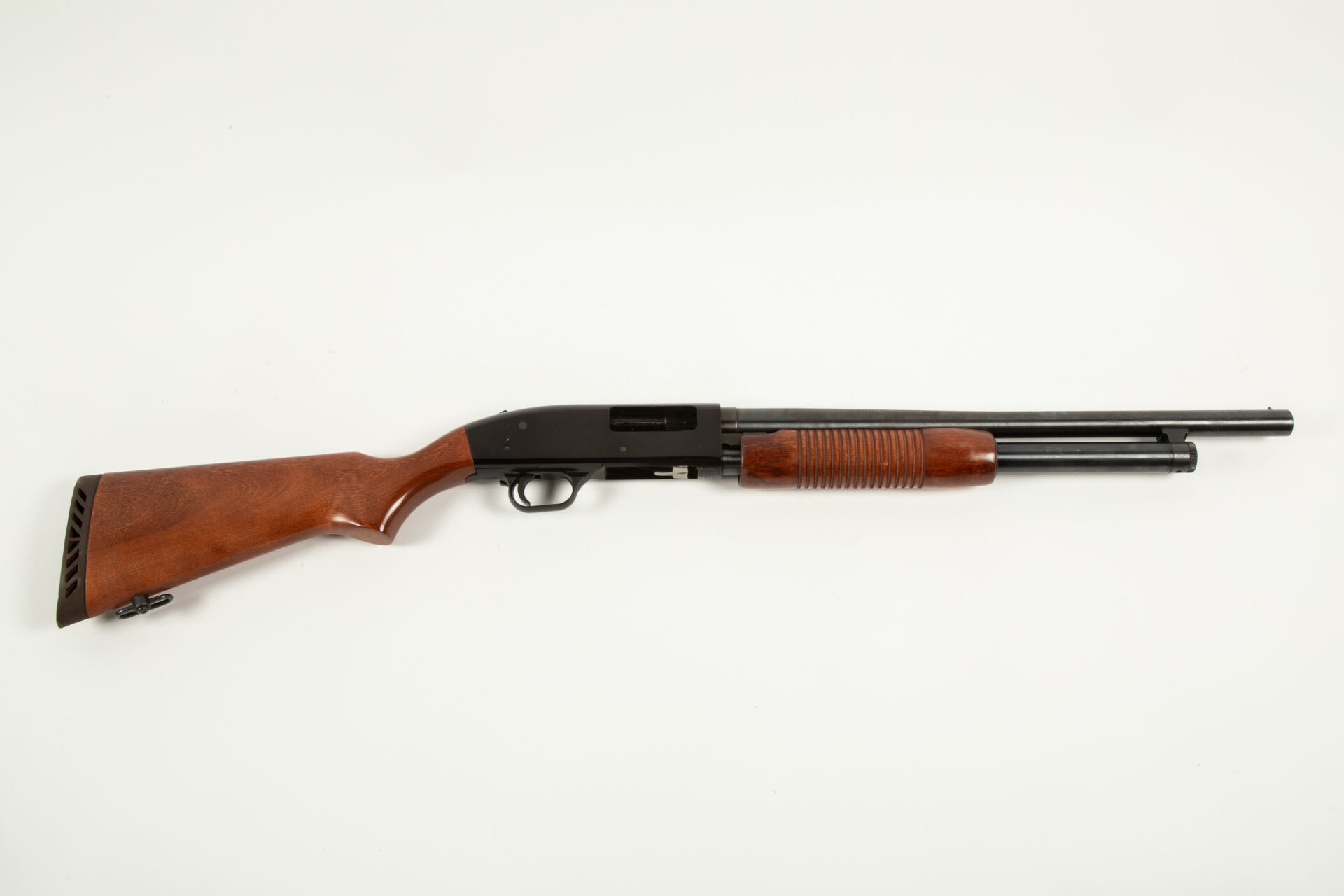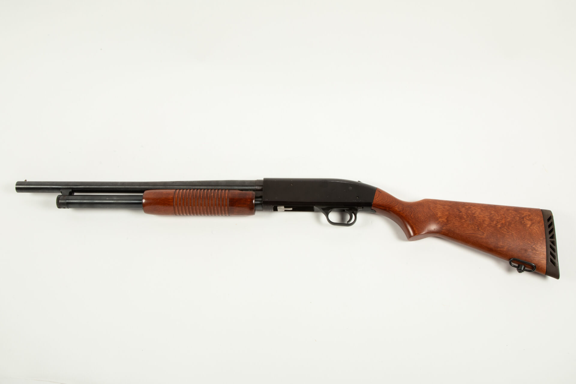 Fusil à pompe Mossberg modèle 500 ATP, calibre 12/70, canon de 472 mm sans bande ventilée, monture bois, mécanisme fonctionnel.