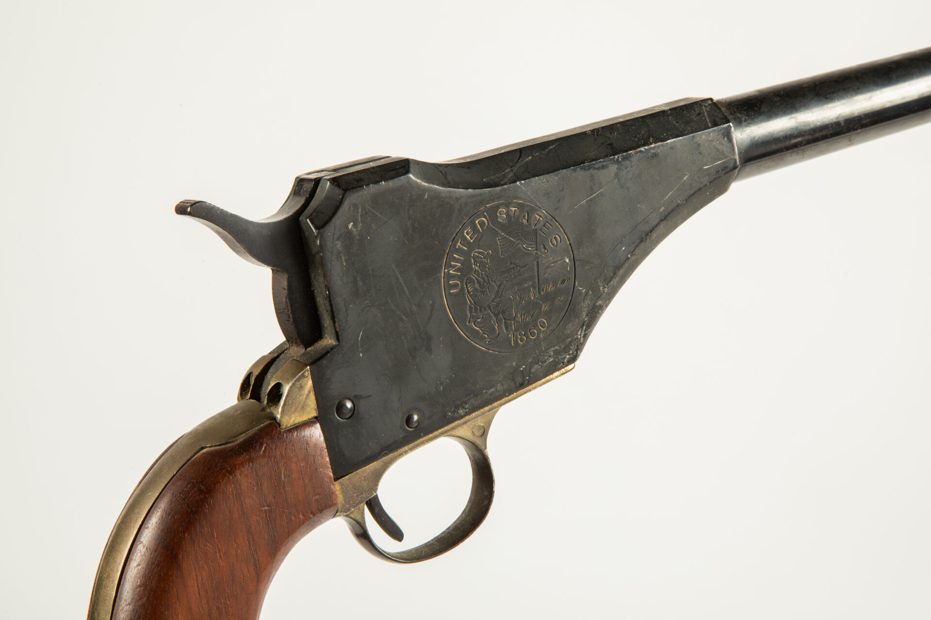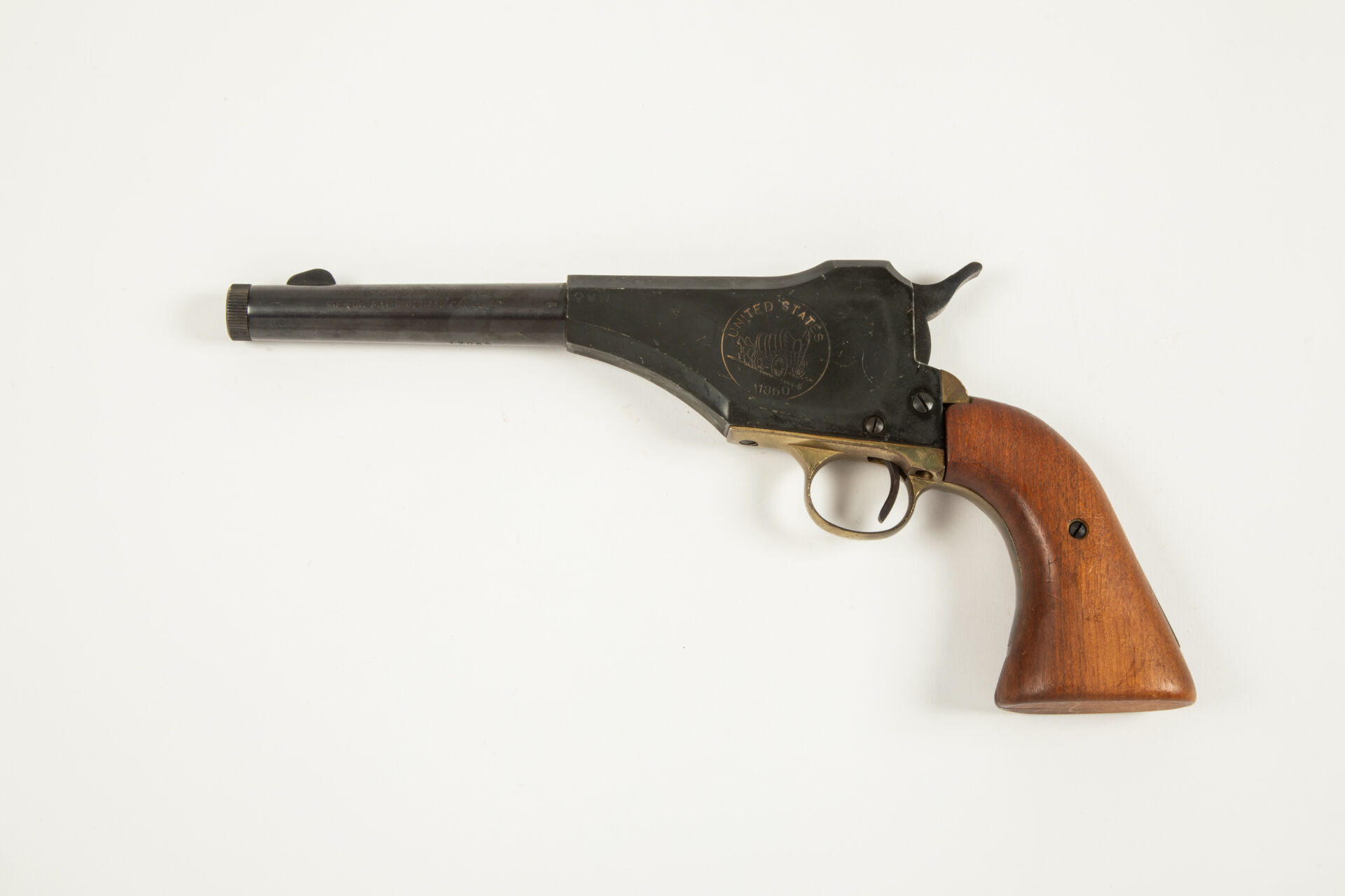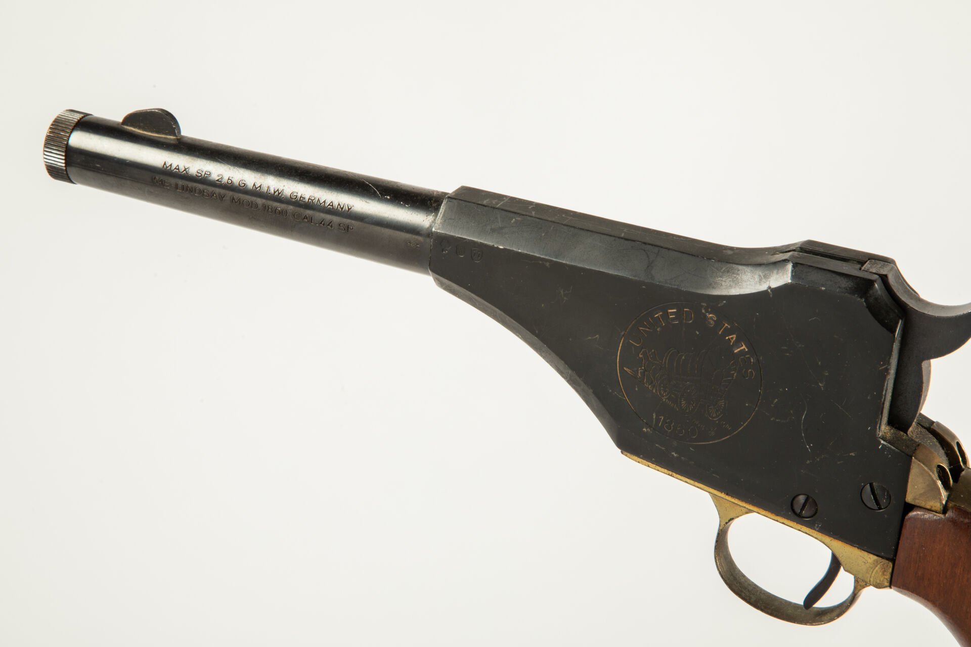 Pistolet à un coup à percussion Lindsay modèle 1860, calibre 44 avec réduction en calibre 4.5 mm, mécanisme fonctionnel, dans sa boite.