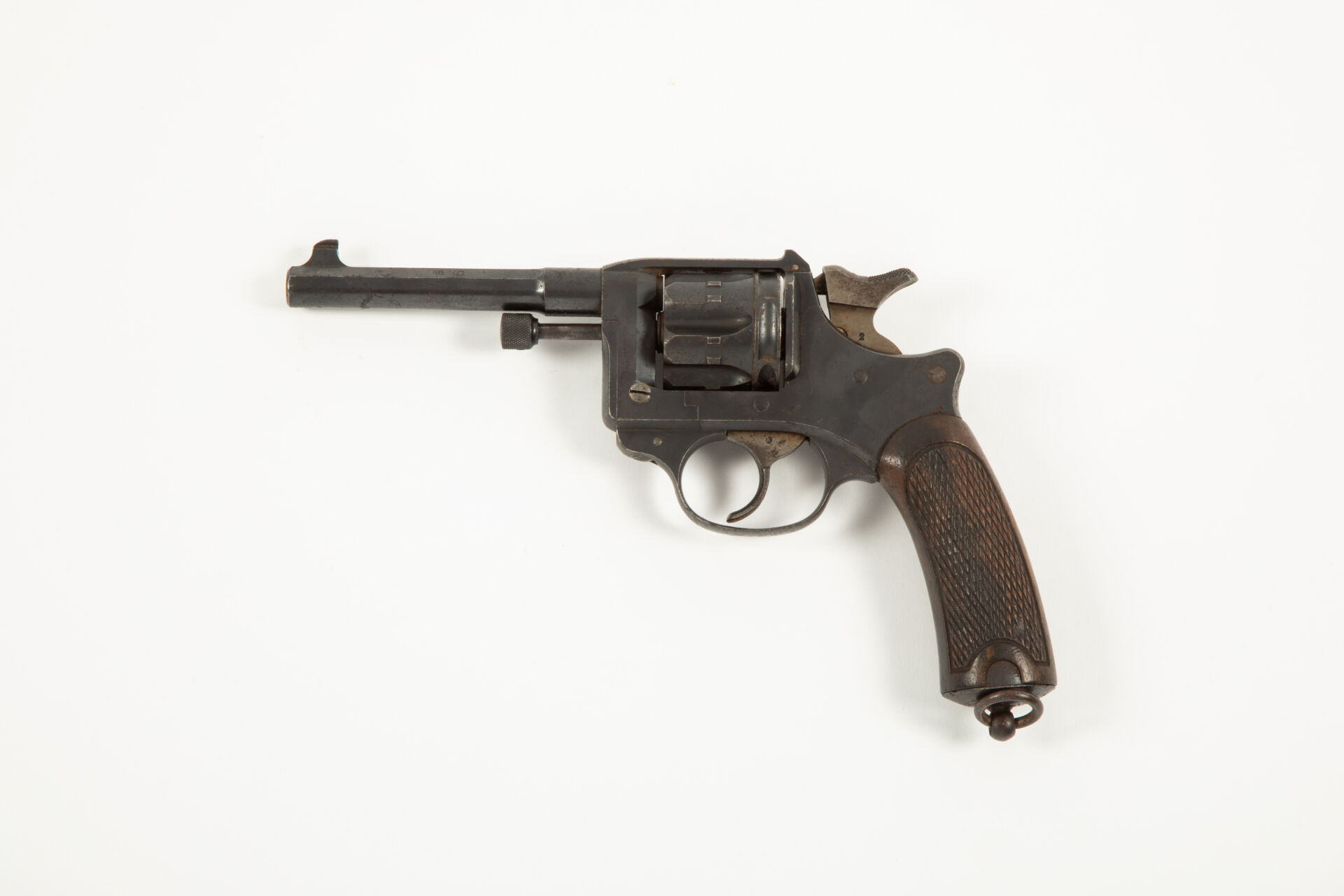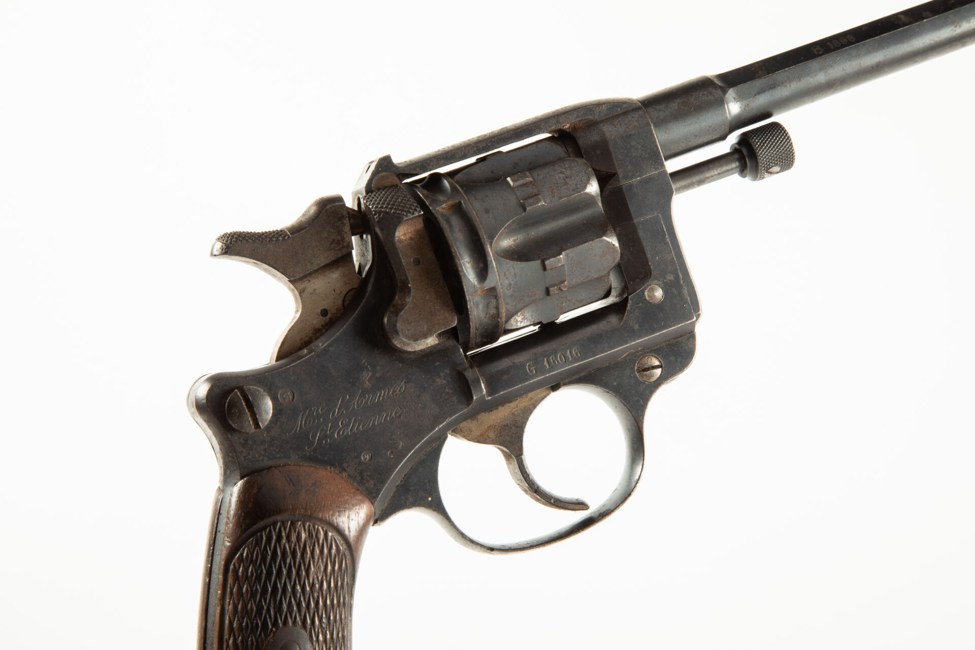 Révolver règlementaire Français modèle 1892 série 1898, canon à nettoyer avec quelques piqures, bronzage présent avec quelques rayures et tâches d’oxydation non pénétrantes, pièces annexes (détente, portière, chien et vis) dans leur jaune paille d’origine. Mécanisme fonctionnel.