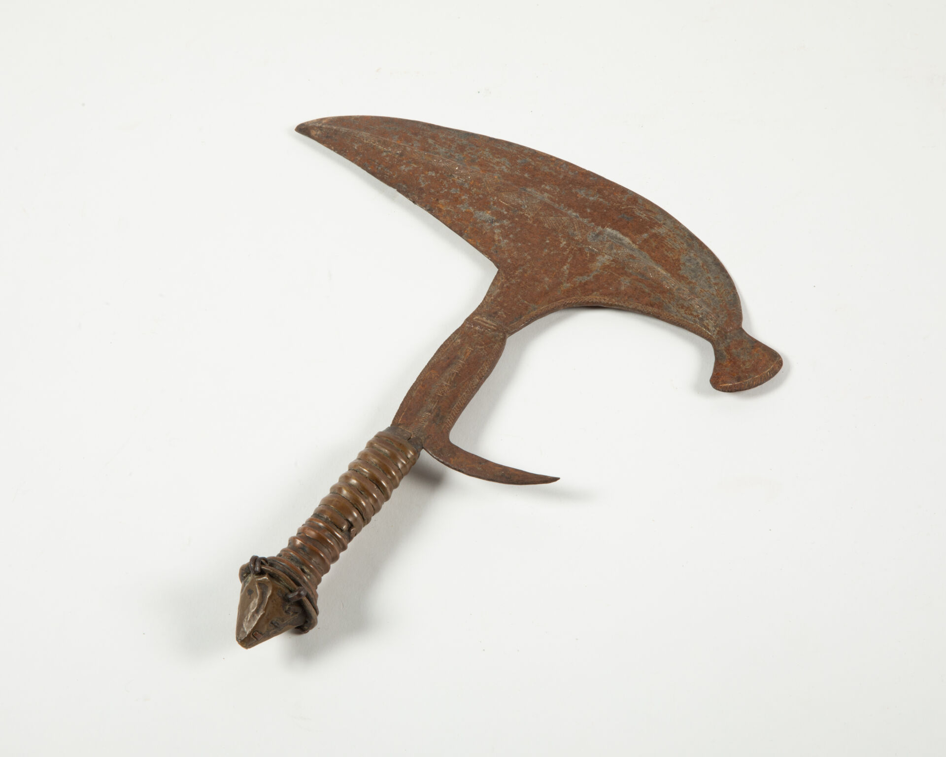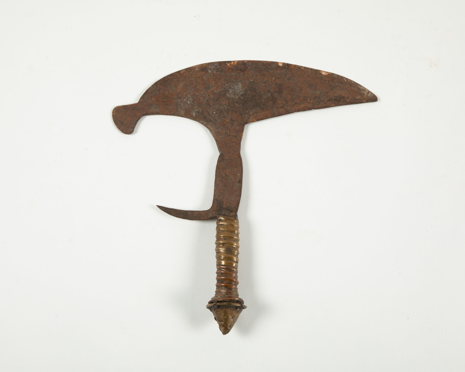 Couteau à tête d’oiseau Kota Nzabi du Gabon, fusée habillée d’un fil de cuivre convexe, pommeau conique, fine gravure au trait sur une face, oxydation.