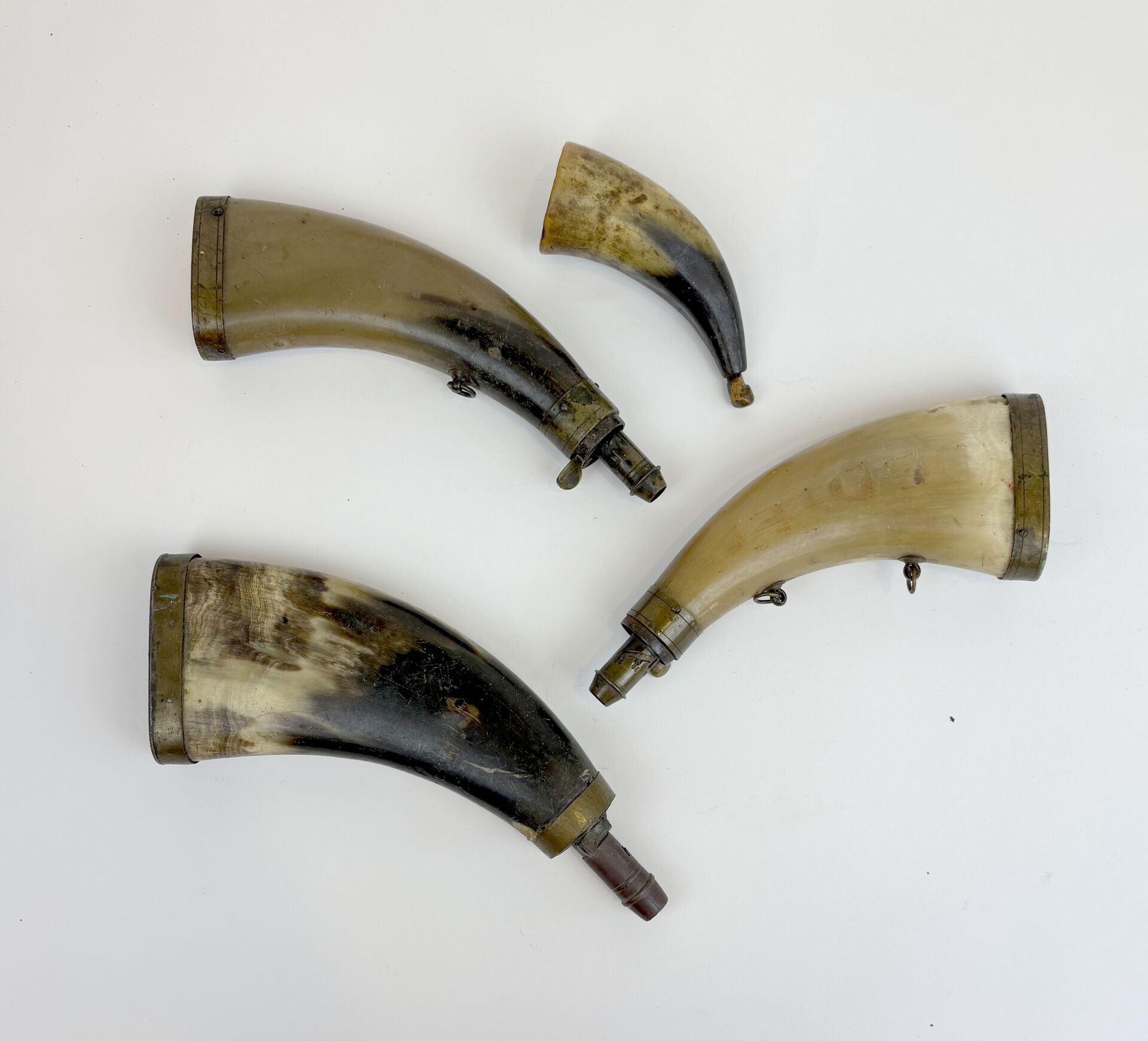 Lot de trois cornes à poudre en corne blonde, une percée, toutes légèrement piquées d’insectes xylophages, avec bouchons doseurs à ressort réglable fonctionnels.