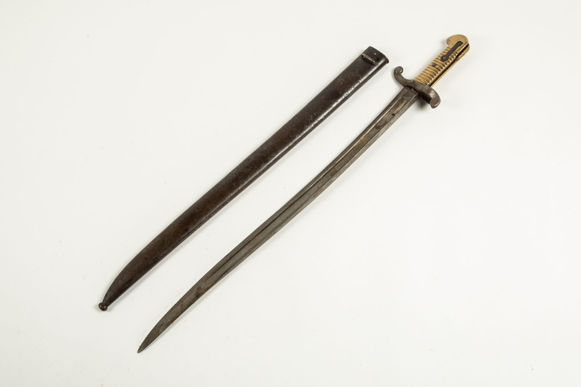 54 ESTIMATION: 100 / 150 € Baïonnette 1842 sans marquage, avec son fourreau, traces de peau d’orange sur la garde, diamètre de la douille de 23 mm environ. Etat 1-