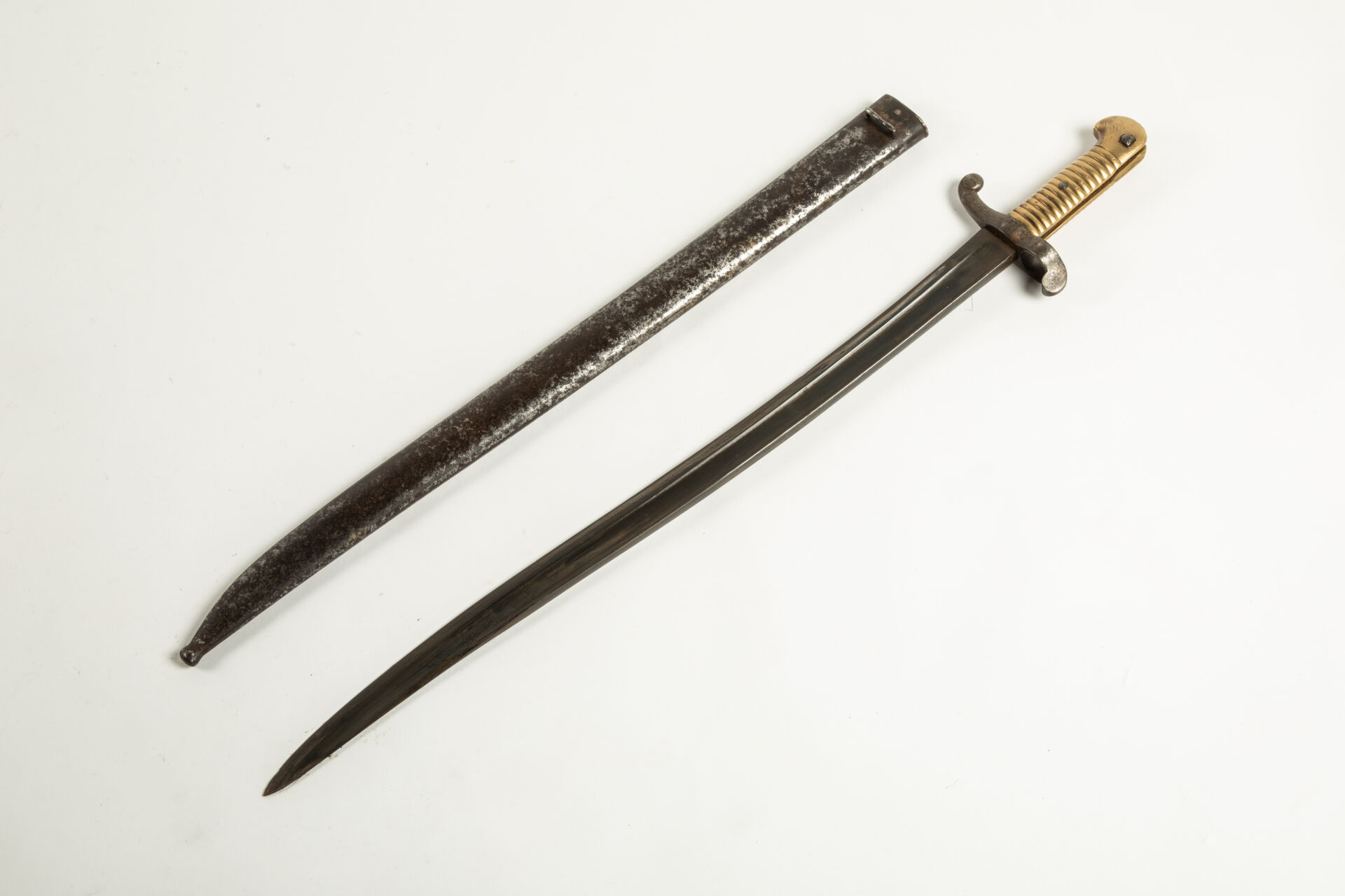56 ESTIMATION: 150 / 200 € Baïonnette 1842, marquée Manufacture Impériale de Châtellerault Mars 1865, modèle 1842 avec son fourreau, diamètre de la douille de 23 mm environ Etat 1-