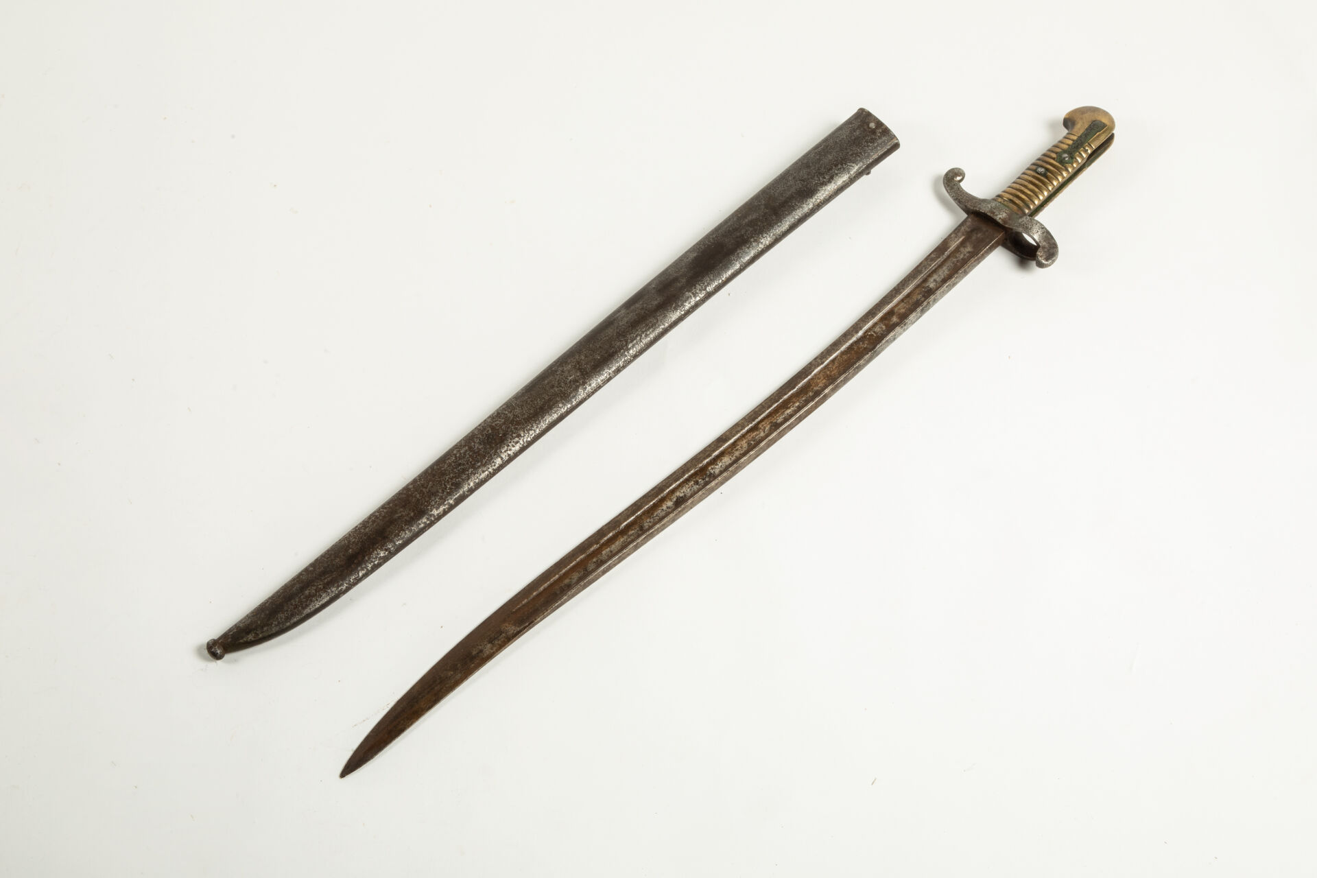 Baïonnette 1842, marquage partiel de la Manufacture impériale de Châtellerault avec son fourreau, traces de peau d’orange sur le garde, la lame et le fourreau, douille faussée vers l’arrière, diamètre de douille de 25 mm environ.