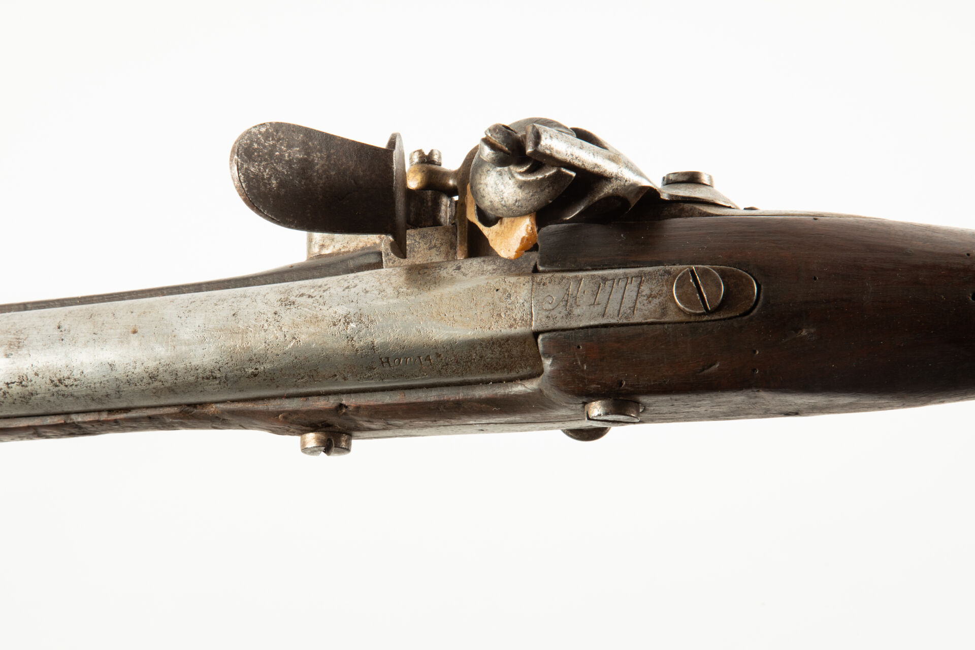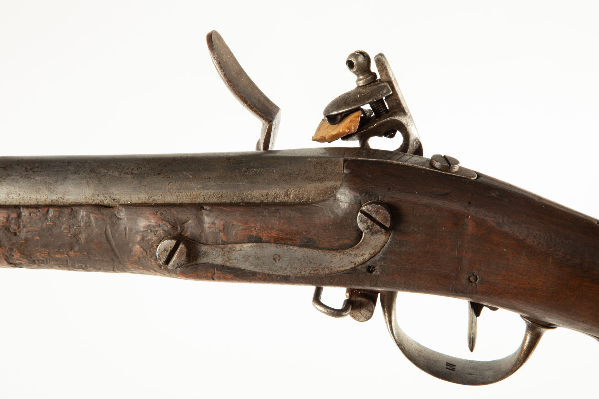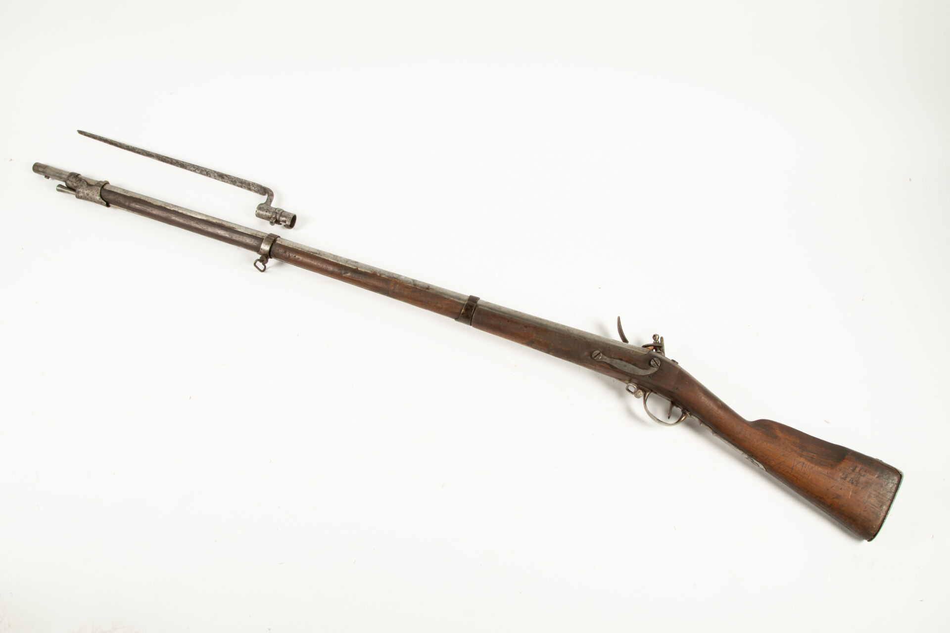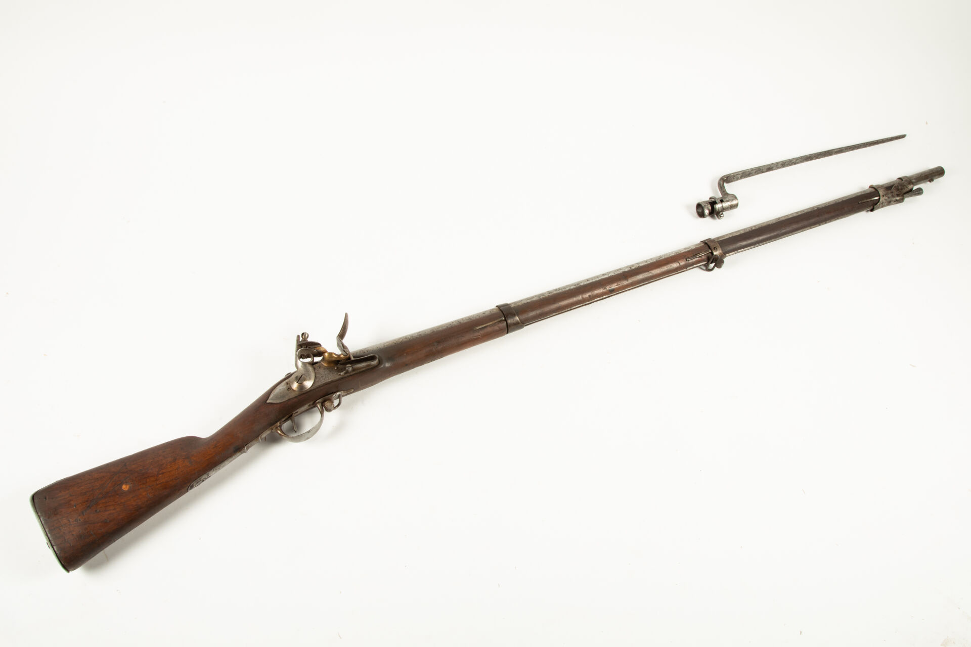 Fusil d’infanterie à silex type 1777 corrigé An IX de la Manufacture Impériale de Liège (marquage peu visible sur la platine), la queue de culasse porte un grand marquage modèle 1777, peau d’orange uniforme sur toutes les pièces, avec une baïonnette à douille épointée, mécanisme fonctionnel.