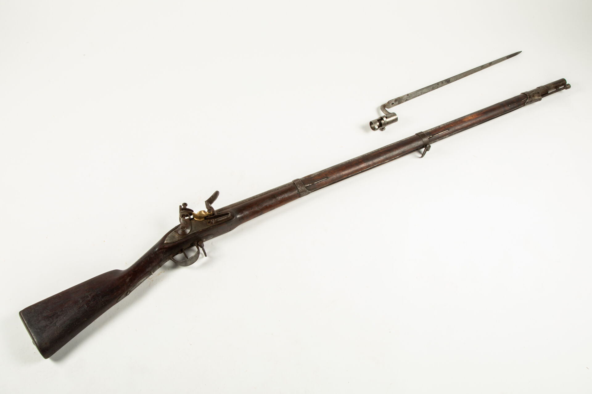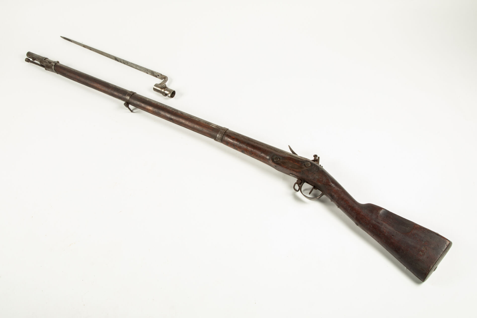 Fusil modèle 1816 à silex, platine vierge de marquages, embouchoir fer, guidon laiton, quelques piqures et légère peau d’orange uniforme, un seul cran d’armé ?, avec sa baïonnette