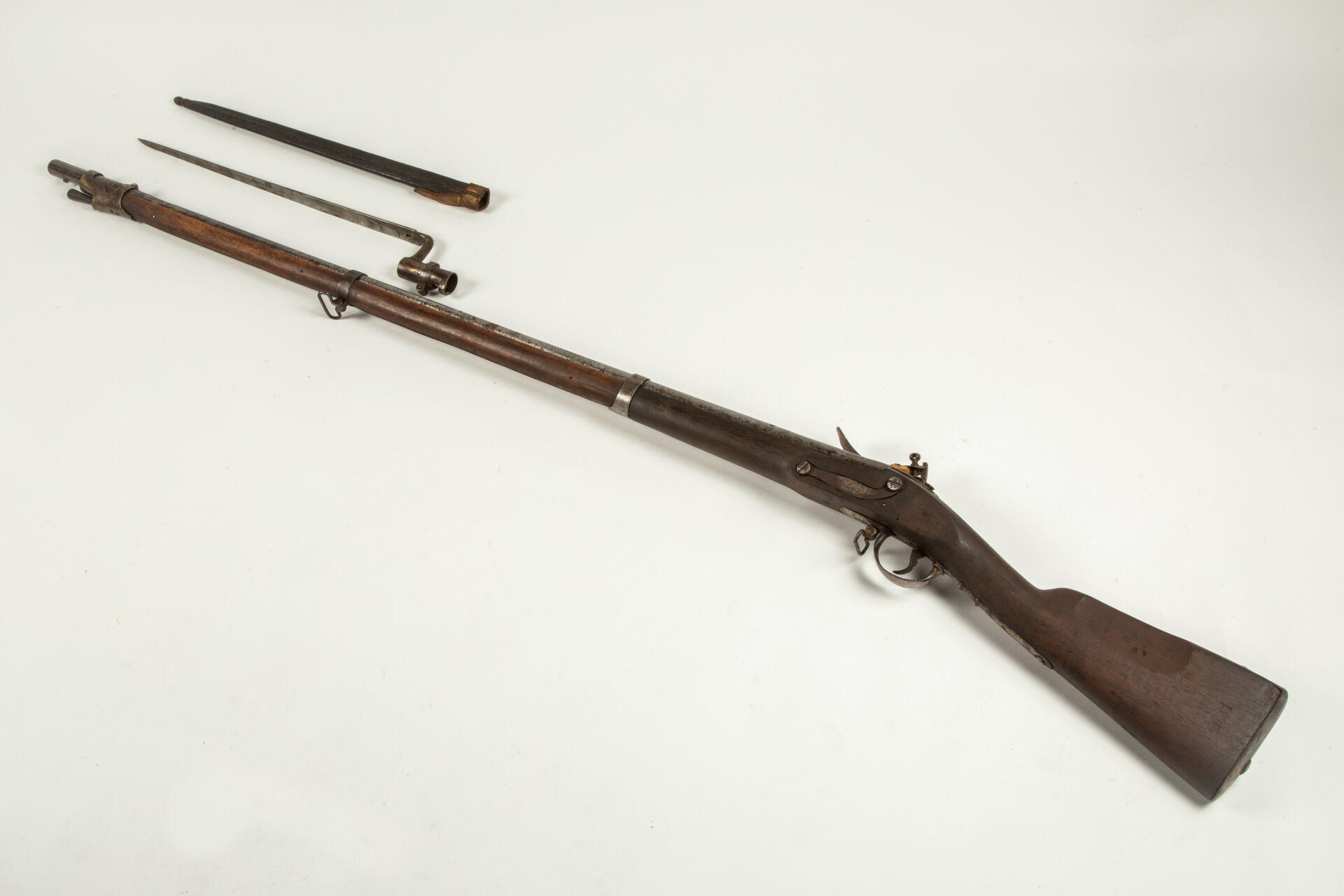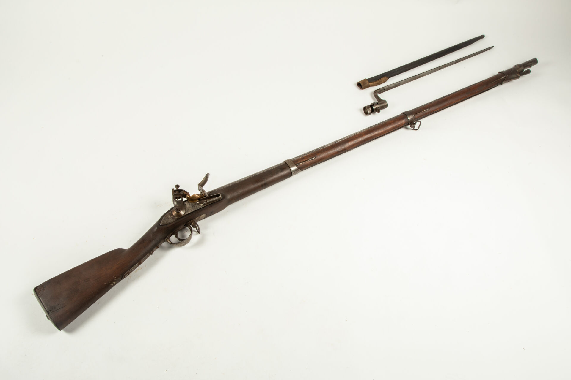 Fusil d’Infanterie modèle 1816 à silex, platine signée « Manufacture Royale de Tulle », embouchoir fer, guidon laiton, quelques piqures et légère peau d’orange uniforme, avec sa baïonnette et son fourreau, vis de queue de culasse à refixer, léger éclat à la mise en bois à gauche de la queue de culasse, mécanisme fonctionnel