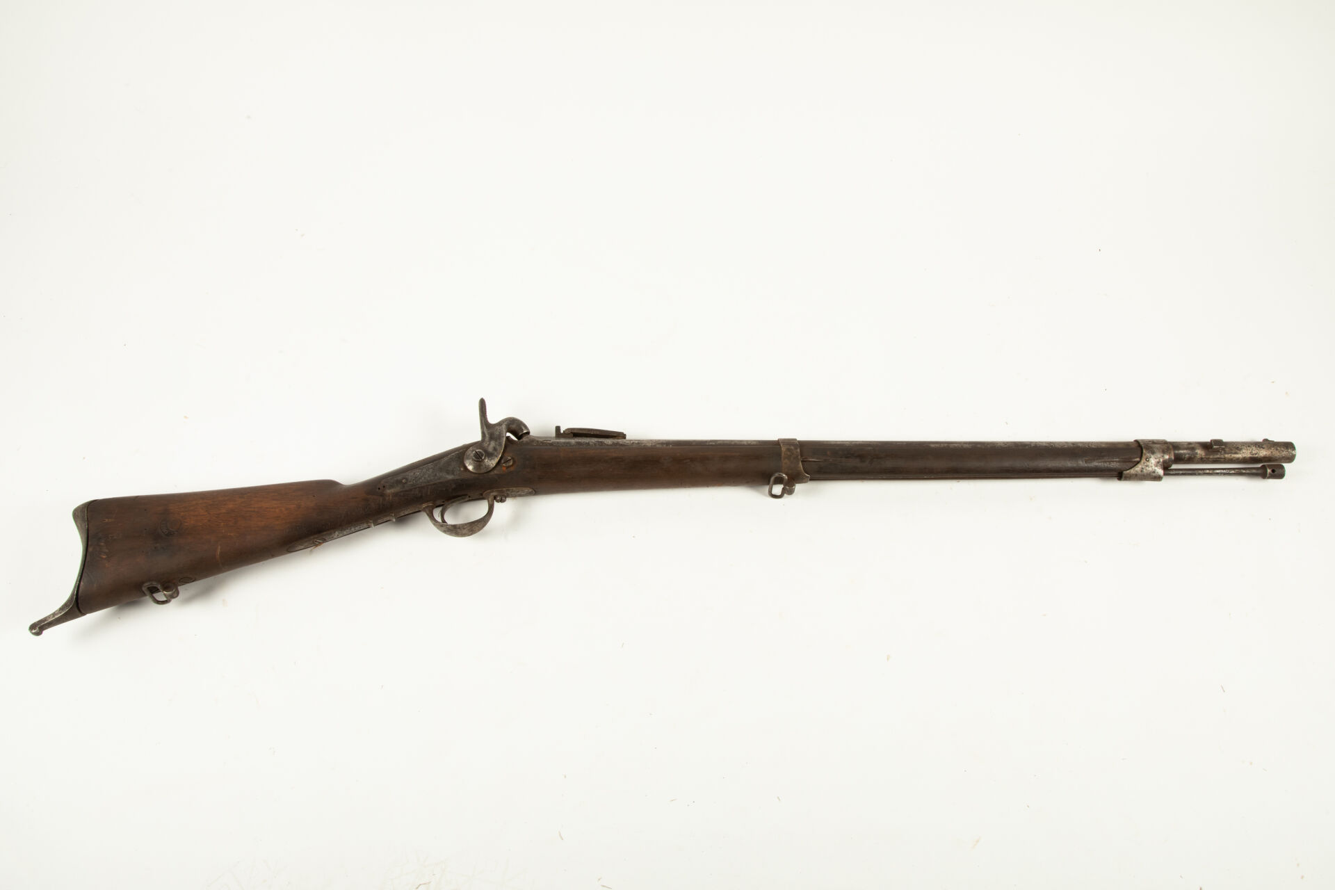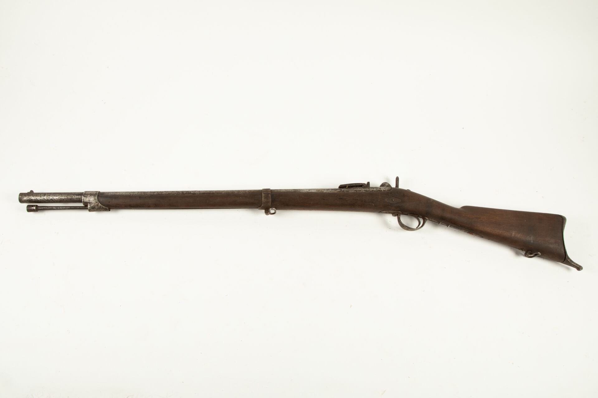 Fusil de rempart modèle 1840 allégé, fabrication Manufacture Royale de Mutzig, canon daté 1842, hausse fixe et un volet rabattable à quatre découpes en forme de coeur, directrice de baïonnette, baguette à tête cylindrique percée type 1840, toutes garnitures fer, plaque de couche à croc, légère peau d’orange généralisée, mécanisme fonctionnel.
