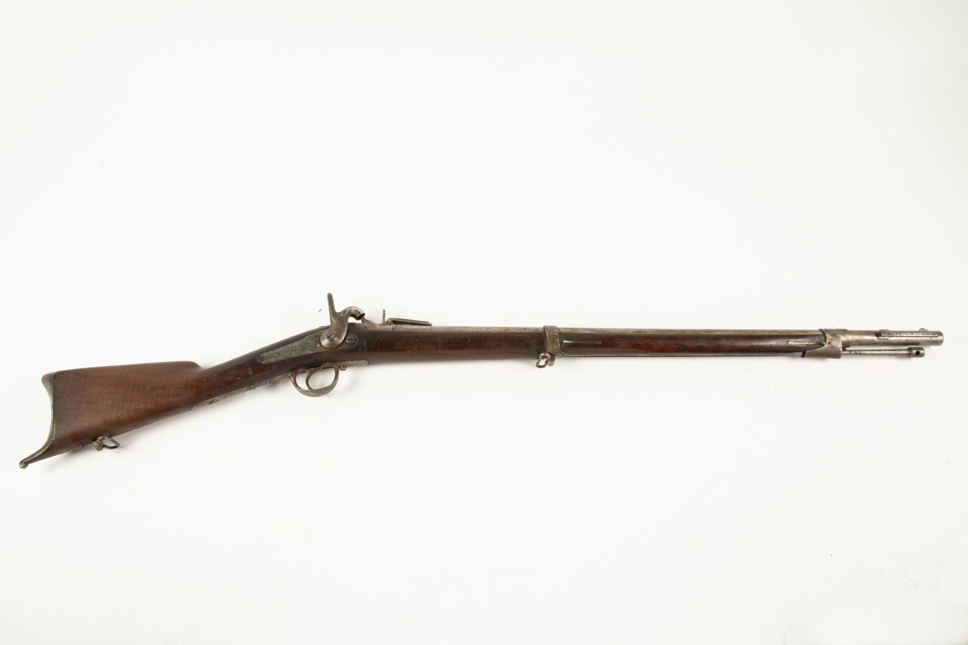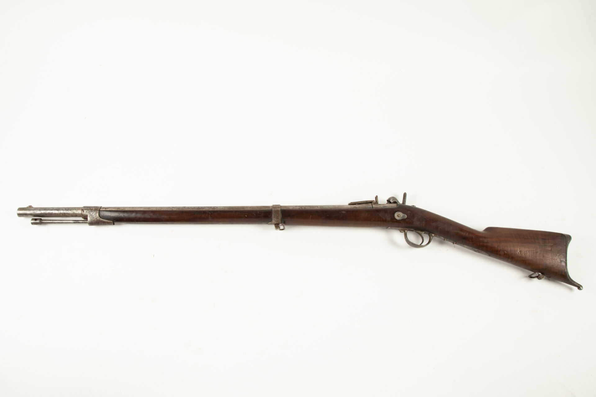 Fusil de rempart à percussion modèle 1842 issu de la Manufacture Nationale de Châtellerault comme l’indique le marquage sur la platine à l’arrière, canon doté d’une hausse, cheminée sur masselotte, chien à facettes, le canon a été dévissé de sa culasse et demande a être revissé d’un tour supplémentaire, toutes garnitures fer, directrice de baîonnette, baguette, plaque de couche à croc, mécanisme fonctionnel