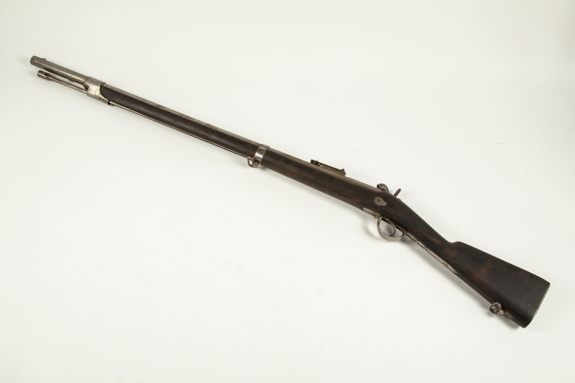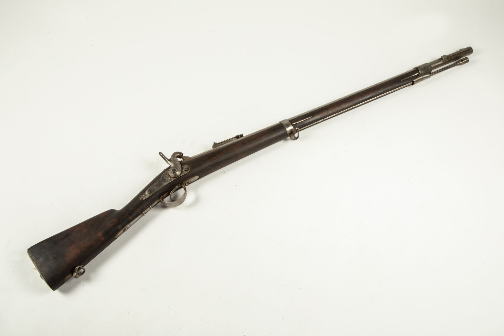 Intéressante carabine règlementaire rayée modèle 1846, fabrication Manufacture Royale de Châtellerault, queue de culasse bien marquée modèle 1846, hausse graduée jusqu’à 1100 mètres, tenon de baïonnette, avec sa baguette modèle 46/53, toutes garnitures fer, monture en noyer huilée, quelques piqures sans gravité sur le corps de platine, si non arme en bel état , mécanisme fonctionnel.