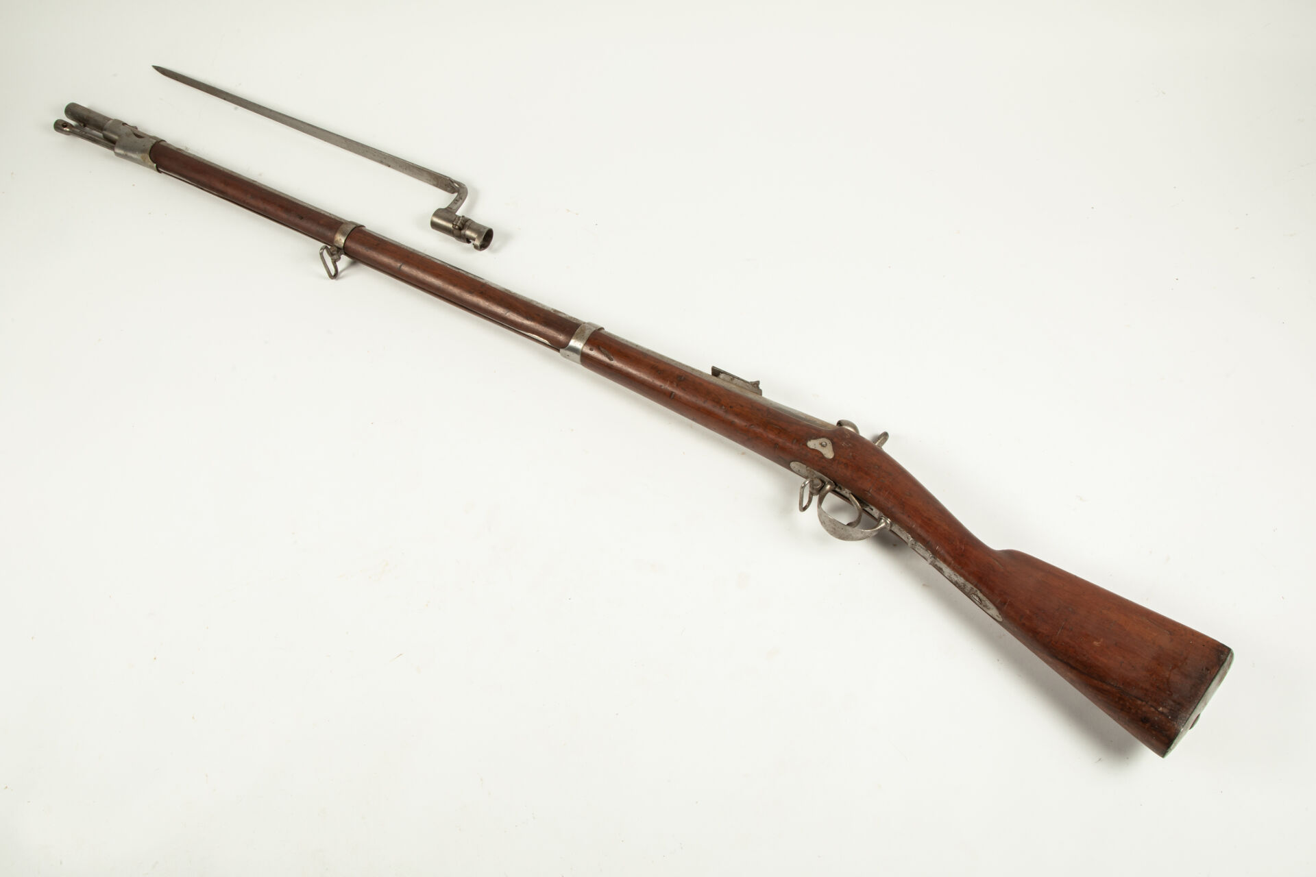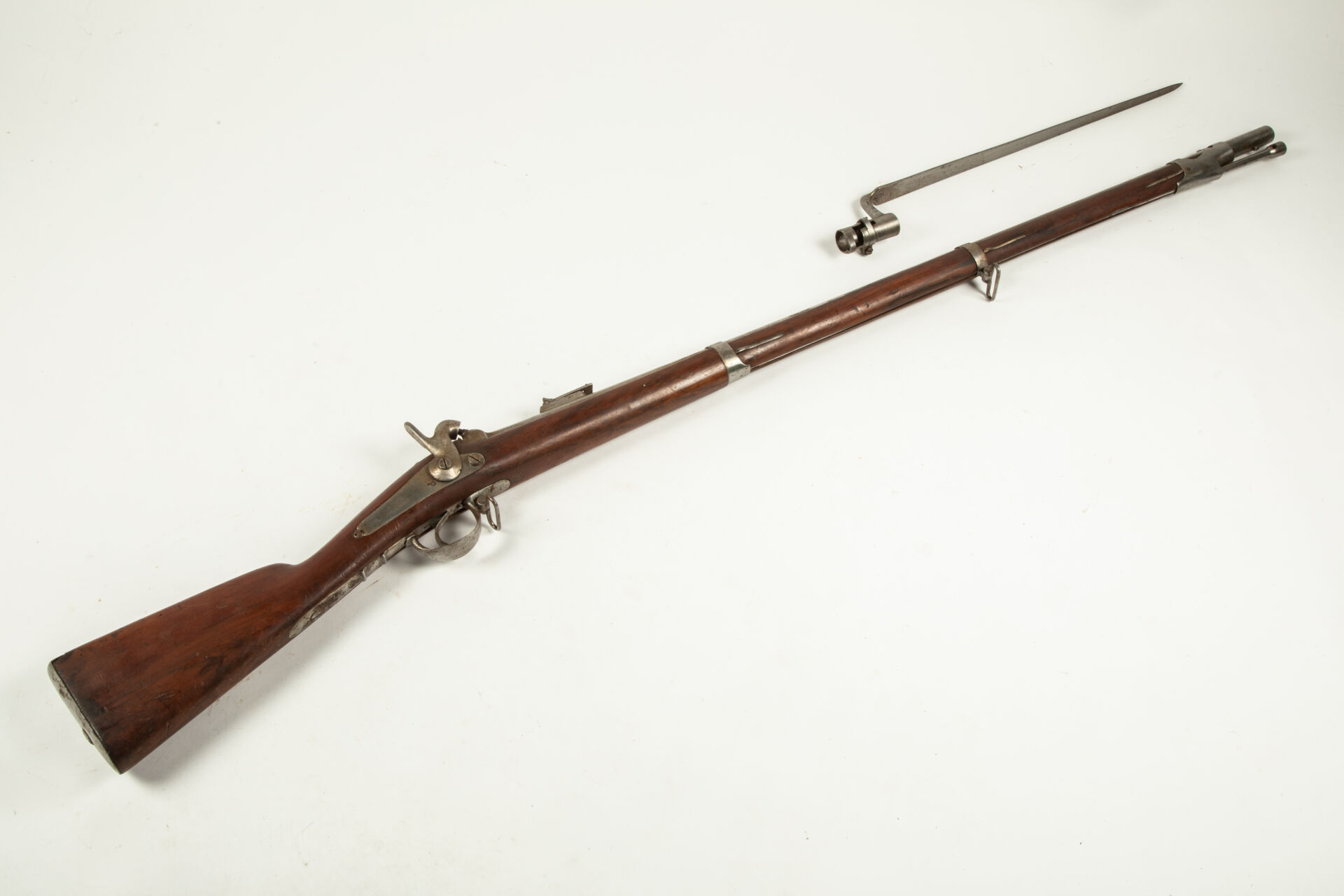 Rare fusil à percussion et platine à l’arrière de voltigeur modèle 1848 à tige, arme issue de la Manufacture Royale de Châtellerault, hausse avec planchette graduée jusqu’à 800 m, queue de culasse marquée modèle 1848, canon daté 1849, avec sa baguette et une baïonnette à douille, arme montée fer, mécanisme fonctionnel, belle monture avec quelques attaques d’insectes xylophages, pas de macaron de crosse. Arme peu courante.