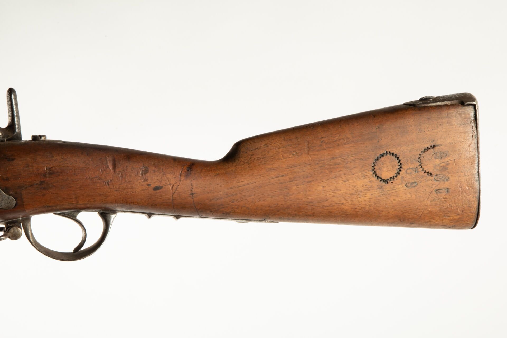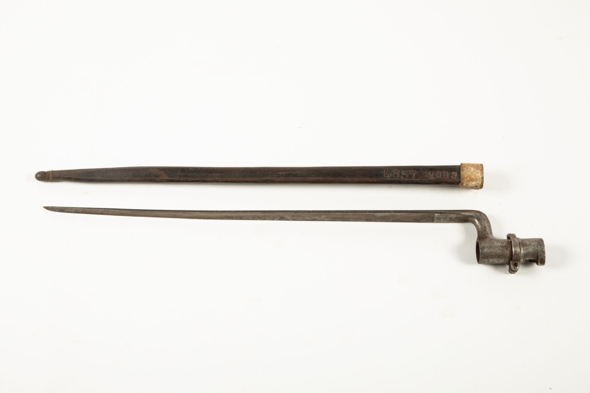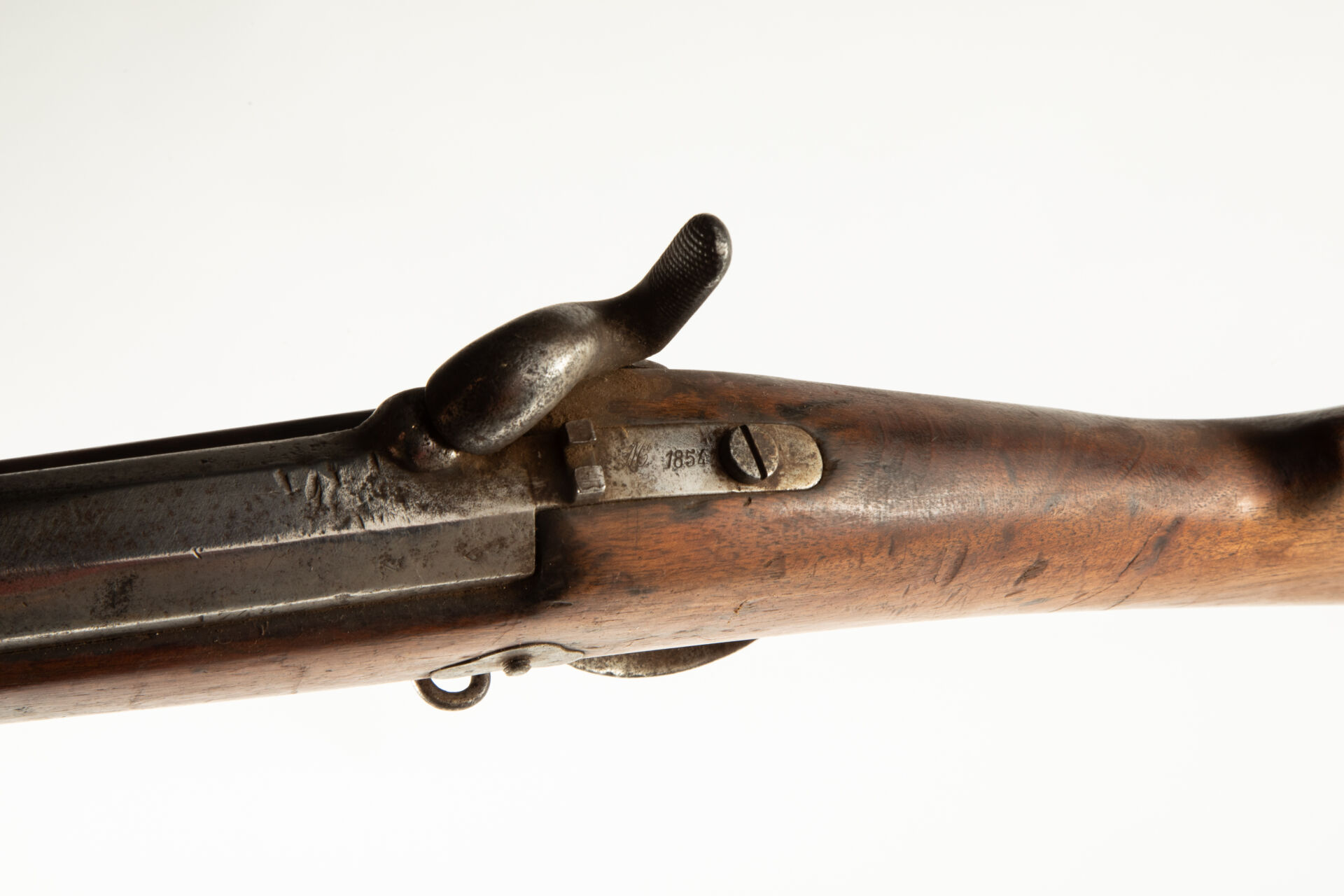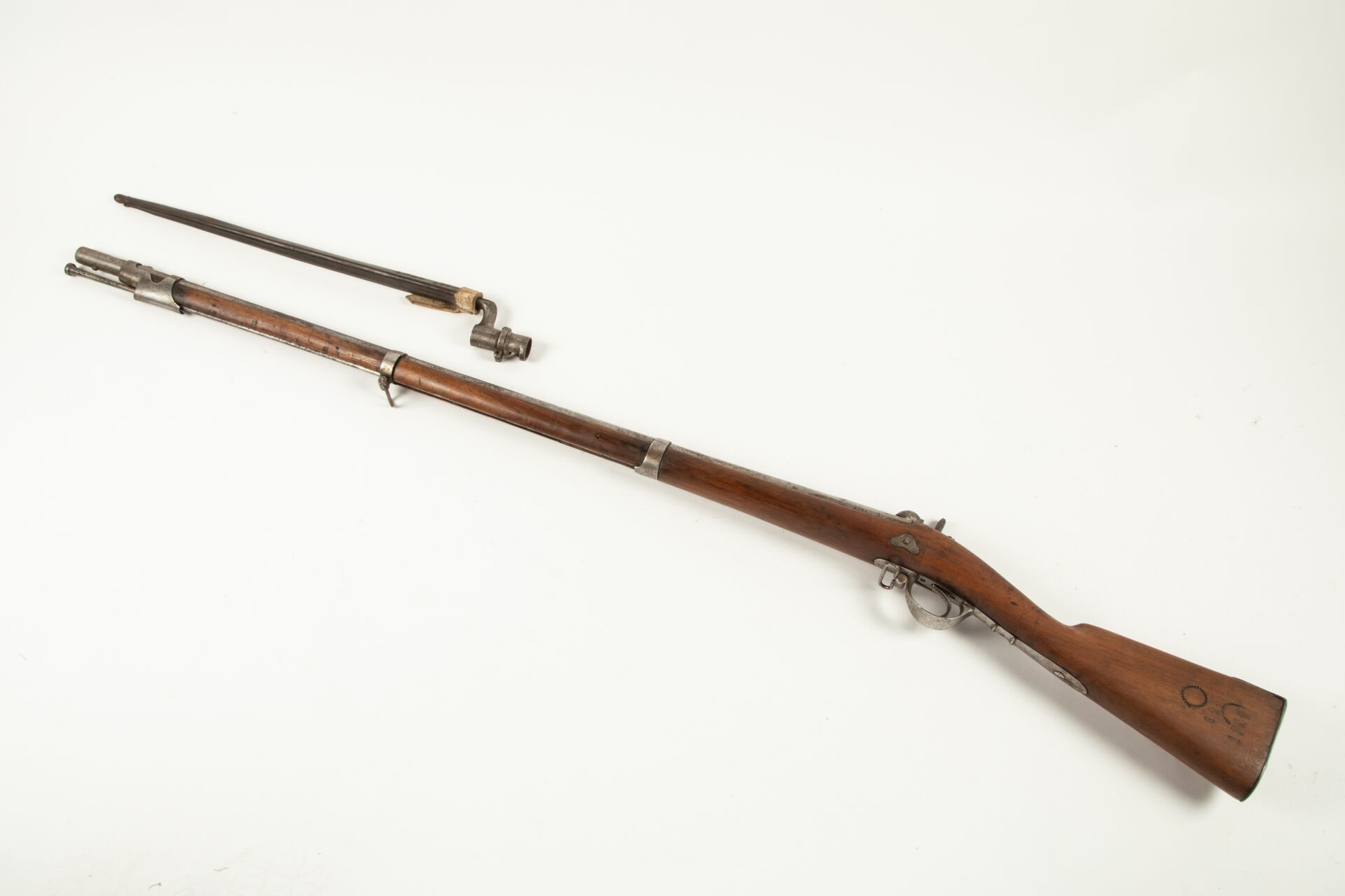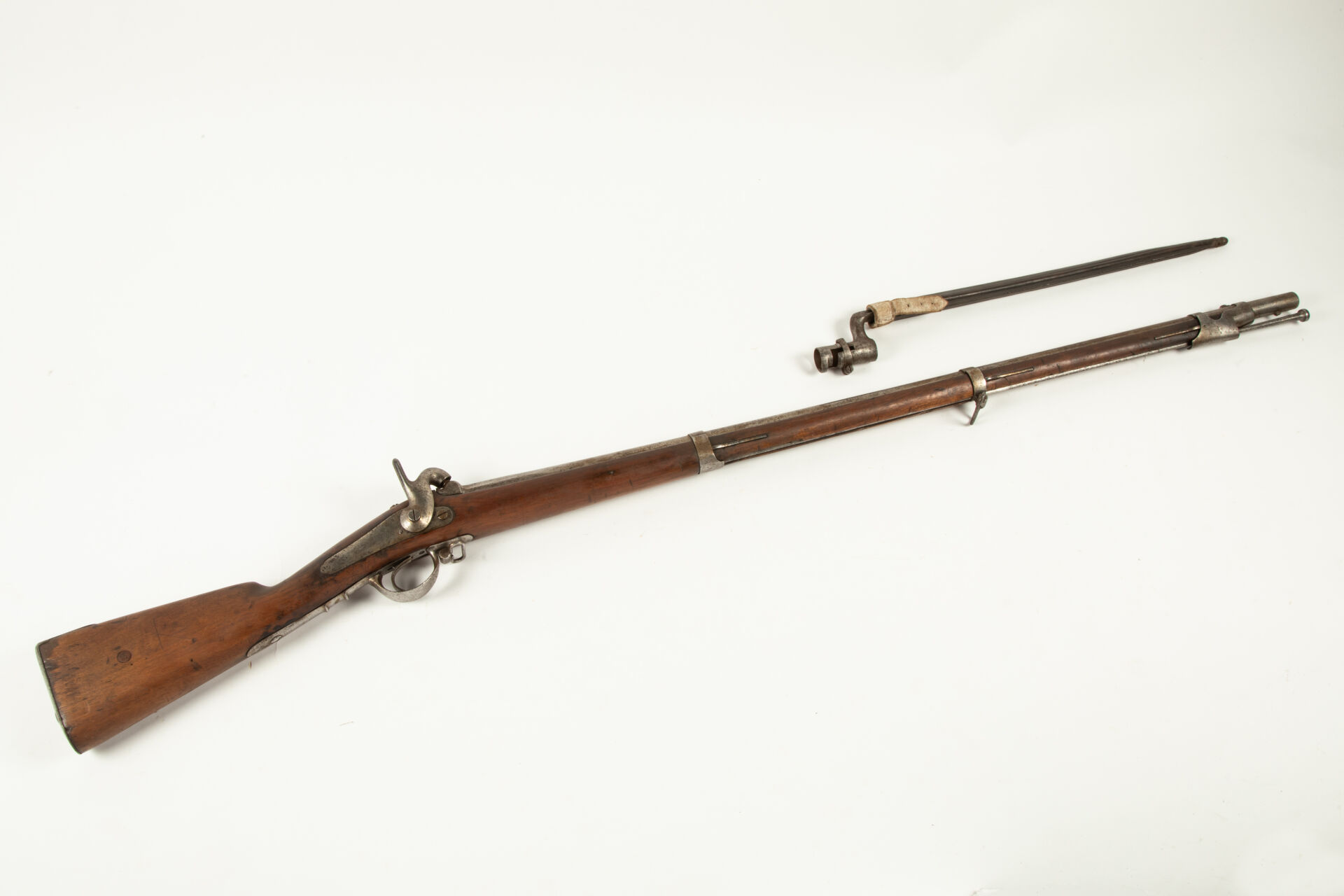 Intéressant fusil de voltigeur modèle 1854 dit de la Garde Impériale, longueur totale de l’arme 1421 mm, canon de 1030, corps de platine marqué Manufacture impériale de Châtellerault, queue de culasse marquée 1854, toutes garnitures fer, guidon sur canon, baguette tête de clou avec une baïonnette à douille type 1822 et son fourreau à chape de bufflèterie blanche, mécanisme fonctionnel, légère oxydation.