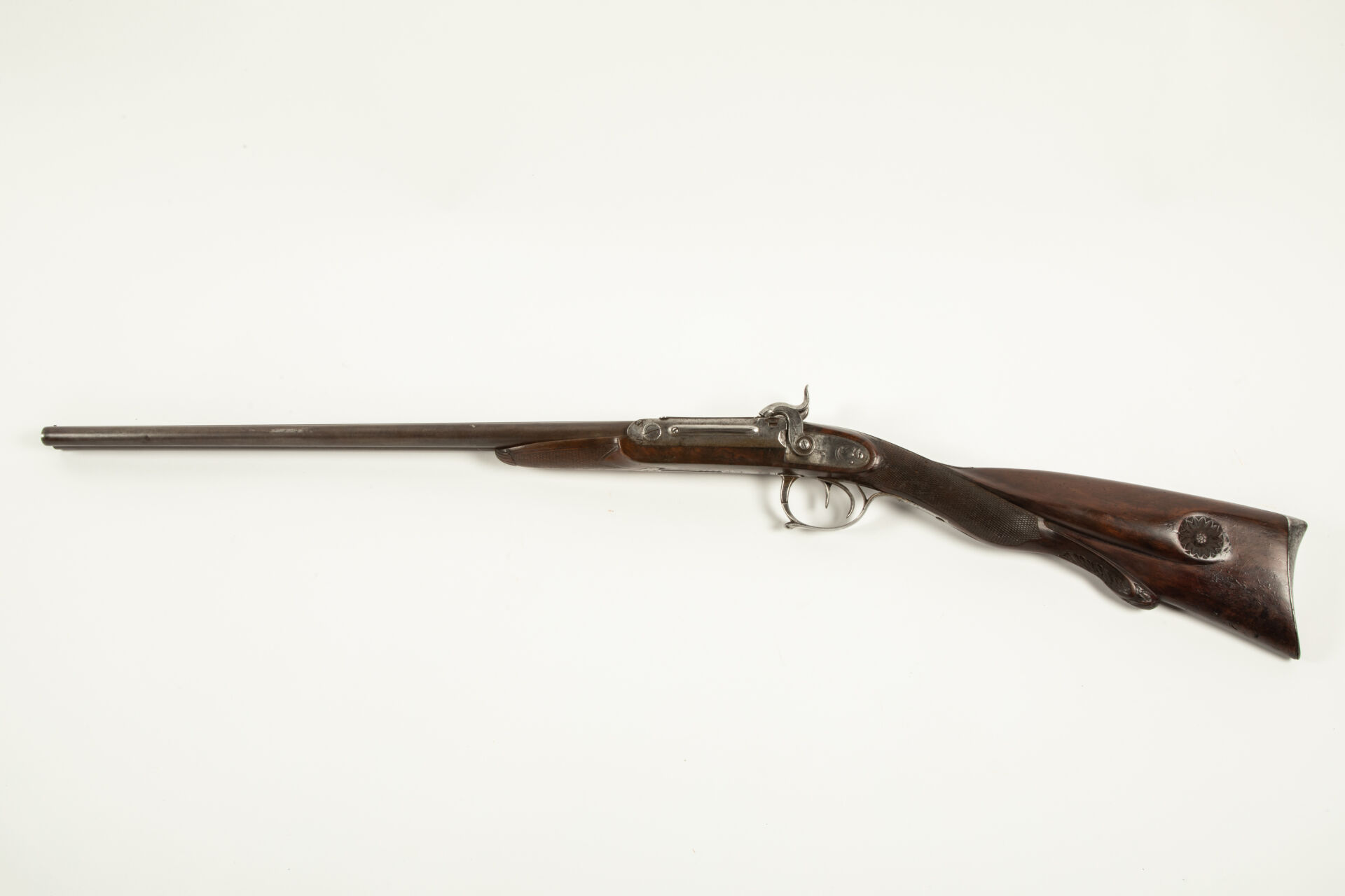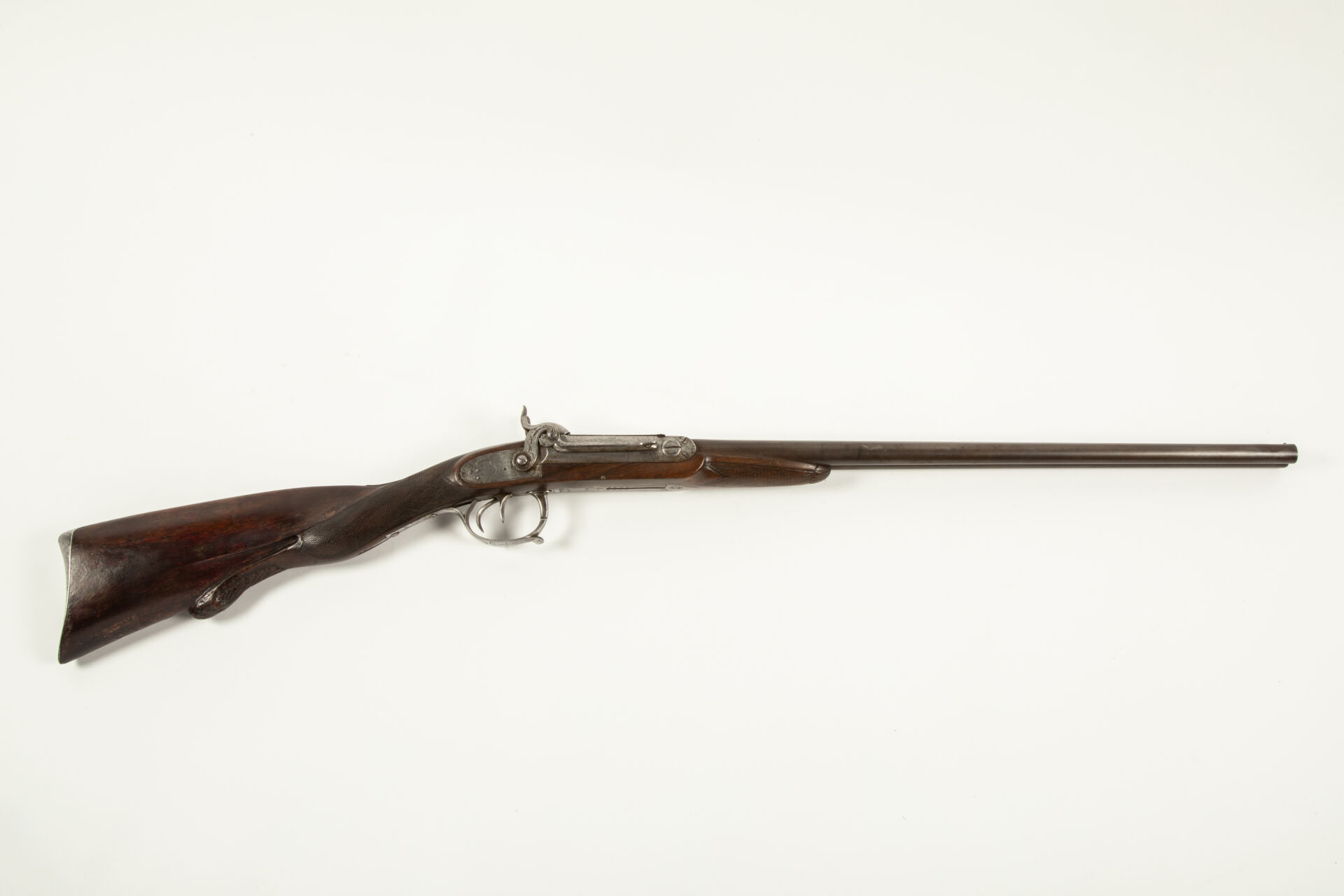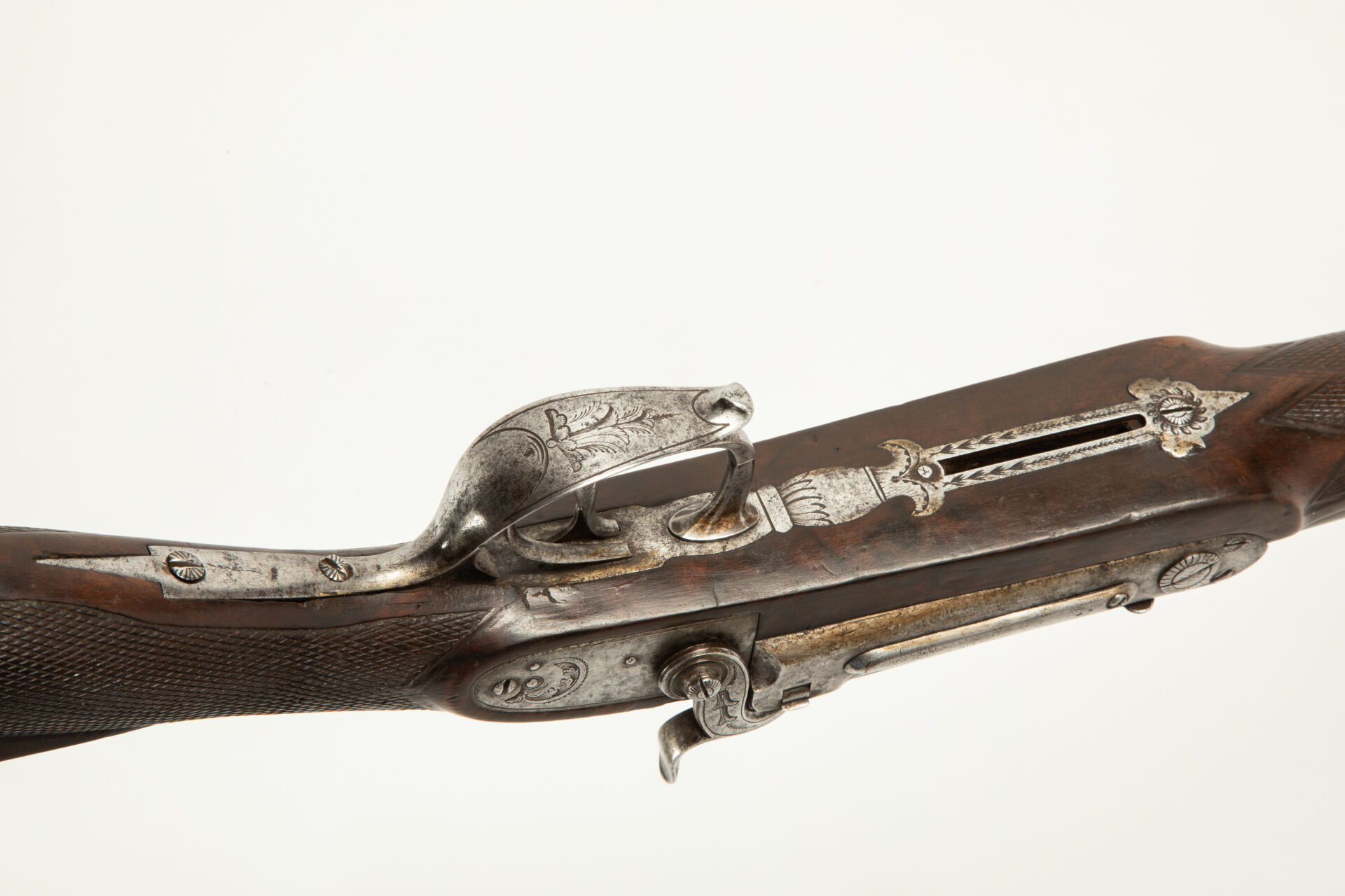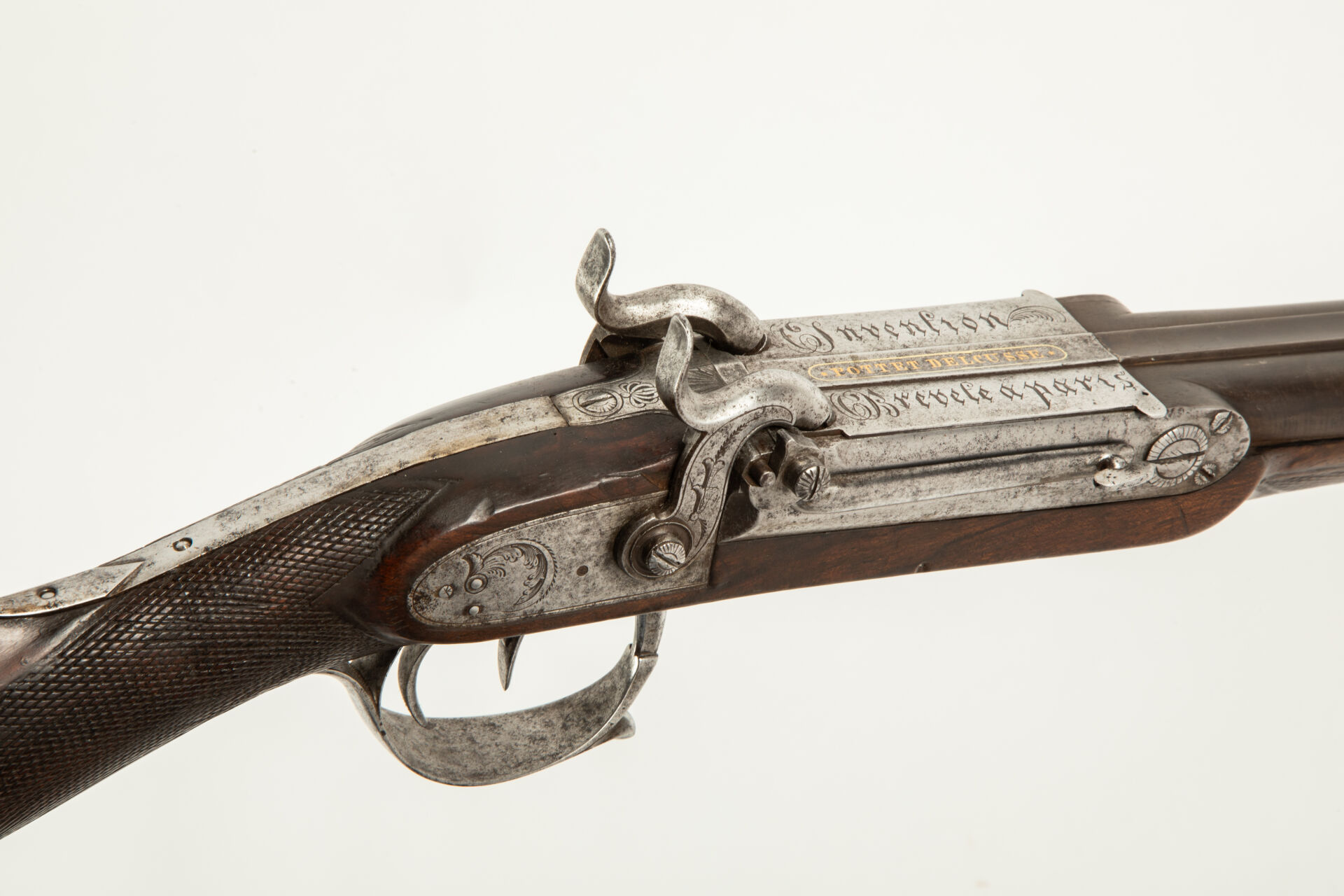 Très joli petit fusil juxtaposé à système à chargement par la culasse POTTET DELCUSSE, canon rond en damas feuille morte au calibre de 28 balles à la livre, inusuel système à chargement par la culasse, un levier latéral à droite lorsqu’on le positionne en position verticale permet de faire pivoter une cale bloquant deux chambres articulées permettant leur chargement, ces deux chambres portent les cheminées et un important marquage « Invention » sur la chambre gauche « breveté à Paris » sur la chambre droite et, dans un cartouche ovale, les lettres dorées portant le nom de l’inventeur « POTTET DELCUSSE ». Demi-platine à percussion à l’arrière, arme montée fer, légère gravure florale sur toutes les pièces, crosse demi-pistolet à bec de canard dans le prolongement du col, quadrillée à la poignée et au devant, reprise de quadrille à la poignée à droite, joue à gauche, quelques reprises de vernis camouflant des manques, cheville bouchant l’emplacement de la grenadière de crosse, extrémité du devant portant une capuche fictive dans la masse en forme de coquille Saint Jacques. Mécanisme fonctionnel.