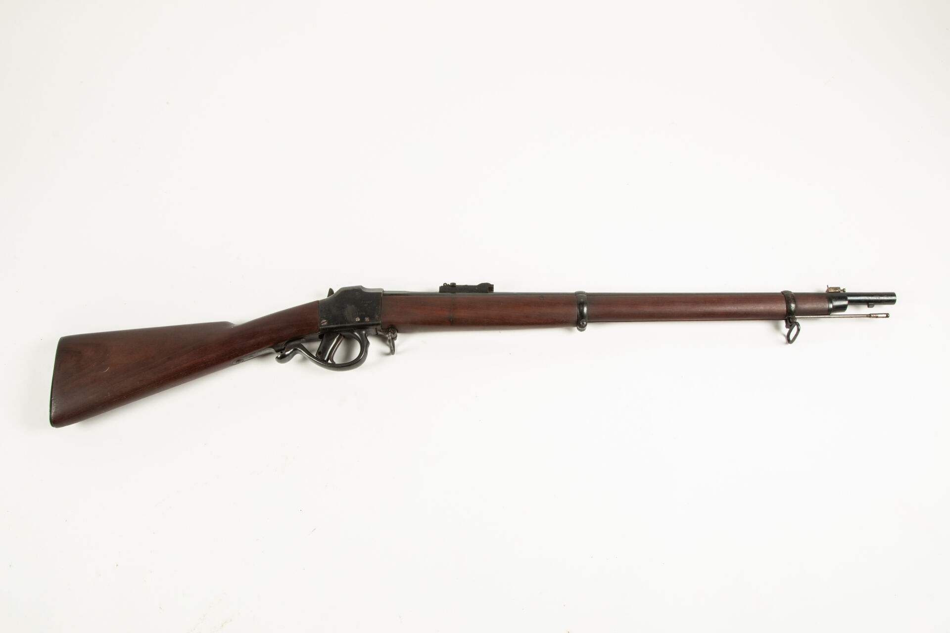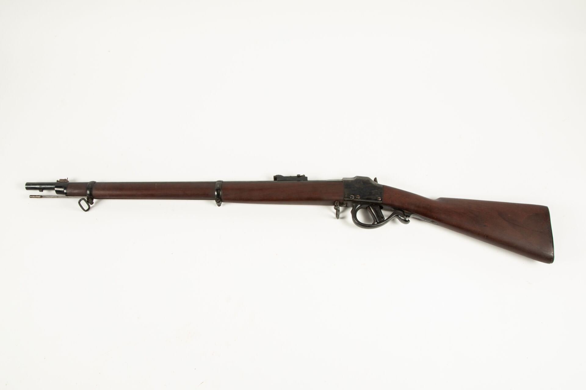 Carabine à bloc tombant Comblain, calibre 11 mm, canon rayé octogonal au tonnerre puis rond de 650 mm avec tenon de baïonnette et guidon additionnel démontable, hausse réglable, ensemble rebronzé, crosse anglaise, garniture bronzée, avec sa baguette. Mécanisme fonctionnel.