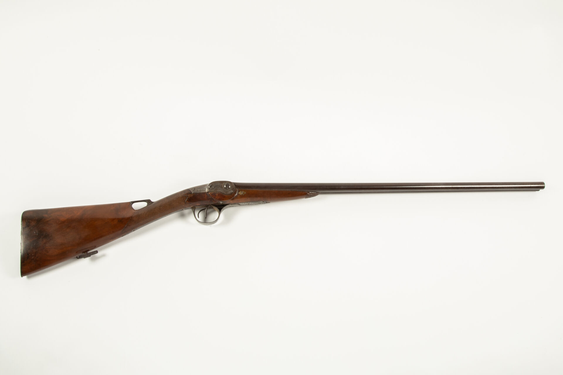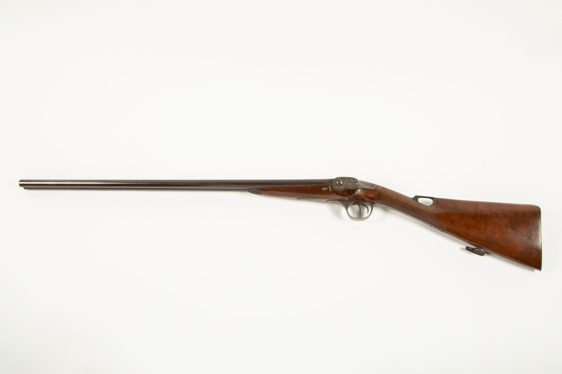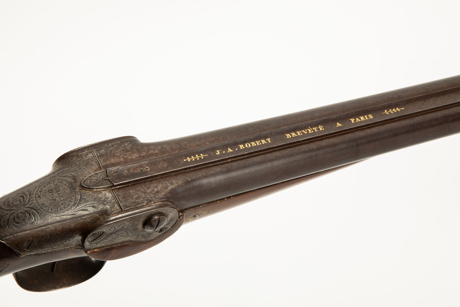 Joli fusil juxtaposé à système par « J. A. ROBERT breveté à Paris » comme en atteste le beau marquage à l’or en lettres majuscule sur la bande des canons, canons en table en damas filé au calibre de 24 balles à la livre finition feuilles mortes, canons de 745 mm de long. Le brevet robert portant sur un système de chargement par la culasse c’est donc tout naturellement que nous trouvons sur ce fusil un bloc culasse ascensionnel découvrant deux chambres et se verrouillant par l’entremise d’un anneau plat articulé et d’un ressort au niveau du busc de la monture, la culasse porte, dans le prolongement de la bande, un marquage dans un cartouche rond « Académie de l’Industrie Française, médaille d’or », garnitures gravées de palmettes, monture à l’anglaise, quadrillé plate à la poignée, capuche dans la masse en coquille Saint Jacques, vernis postérieur, mécanisme fonctionnel.