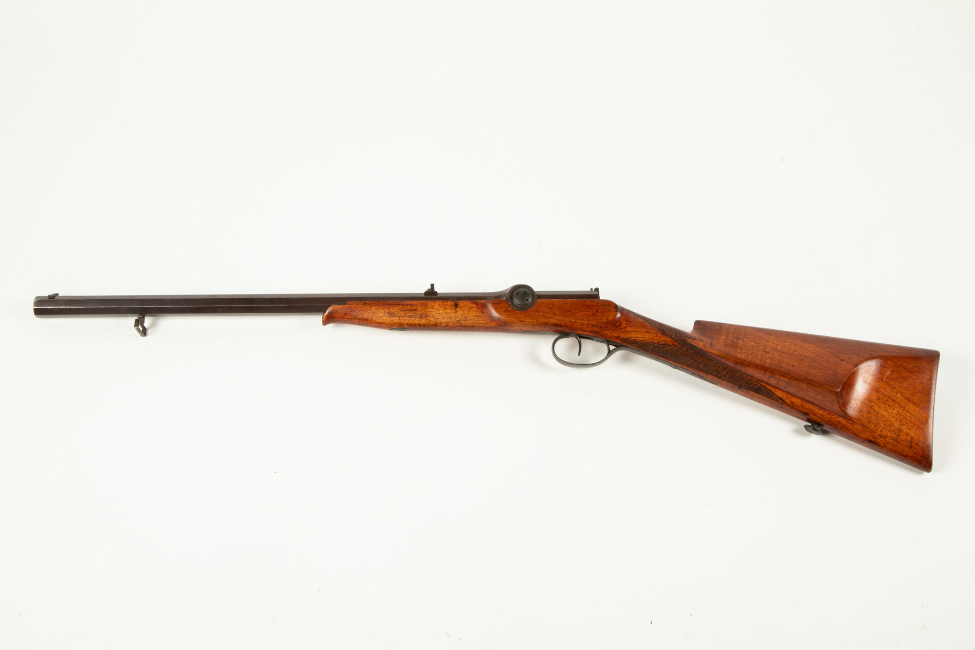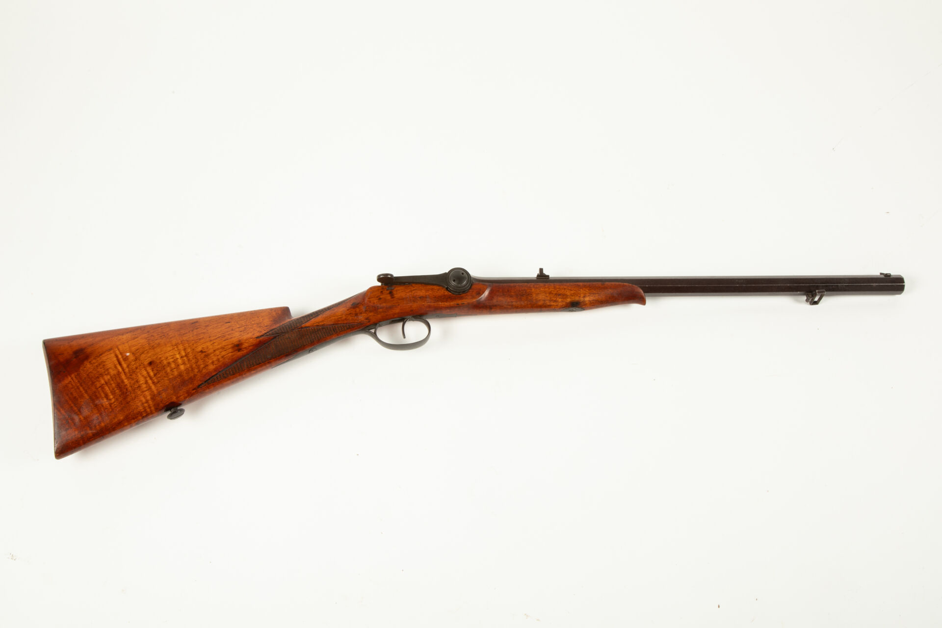 Belle et inusuelle carabine à système Dreyse, fort canon octogonal rayé finition feuille morte au calibre de 58 balles à la livre (Cal 0.34 comme l’indique le marquage sur le flanc droit de la culasse), hausse et guidon réglables, au niveau de la chambre, le canon est renforcé, une culasse mobile est insérée dans un renfort, en basculant le levier vers le bas, on découvre une chambre rotative dans laquelle on introduit la cartouche. Cette arme fonctionne avec un mécanisme à aiguille lancée, système qui fut employé plus tard sur le fusil règlementaire Dreyse, belle monture tout bois en noyer vernis quadrillée à la poignée, joue à gauche, pontet rond. Mécanisme fonctionnel.