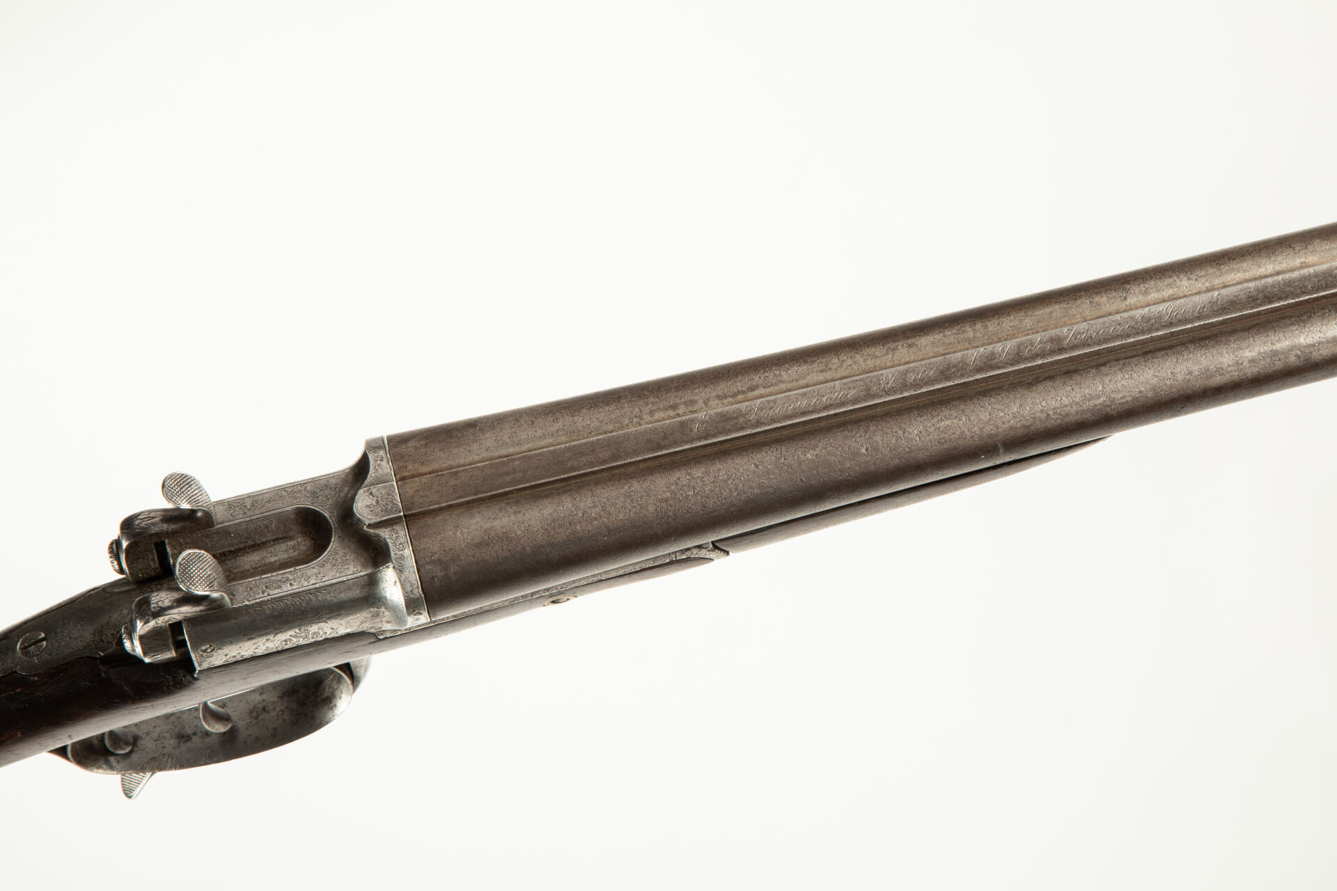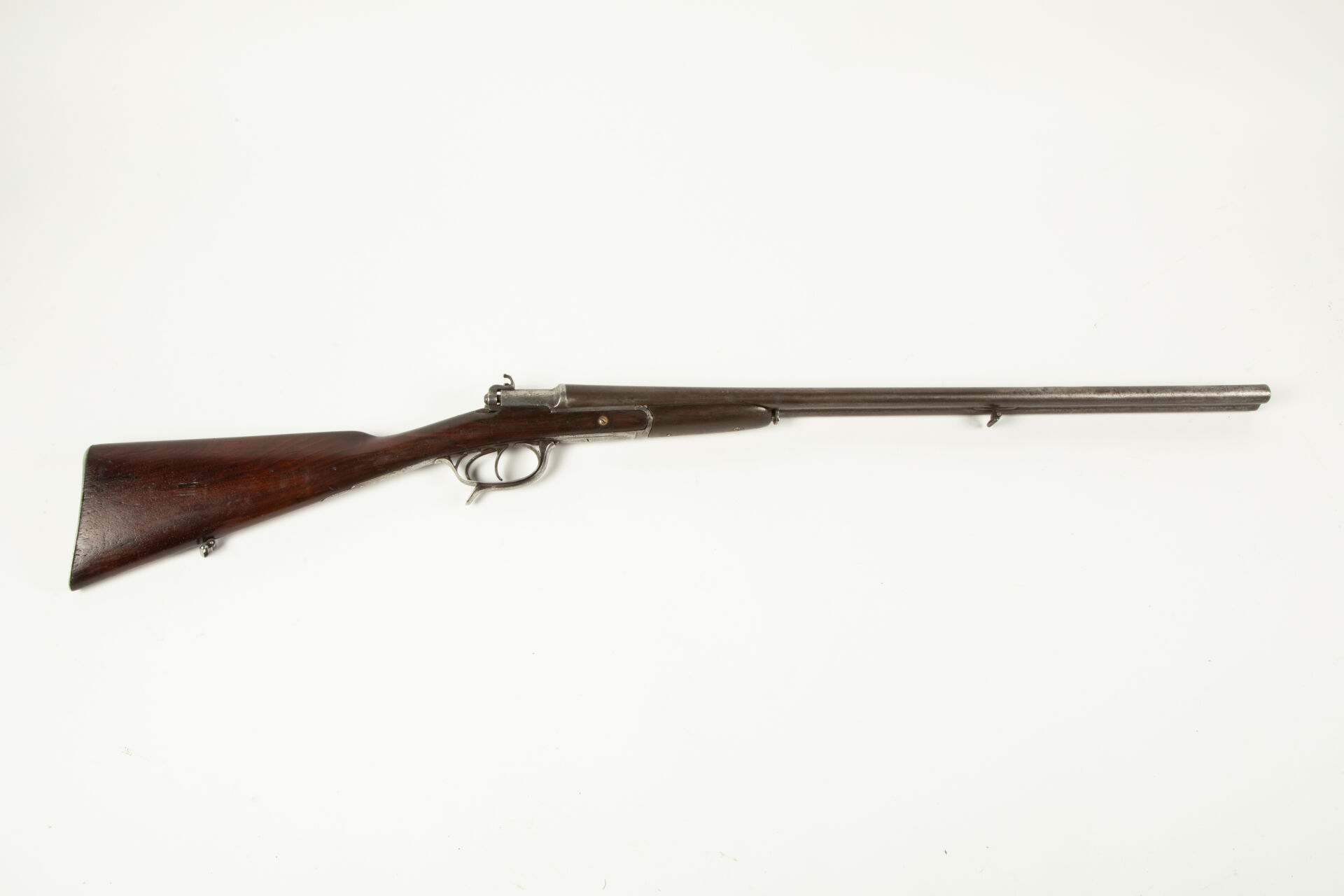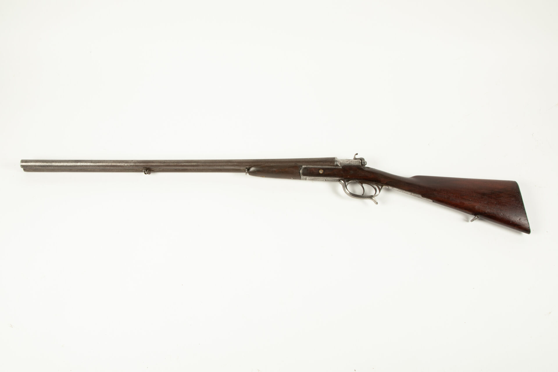 Joli petit fusil basculant à système primitif, calibre 16/65, canon en damas frisé (piqures) de 680 mm de long portant un marquage en cursives gravé « E. Lefaucheux 32 rue Notre Dame des Victoires Paris », court devant bois basculant, l’ouverture de l’arme étant commandée par un levier sous le pontet, ce levier, en plus de permettre l’ouverture du fusil, arme également deux percuteurs lancés, crosse anglaise vernie, fracturée au col et réparée, devant bois remplacé, mécanisme fonctionnel. Les deux percuteurs lancés portant deux palettes quadrillées, on peut aussi, par leur entremise armer et désarmer le fusil manuellement. Mécanisme fonctionnel.