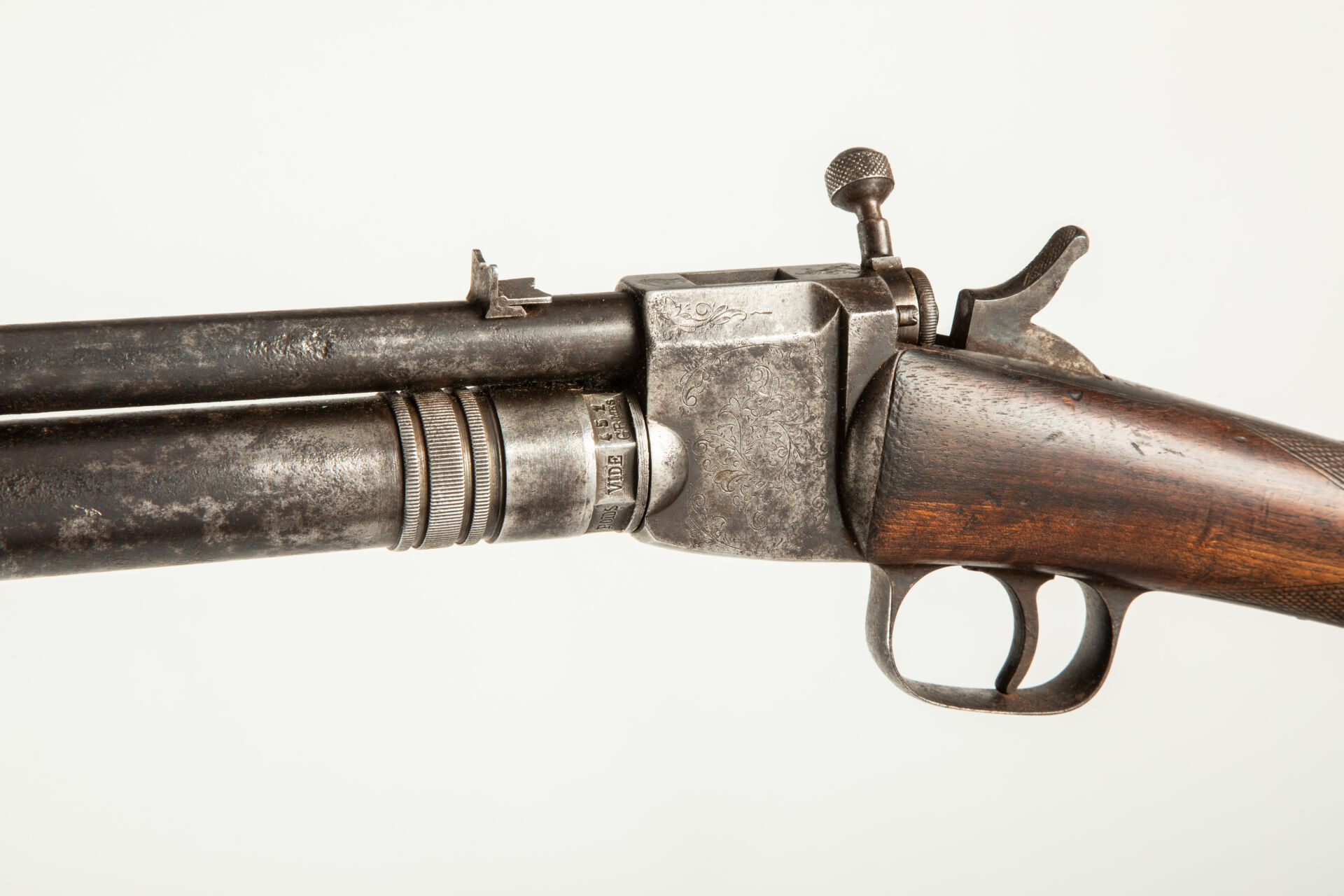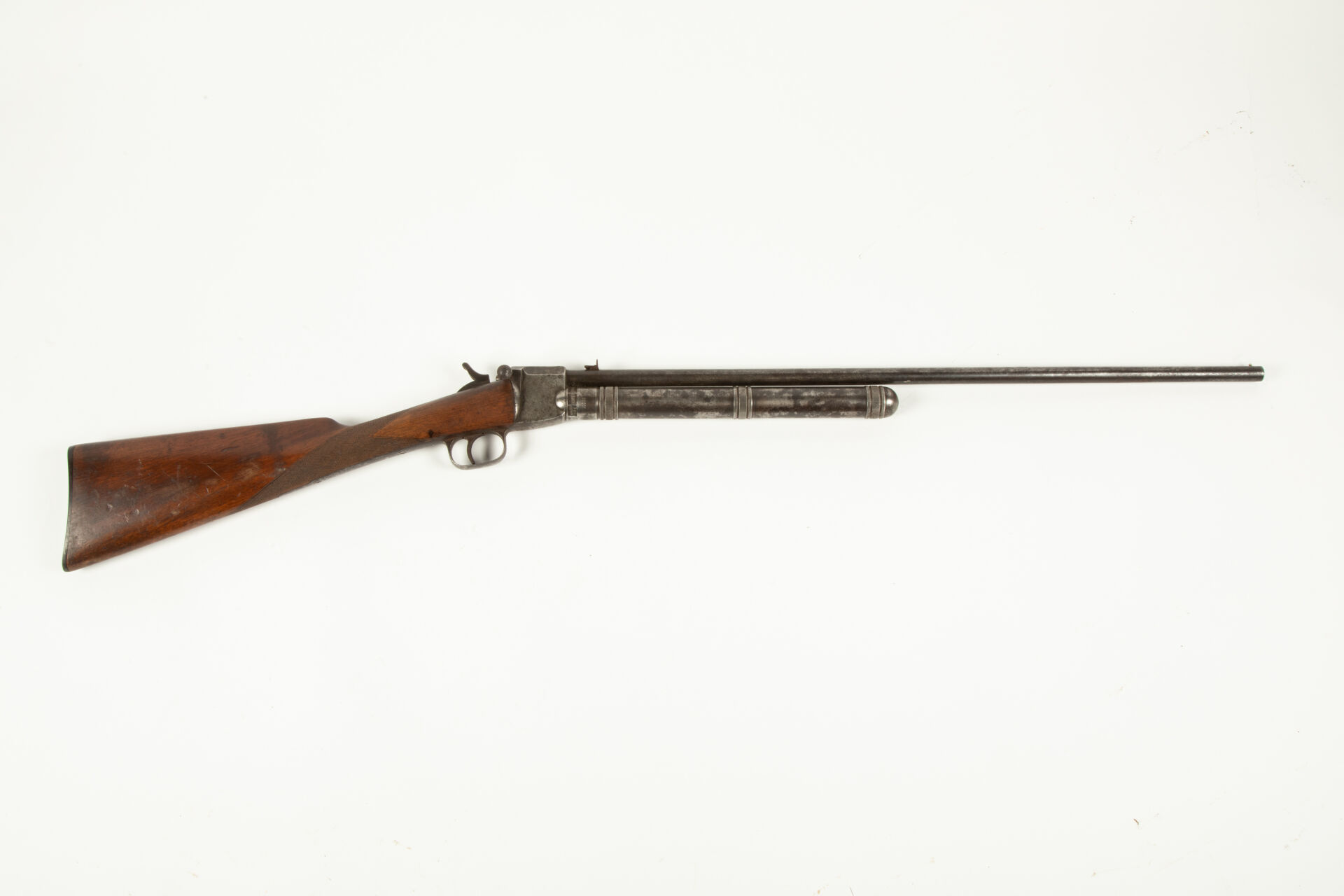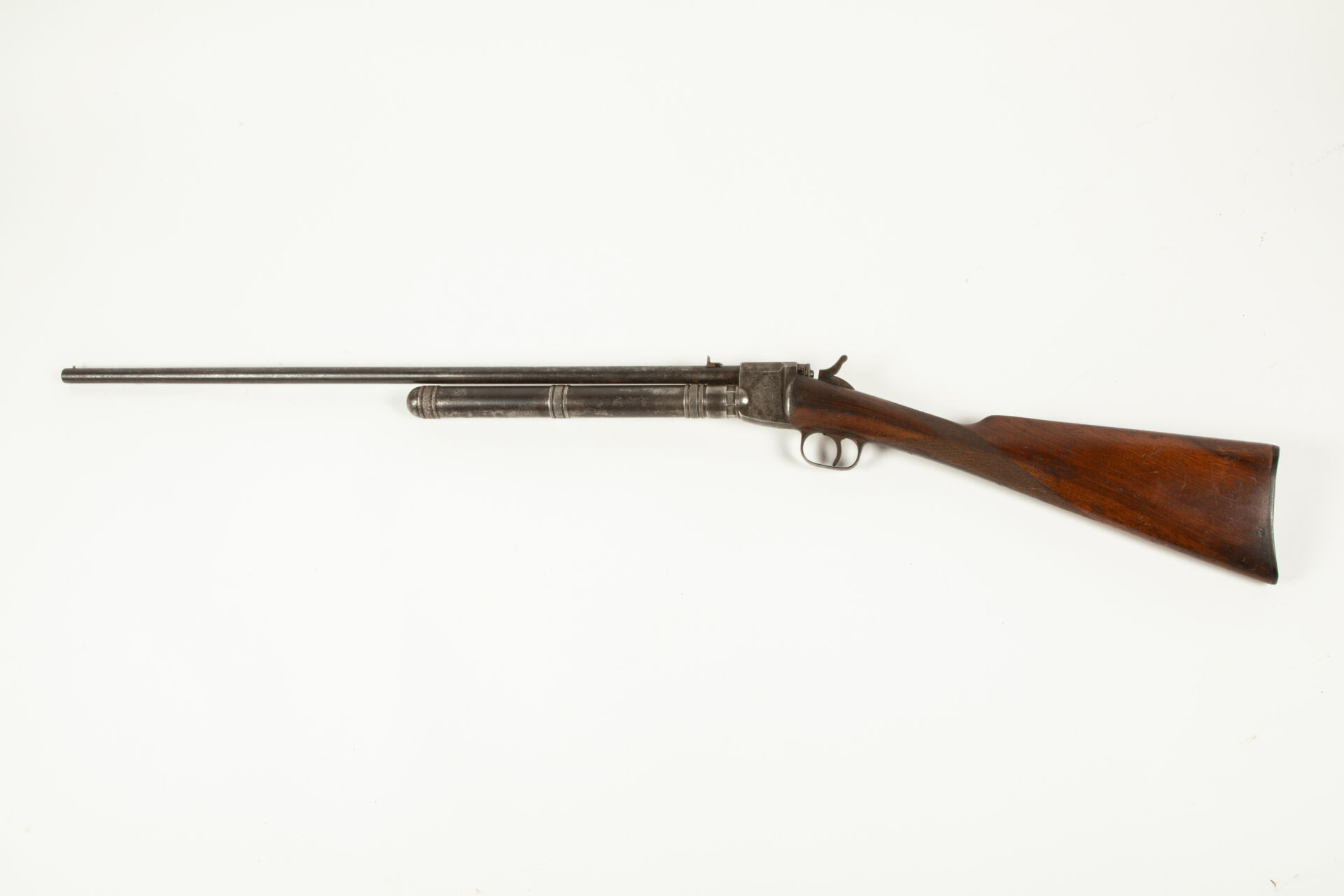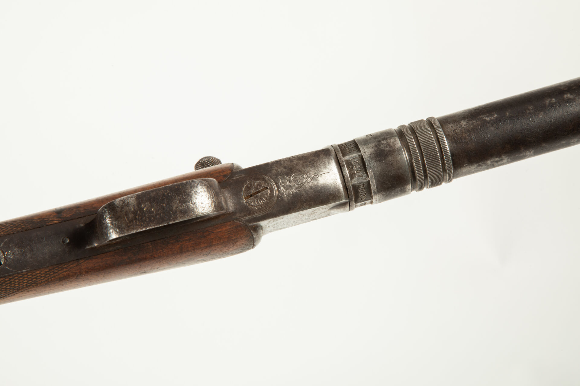 Carabine à gaz liquéfié Carbona Giffard, calibre 8 mm, canon rond portant le marquage en lettres dorées « Société Stéphanoise d’Armes Saint Etienne », tonnerre à la montgolfière, crosse anglaise, plaque de couche marquée « Paul Giffard inventeur » et à décor de la montgolfière de la marque, boitier portant des gravures florales, hausse rabattable à deux volets, quelques piqures, avec sa cartouche de gaz présente sous le canon.