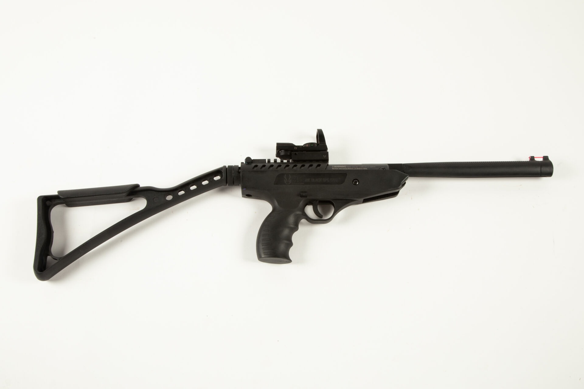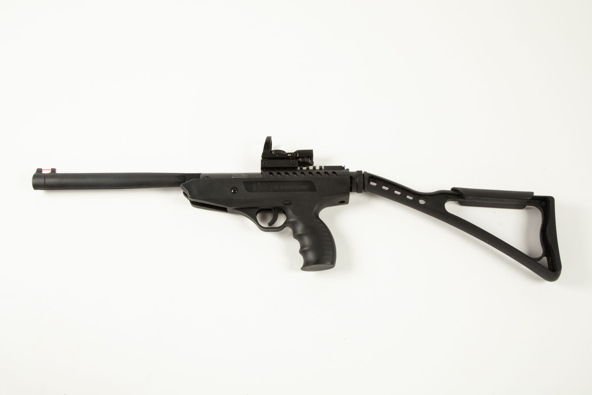 Pistolet à air comprimé basculant calibre 477 (4.5) modèle Langley, hausse et guidon fluo, rail picatiny, visée tête haute point rouge, crosse squelette en polymère amovible, compression non testée.
