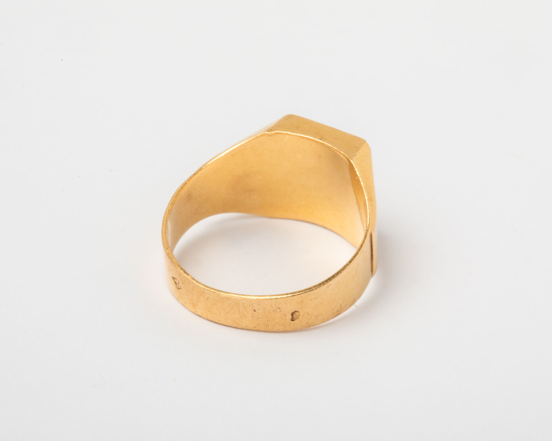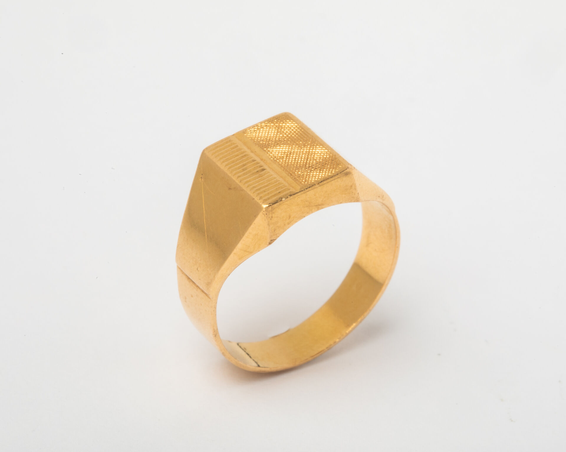 11 ESTIMATION: 150 / 180 € Chevalière en or jaune (750 millièmes) à décor partiellement guilloché TDD : 55 Poids : 3.6 g.