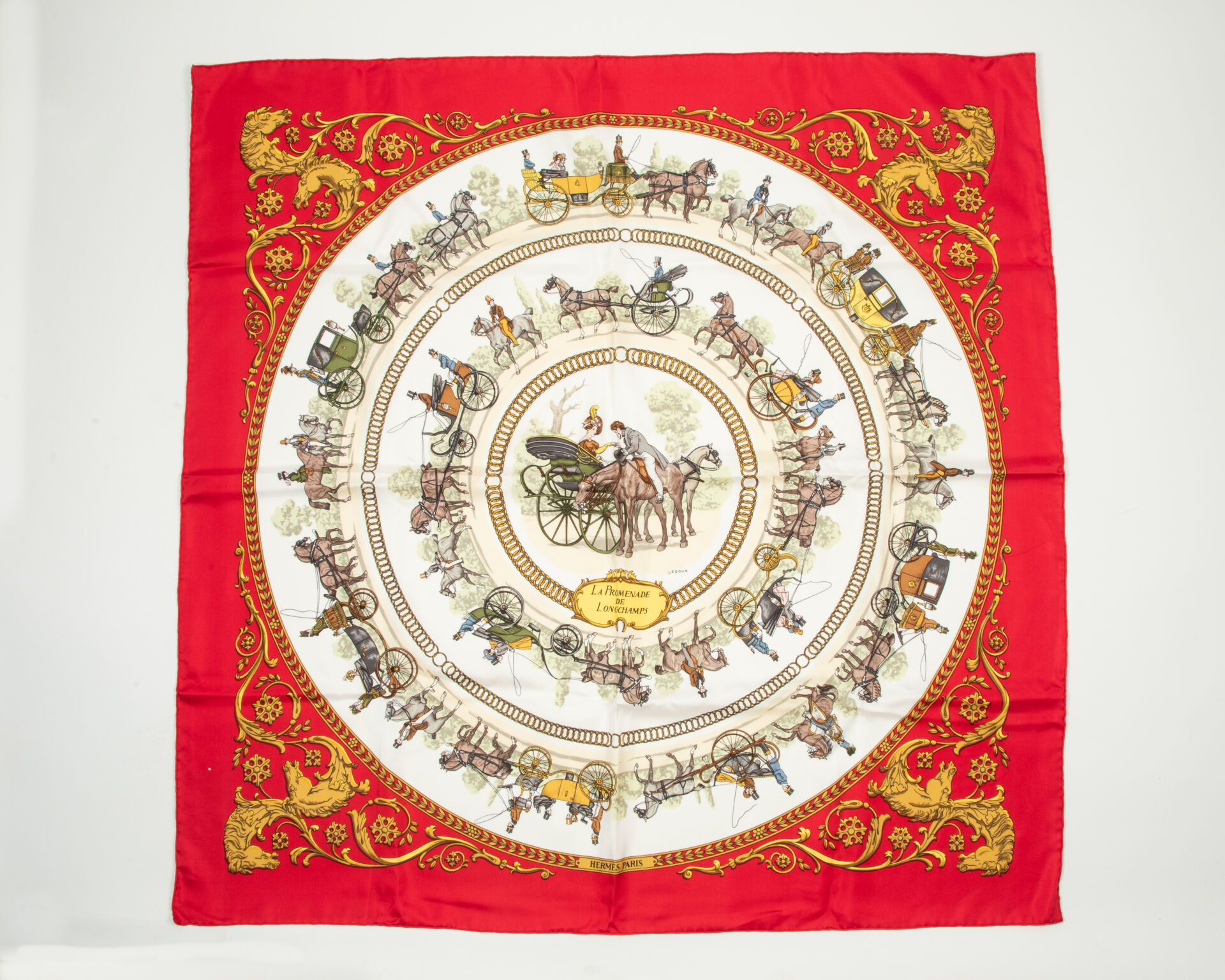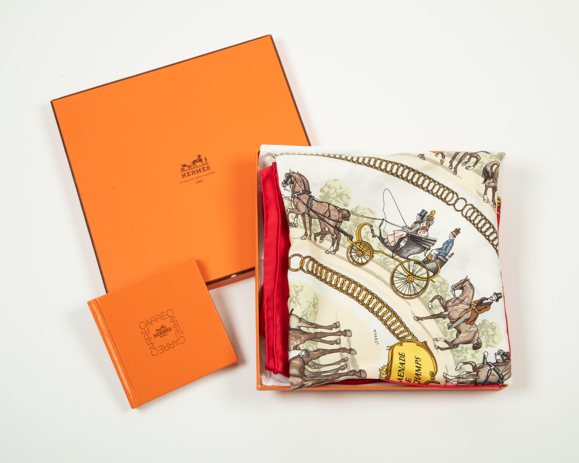 111 ESTIMATION: 80 / 120 € HERMES, Paris Modèle La promenade de Longchamps, carré en soie à décor de chevaux et calèches et liseré rouge, Petites tâches Dans sa boite